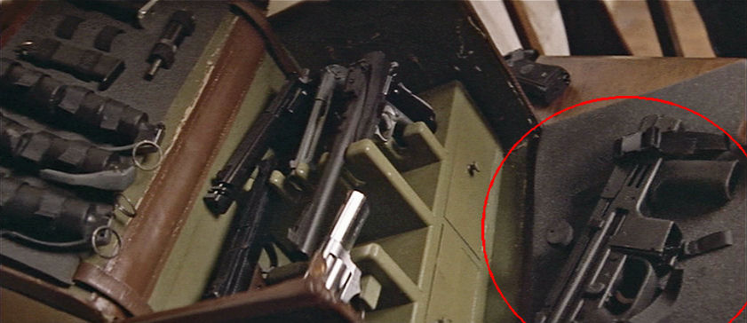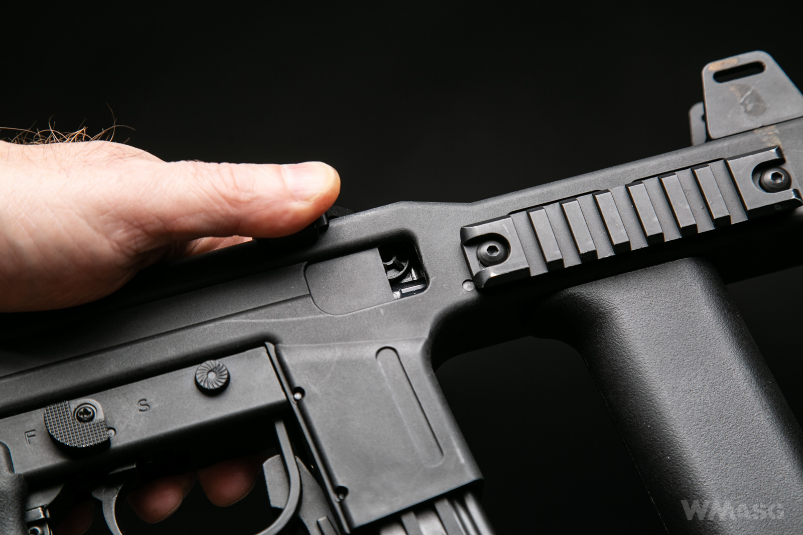 Podobnie jak na przykład w Uzi dźwignia umieszczona jest na górze korpusu.