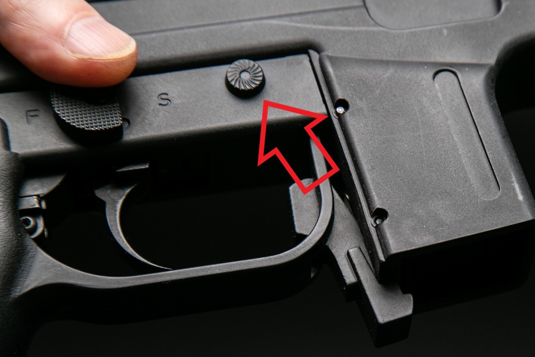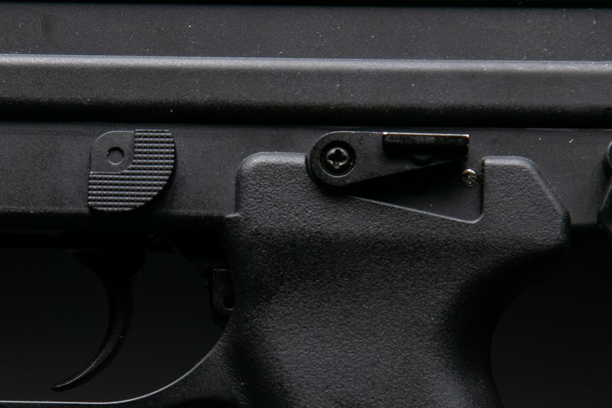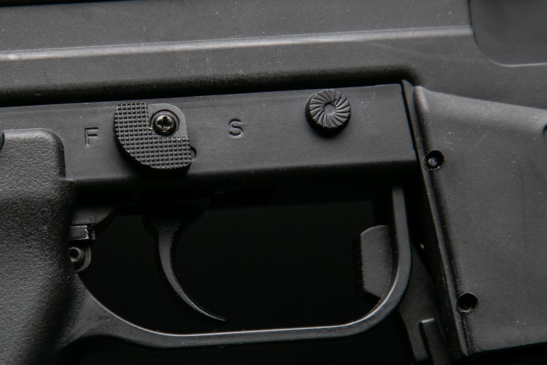 Kolejne skrzydełko to przełącznik rodzaju ognia. Tutaj odwrotnie niż w przypadku bezpiecznika po prawej stronie jest wyłącznie nieruchoma atrapa.