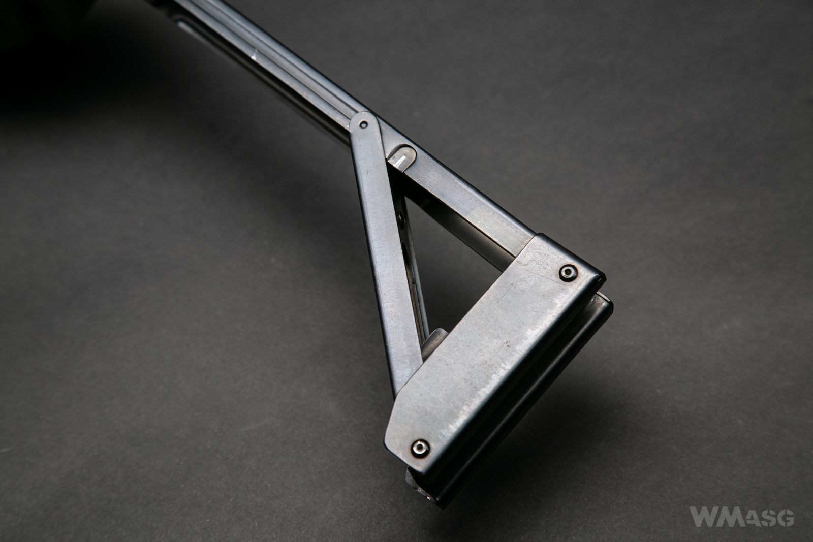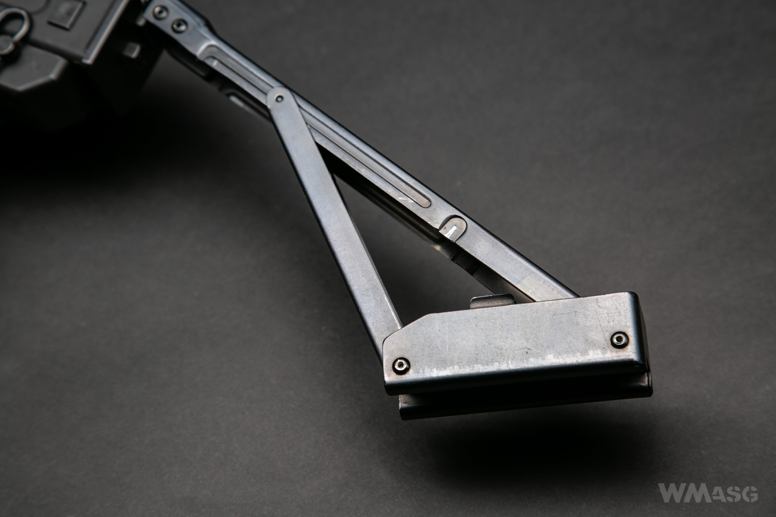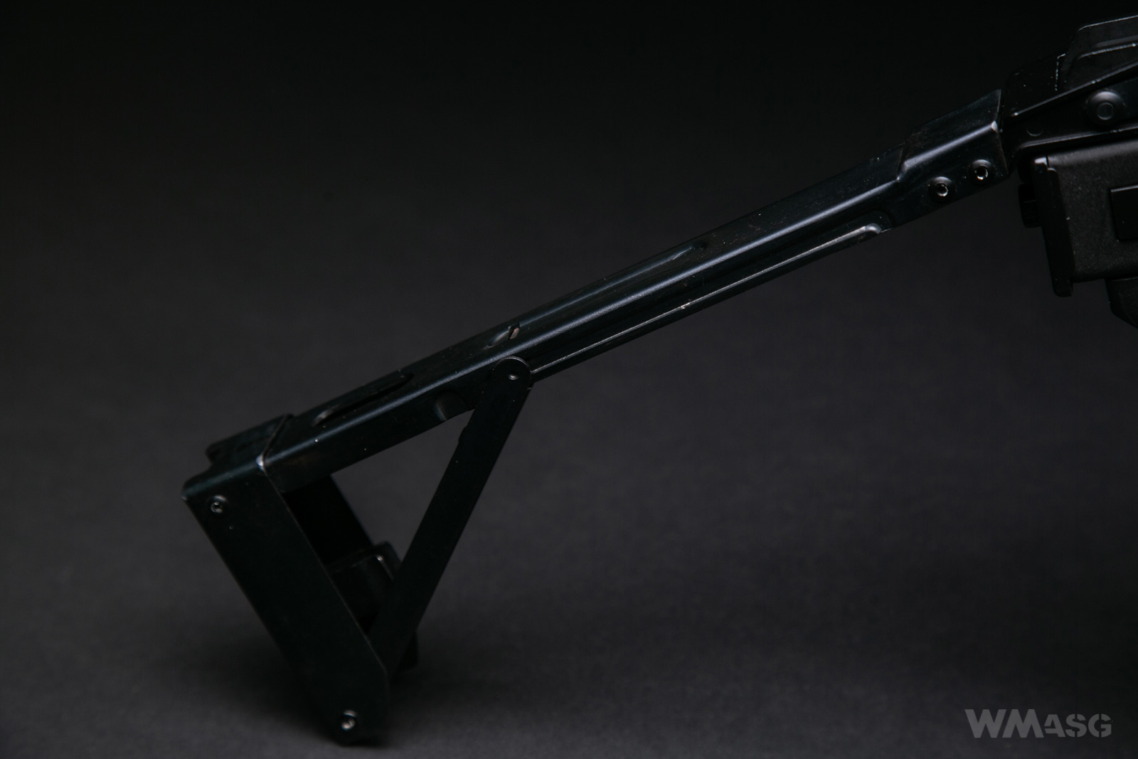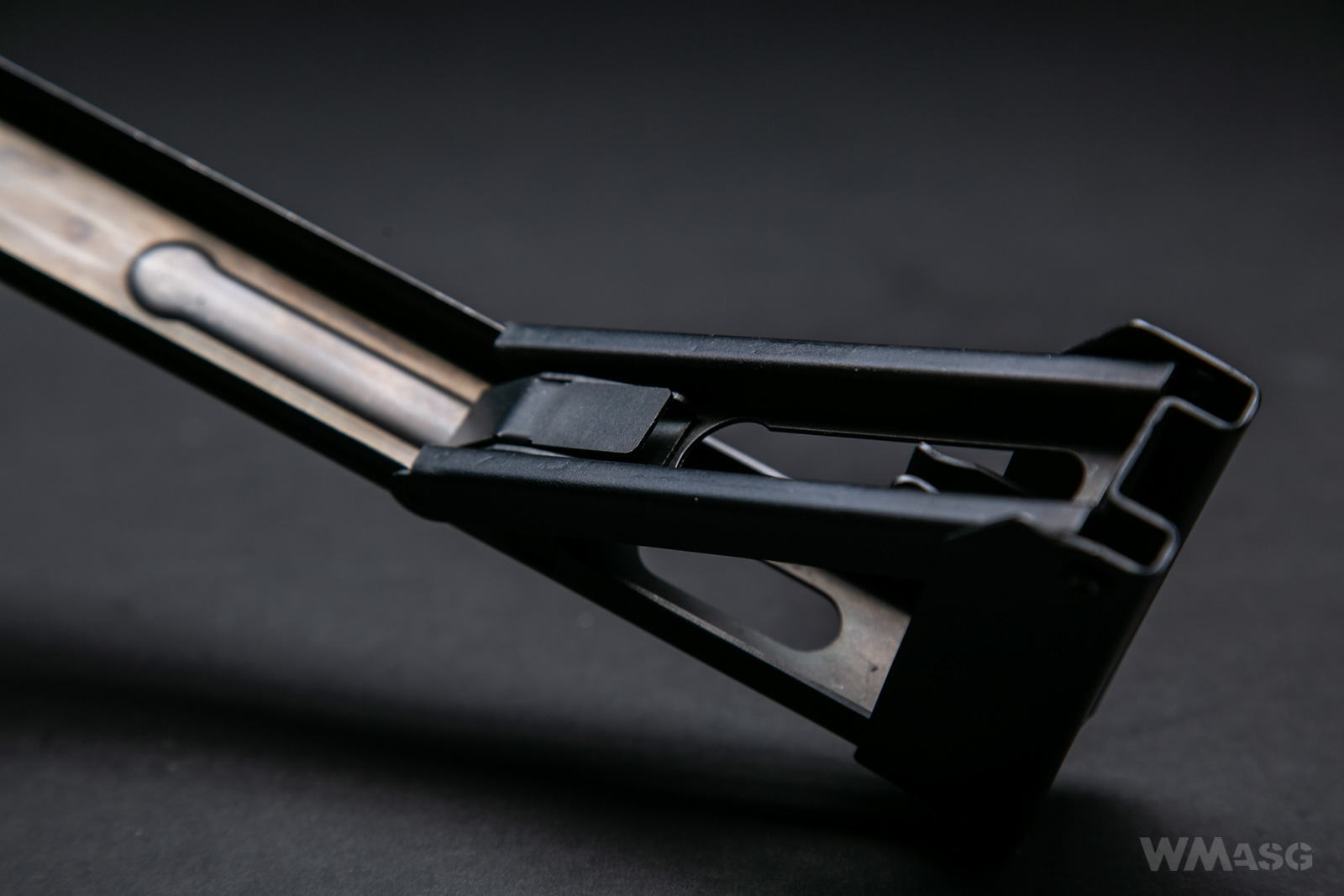 Drugim mankamentem kolby jest jej mocowanie w pozycji rozłożonej. Niby są tu dwa osadzone na sprężynach kołki, które powinny wskoczyć w gniazda i unieruchomić kolbę, ale w praktyce to też nie działa - rozłożona kolba po prostu lata jak chce.