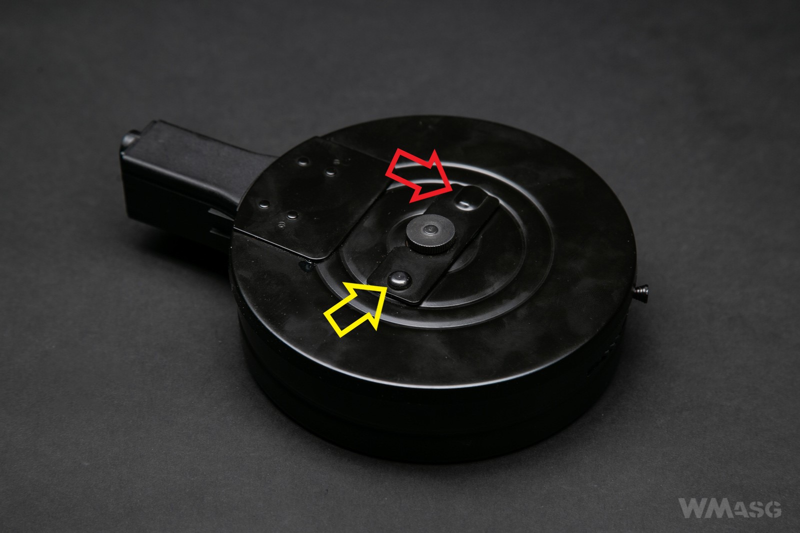 Żeby go napełnić należy zdjąć przednią ściankę. Czerwona strzałka wskazuje miejsce, za które trzeba złapać i kierunek ruchu. Żółta to oś obrotu rygla utrzymującego ściankę magazynka na miejscu.