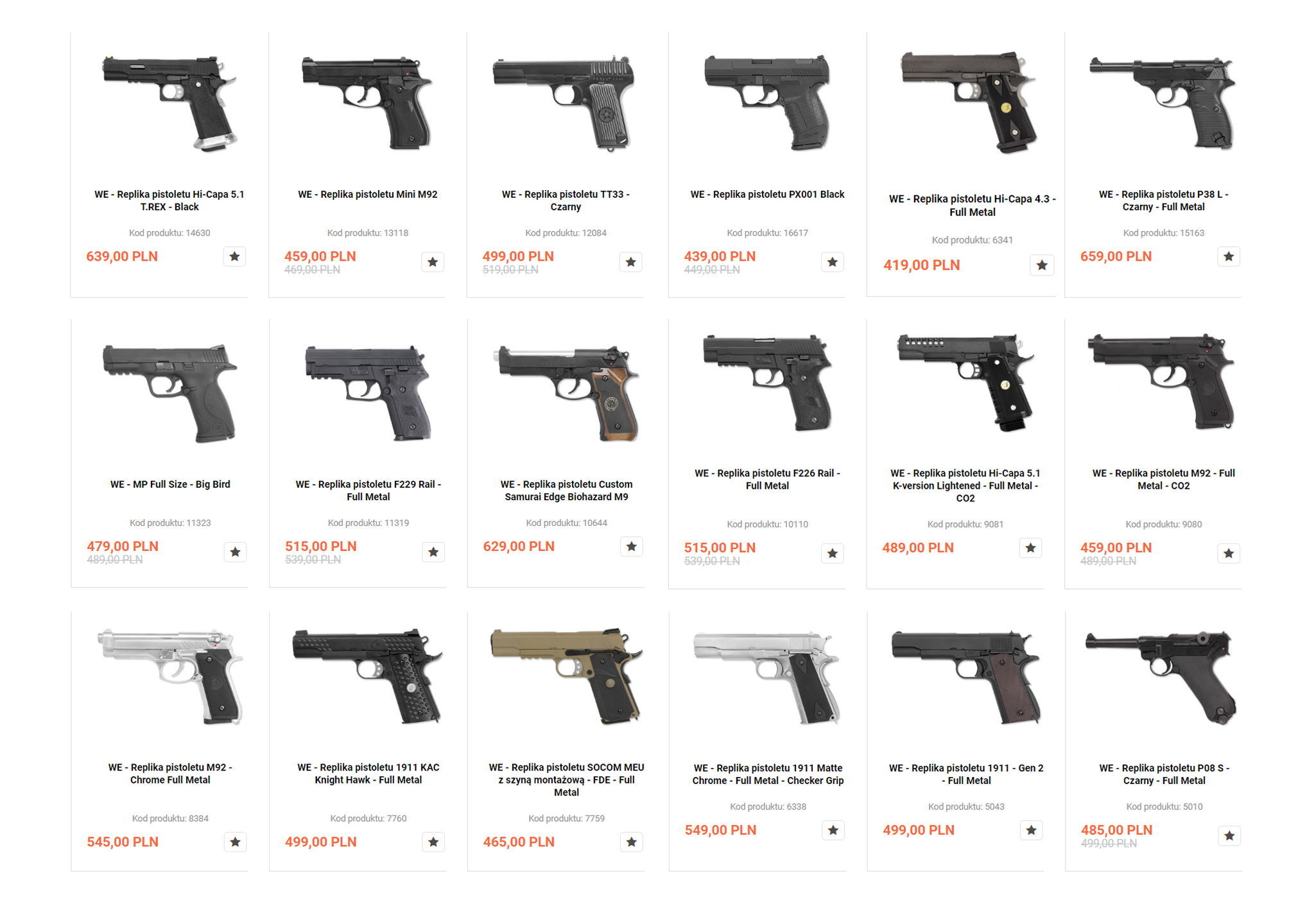Obszerna dostawa produktów renomowanego producenta WE dotarła do magazynów Specshop.pl. Repliki popularnych pistoletów full size: Big Bird F226 oraz F229 w wersjach na green gas, jak i legendarny 1911 zasilany CO2 znakomicie sprawdzą się jako wydajna broń boczna. Ponadto fanów serii Resident Evil ucieszy powrót modelu M9 Samurai Edge Biohazard. Posiadacze replik natomiast będą mogli skorzystać z części zamiennych do najbardziej popularnych modeli między innymi 1911, 92F, Hi-Capa czy klasycznego P 08.