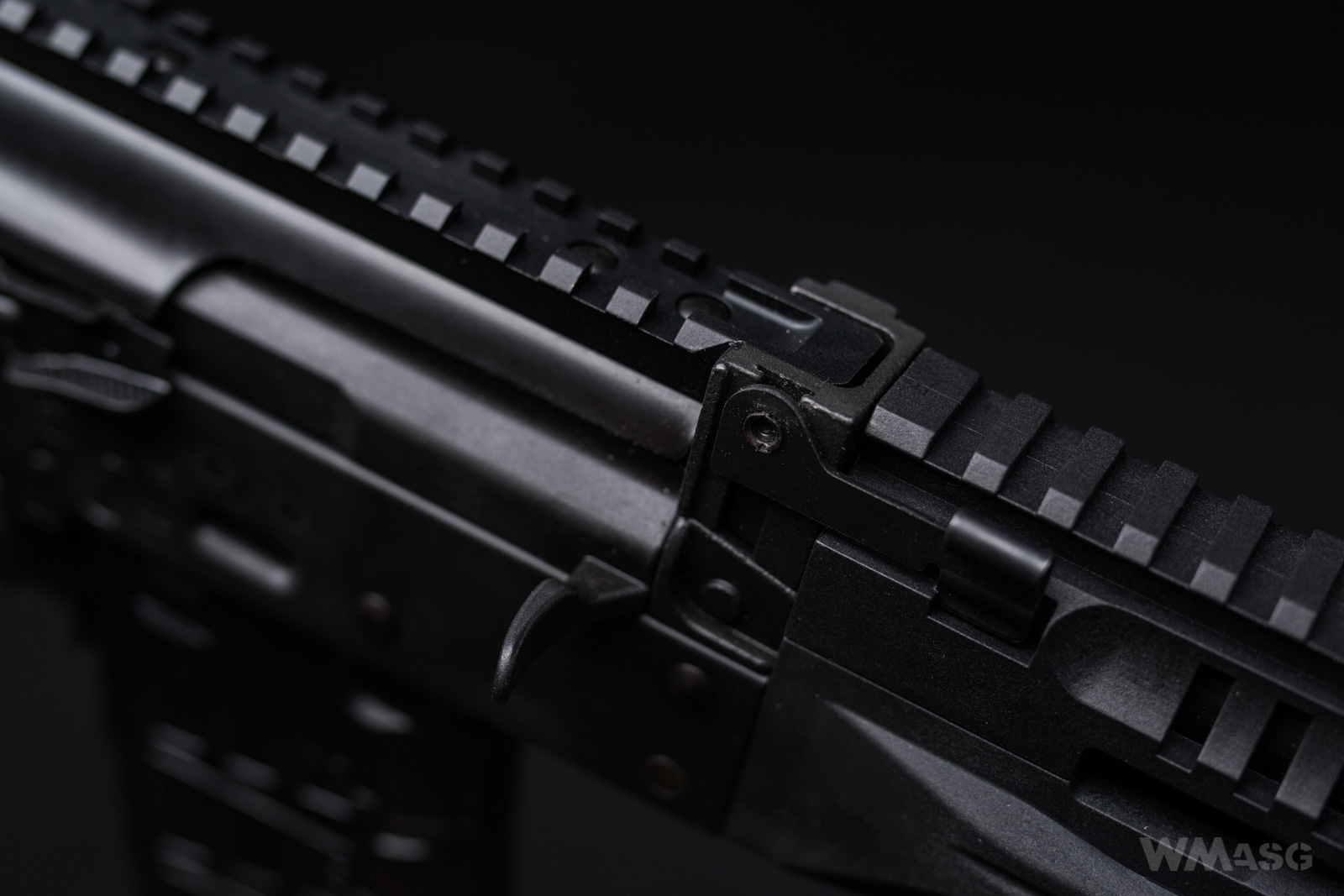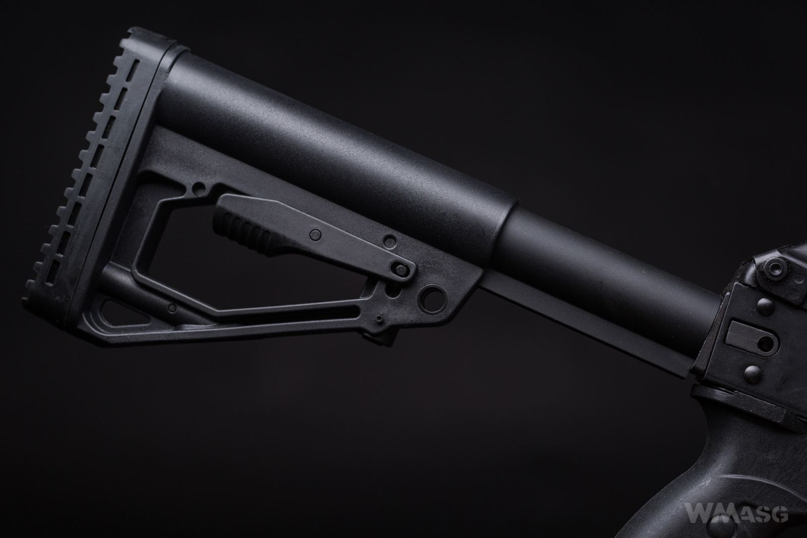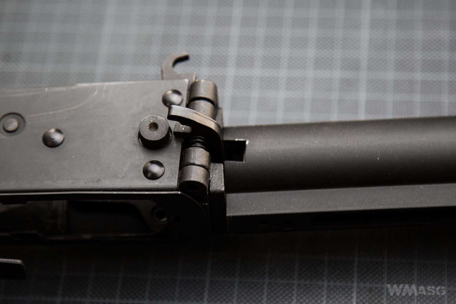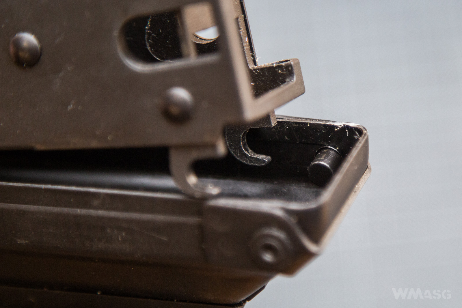 AK-12 nie ma "pazurka" blokującego złożoną kolbą w karabinkach AK-74S, AK-74M czy AKS-74U. Blokowanie kolby rozwiązano w odmienny sposób. Nie wiem jak to działa w oryginale. W replice średnio mi się podoba, ale chyba można to będzie poprawić we własnym zakresie.