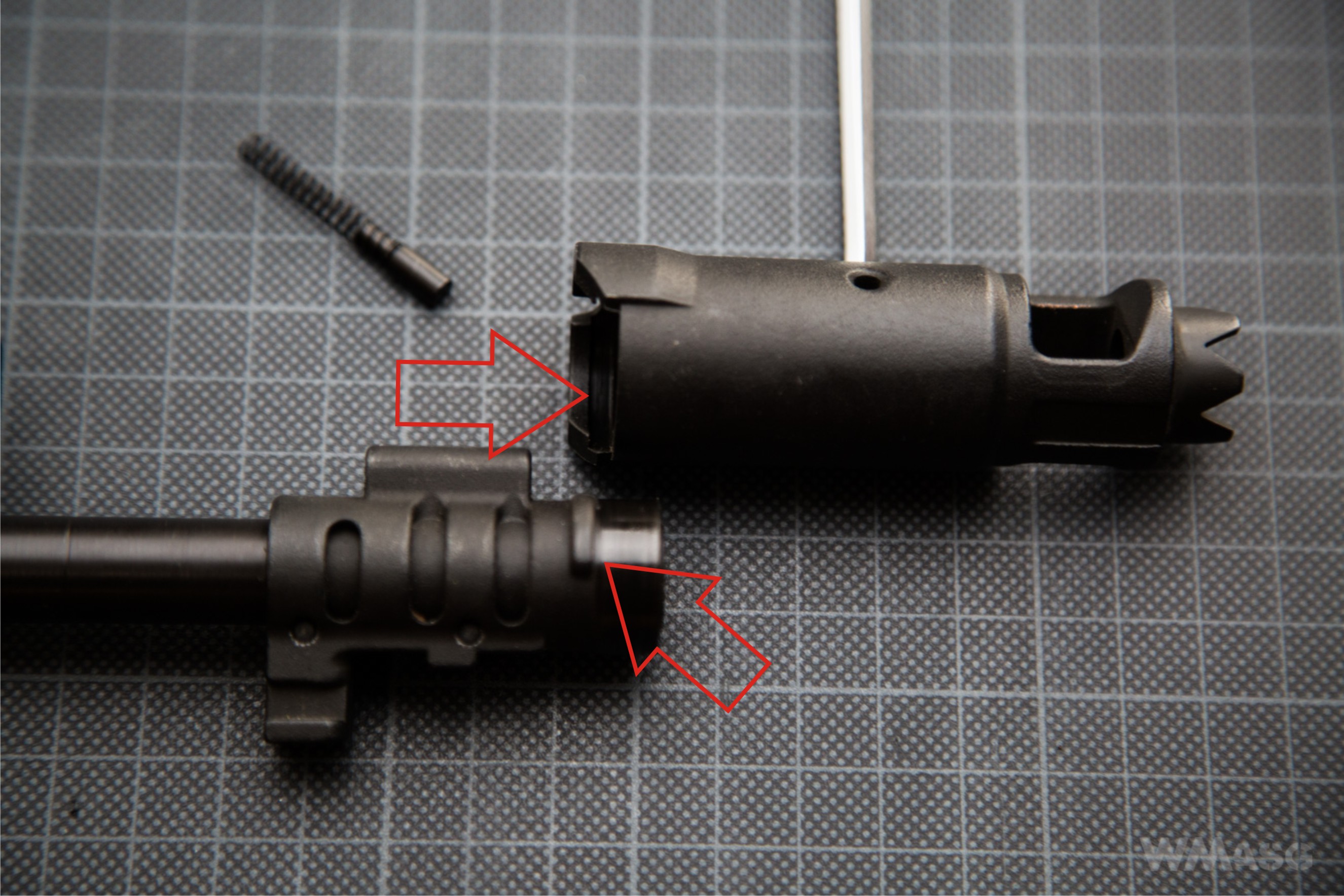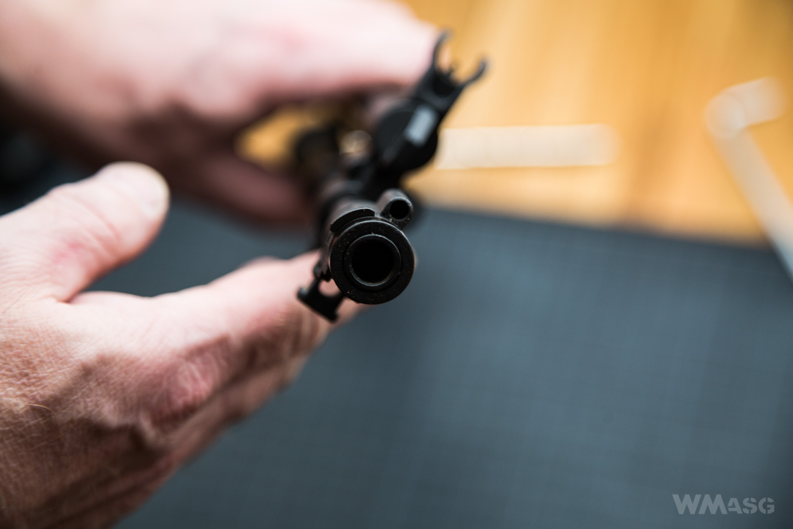 Zaczynając od przodu. Urządzenie wylotowe przypomina nieco kształtem to znane z AK-74, ale tylko trochę. Zasadniczo różny jest sposób montażu. Nie ma tu żadnego gwintu. Po wciśnięciu kołka zabezpieczającego należy obrócić "gwizdek" o ćwierć obrotu (odryglować) i można zsunąć w kierunku wylotu lufy. Nie ma gwintu - nie ma airsoftowych tłumików dźwięku. Do czasu, aż LCT wprowadzi na rynek atrapę dedykowanego tłumika. Przy okazji - pasowanie jest bardzo ciasne - trzeba się naprawdę mocno przyłożyć.
