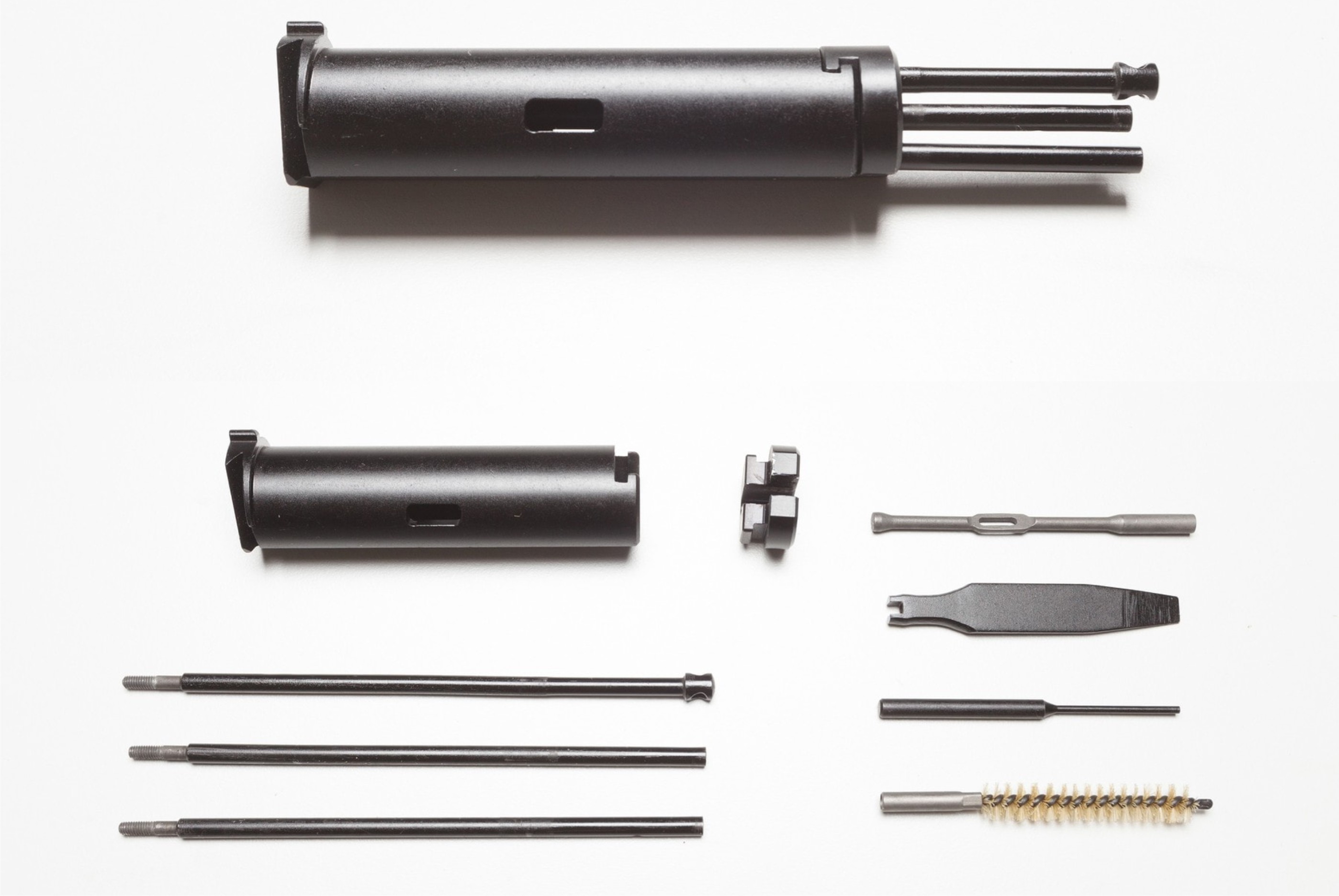 W oryginale w prowadnicy kolby mieści się przybornik ze skręcanym wyciorem oraz kluczykiem do regulacji muszki. W replice nie ma przybornika. Niestety nie umiem powiedzieć, czy zdobyty gdzieś "ostry" zmieściłby się w prowadnicy.