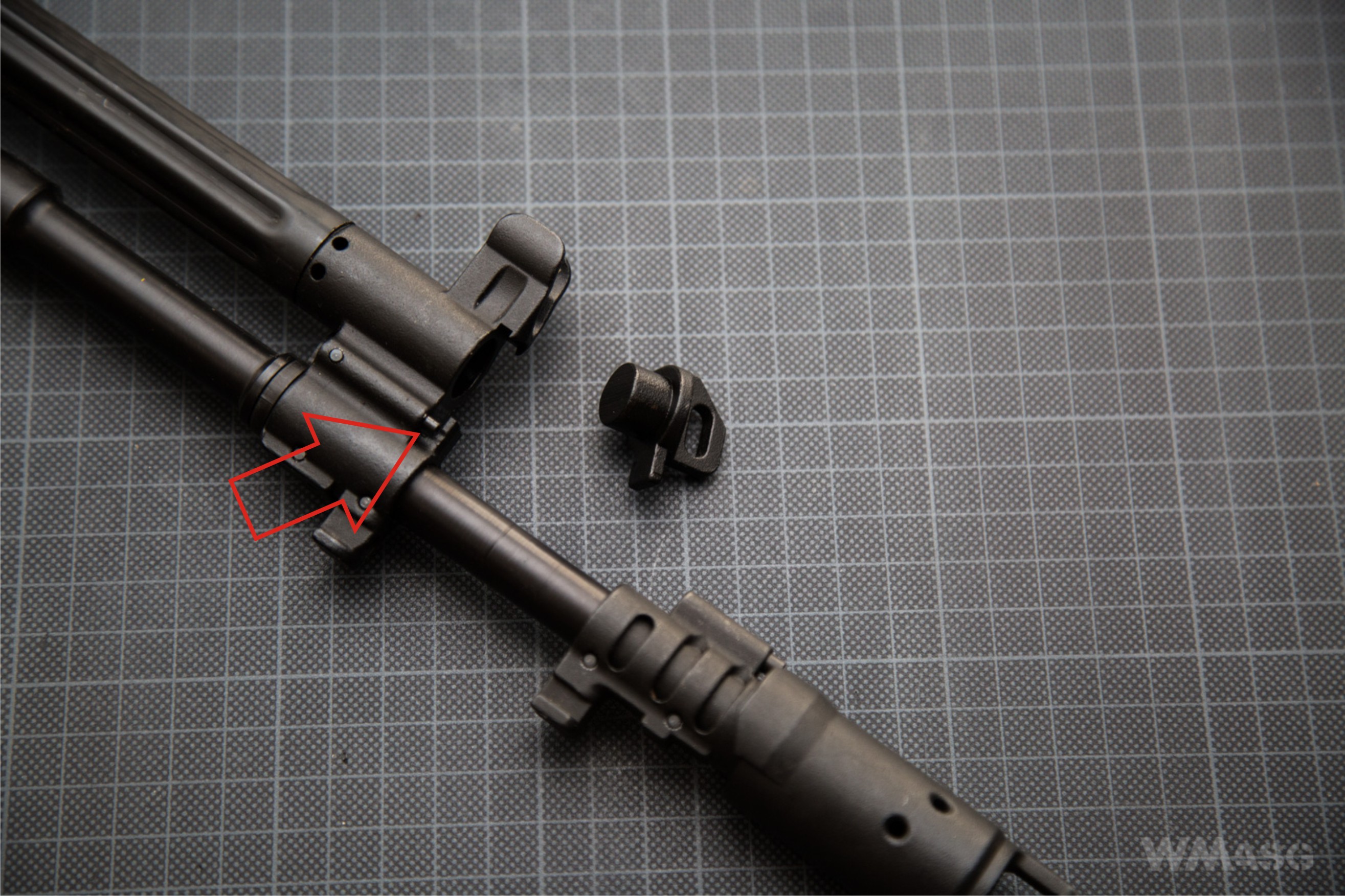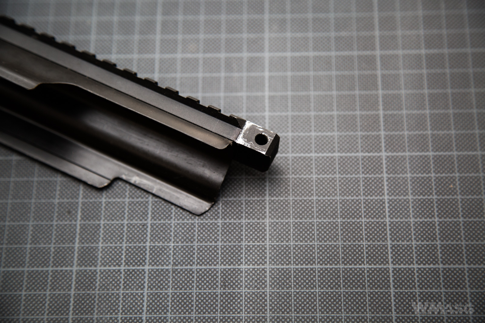 Sposób łączenia nakładki z łożem. Składamy od tyłu w połowie długości i przesuwamy nakładkę do przodu. Oczywiście należy zrobić to na lufie karabinka - zmontowany element nie przejdzie przez urządzenie wylotowe i kolanko gazowe z podstawą muszki.