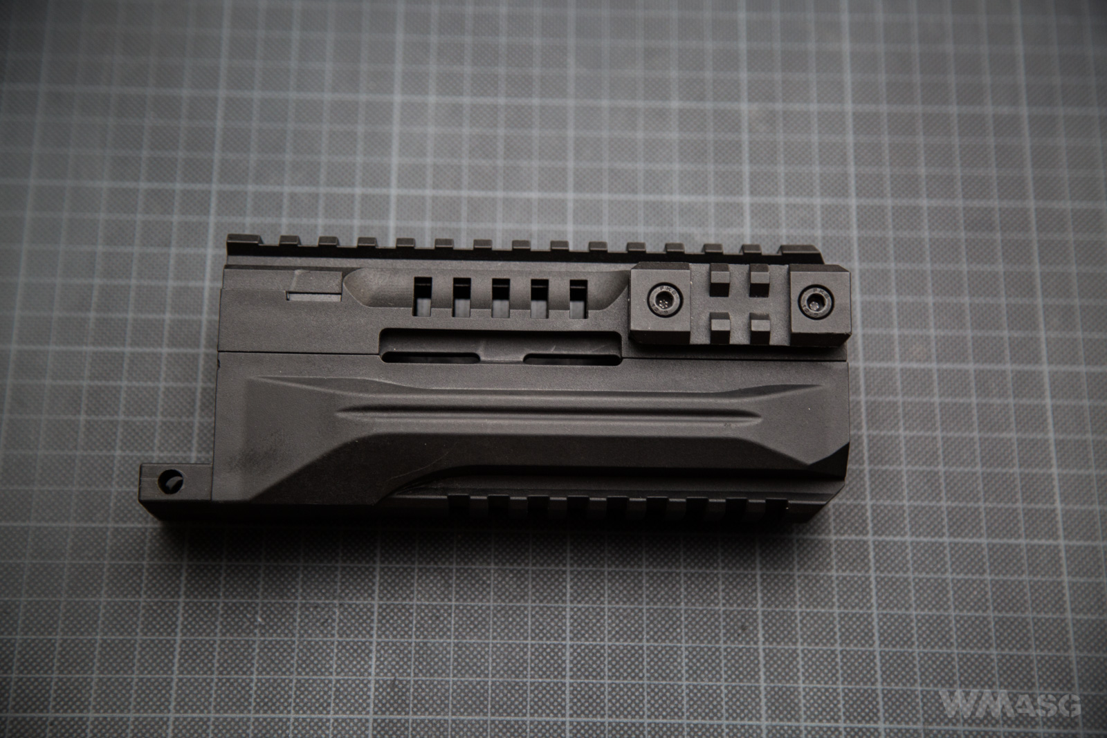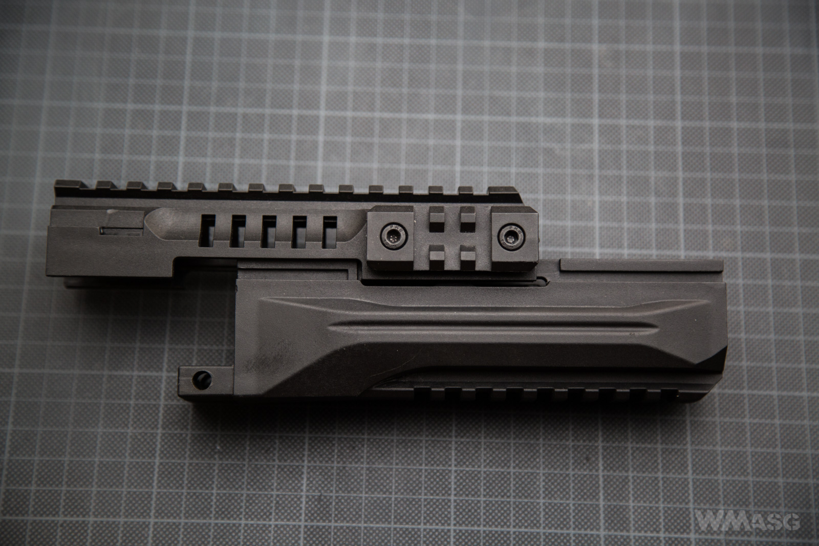 Oba elementy wykonane są z bardzo twardego zbrojonego mikrowłóknami tworzywa sztucznego. Wygląda to tak dobrze, że nie zdziwiłby mnie rzeczywiście wojskowy rodowód tego materiału. Dół łoża uformowany w jedną długą szynę Picatinny. Podobnie z nakładką - górna część jest po prostu szyną. Krótkie boczne szyny są odłączalne, nie ma natomiast możliwości zamontowania ich w innym miejscu.