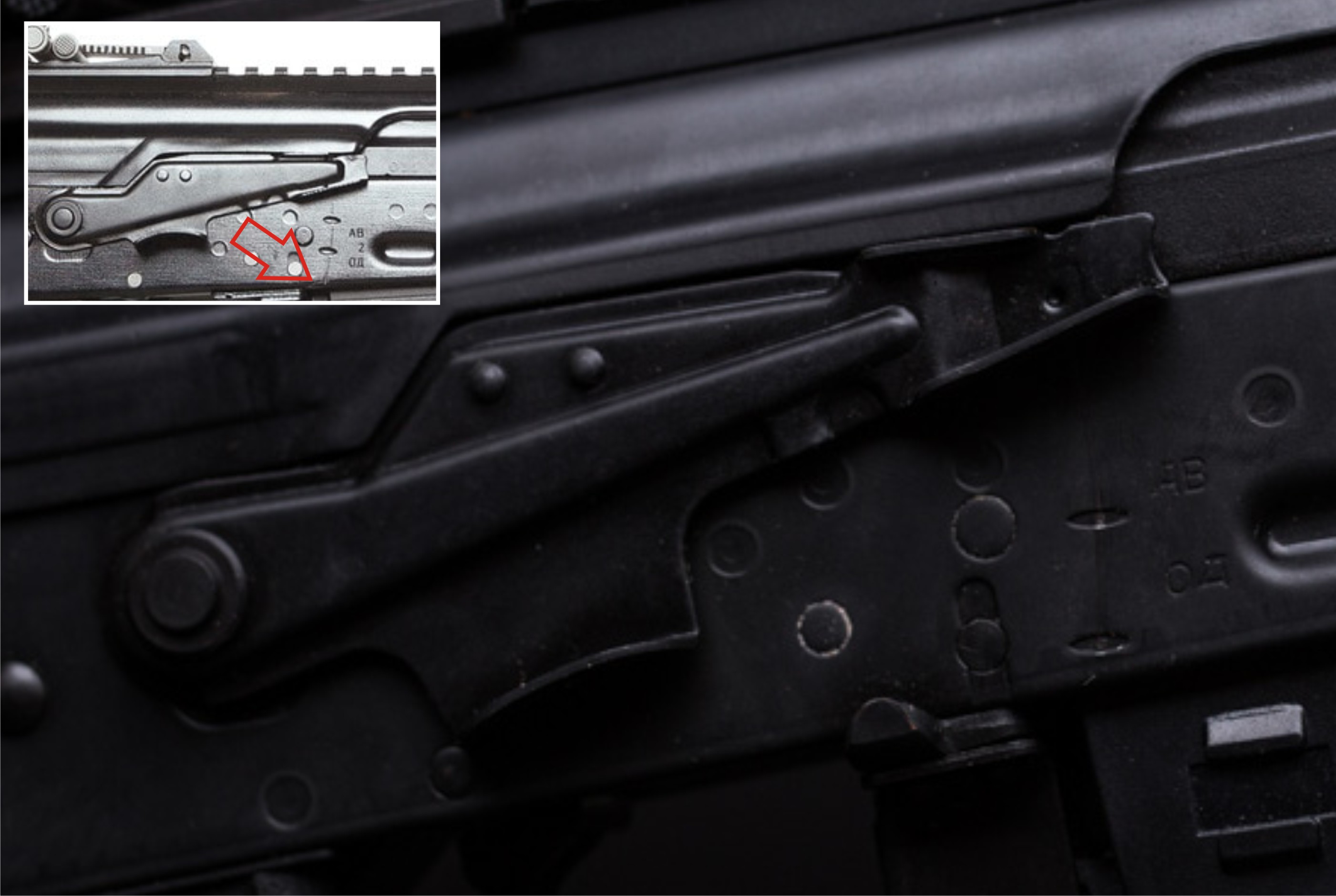Na miniaturce fragment bojowej wersji karabinka. Selektor ma cztery nastawy: zabezpieczony/ciągły/seria trzystrzałowa/pojedynczy (strzałka). Replika, która nie strzela serią po trzy ma tylko trzy nastawy, standardowe dla wcześniejszych wersji AK (zabezpieczony/ciągły/pojedynczy). Szkoda.