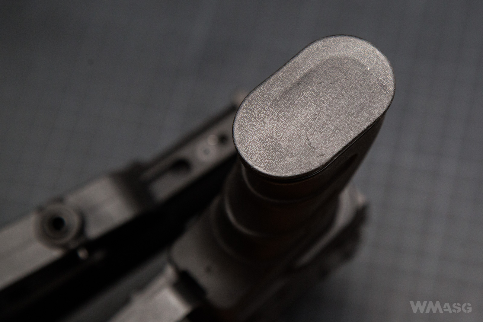 Chwyt repliki wygląda bardzo podobnie. Z oczywistych względów (silnik) to okrągłe, które w bojowym chwycie jest obustronnym przyciskiem służącym do wyjęcia zasobnika w wersji airsoftowej jest jedynie przetłoczeniem.