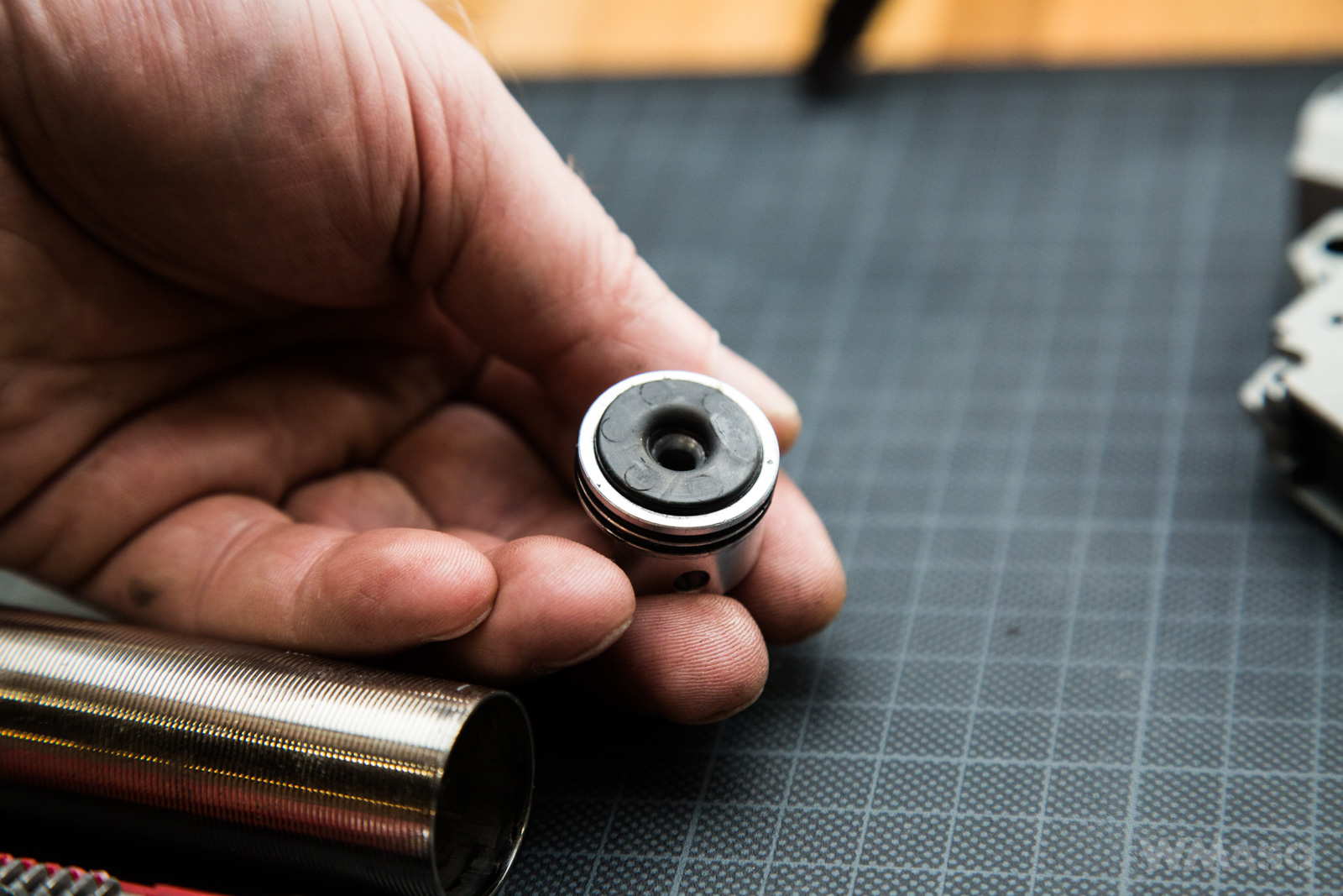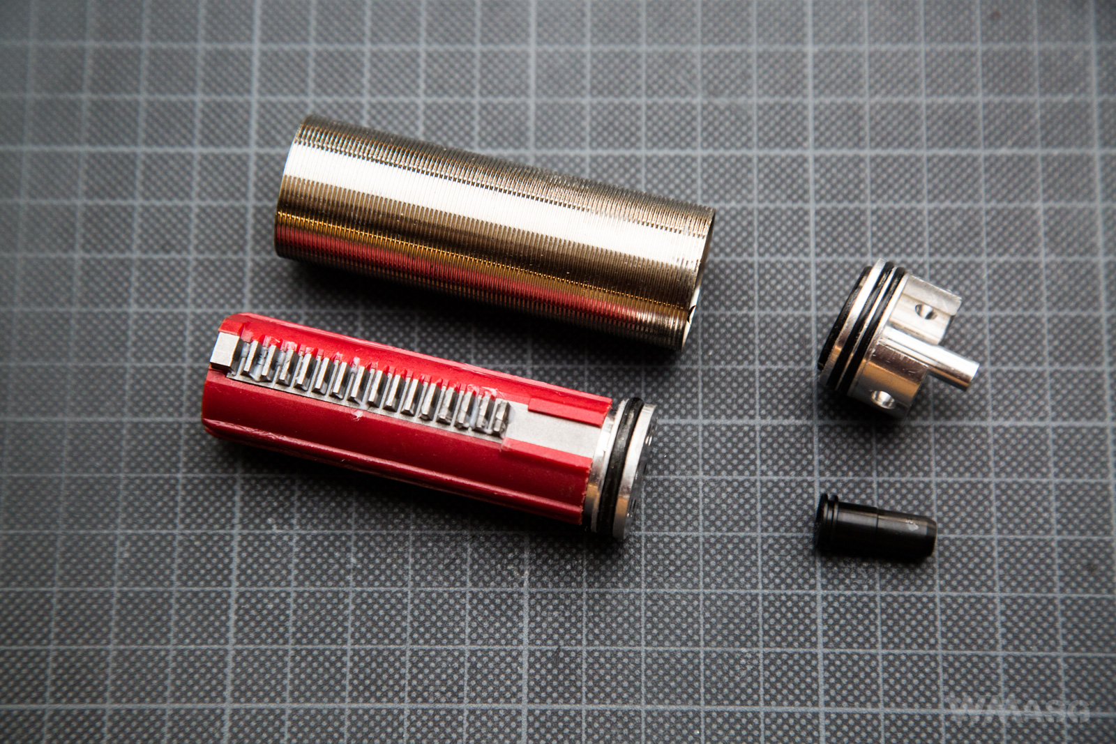 Zespół cylindra. Sam cylinder chromowany. Głowice aluminiowe. Tłokowa łożyskowana z sześcioma otworami. Dysza uszczelniona.