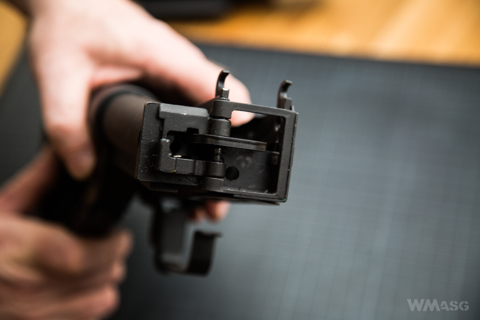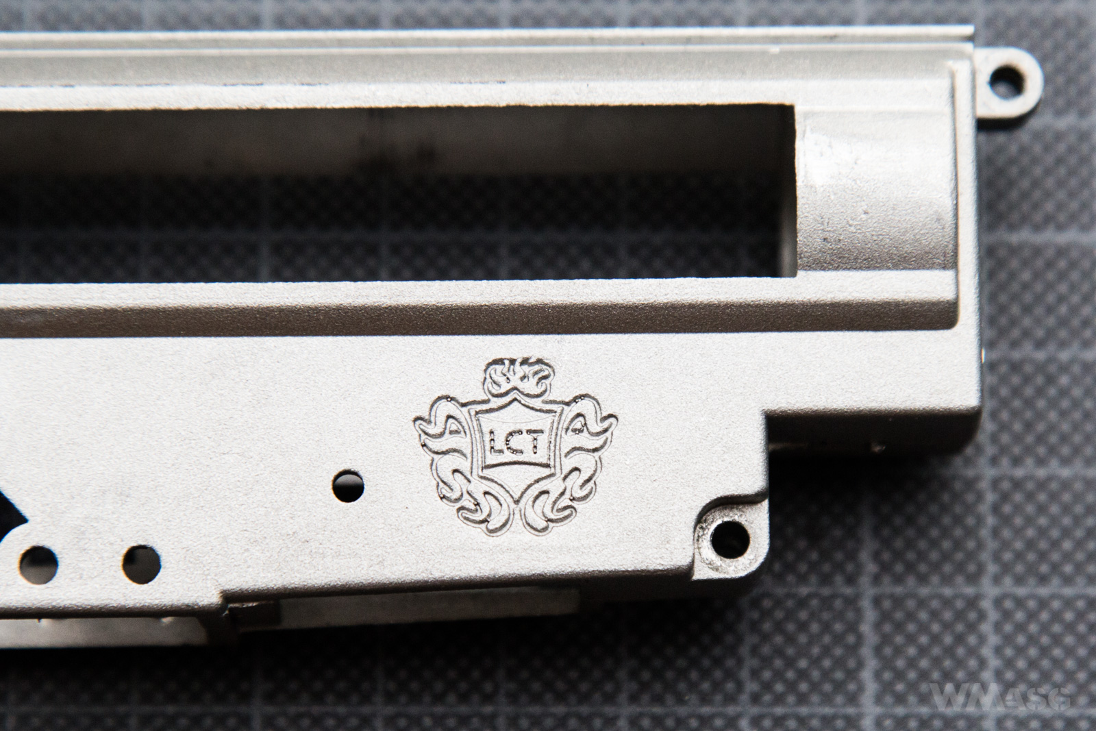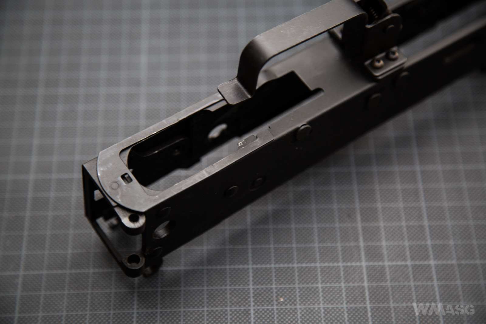 Zakończenie komory. Widoczny mocowanie zawiasu kolby, gniazdo przycisku służącego do jej składania oraz zaczepy mocujące pokrywę komory.