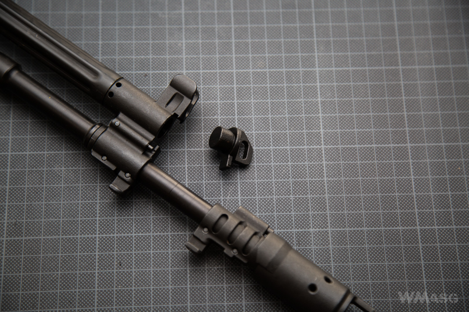 Lufa zewnętrzna r rurą gazową i osprzętem. Mimo zastosowania kilku śrub imbusowych wszystkie połączenia są kołkowane. Magnesy mówią same za siebie. W AK-12/AK-15 żołnierz nie demontuje sam rury gazowej.