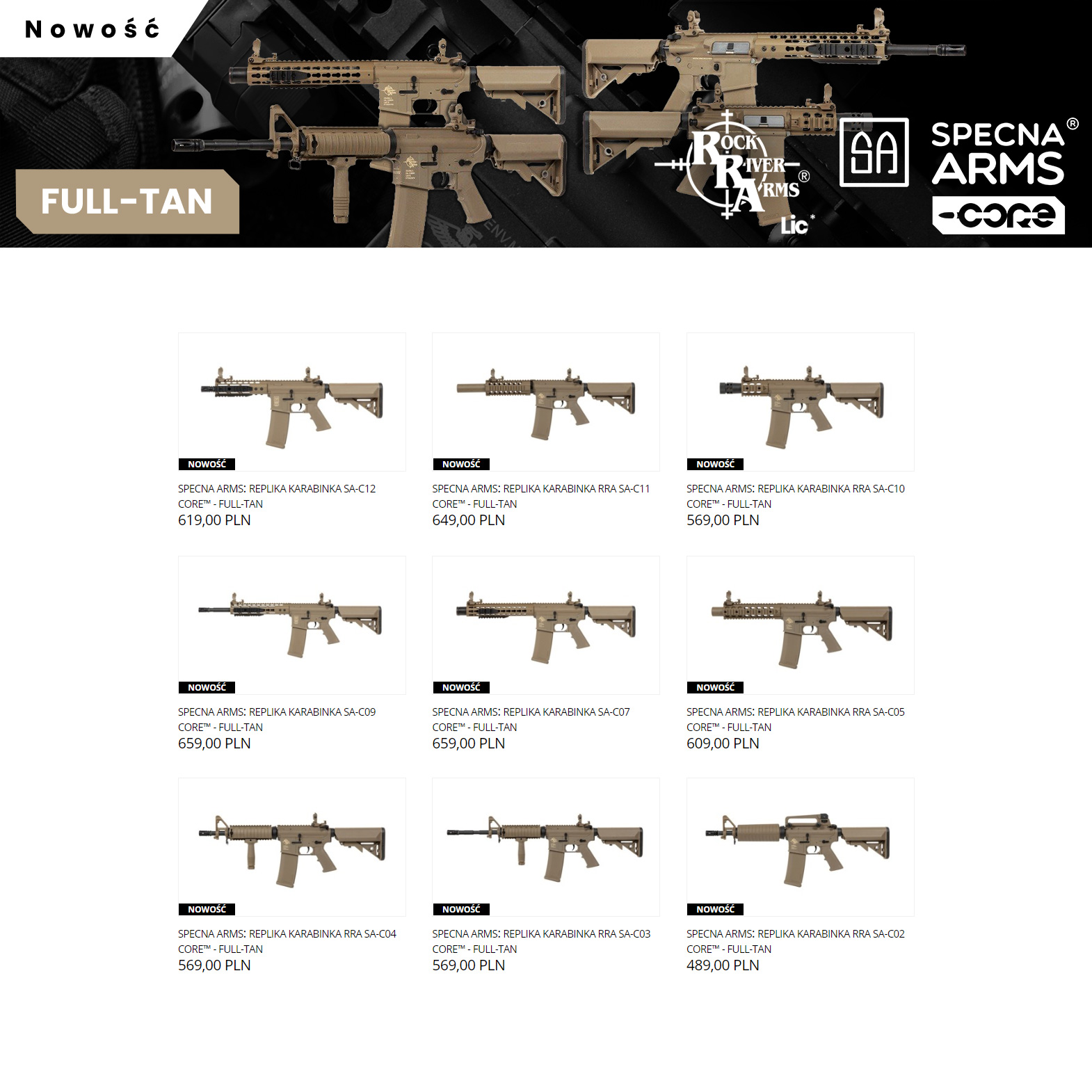 Do oferty właśnie trafiła najnowsza linia replik Specna Arms CORE™ w kolorze Full Tan! Są to znane i lubiane modele karabinków z rodziny AR15, wśród nich znajdziemy również repliki wyprodukowane na licencji amerykańskiego producenta broni palnej Rock River Arms.