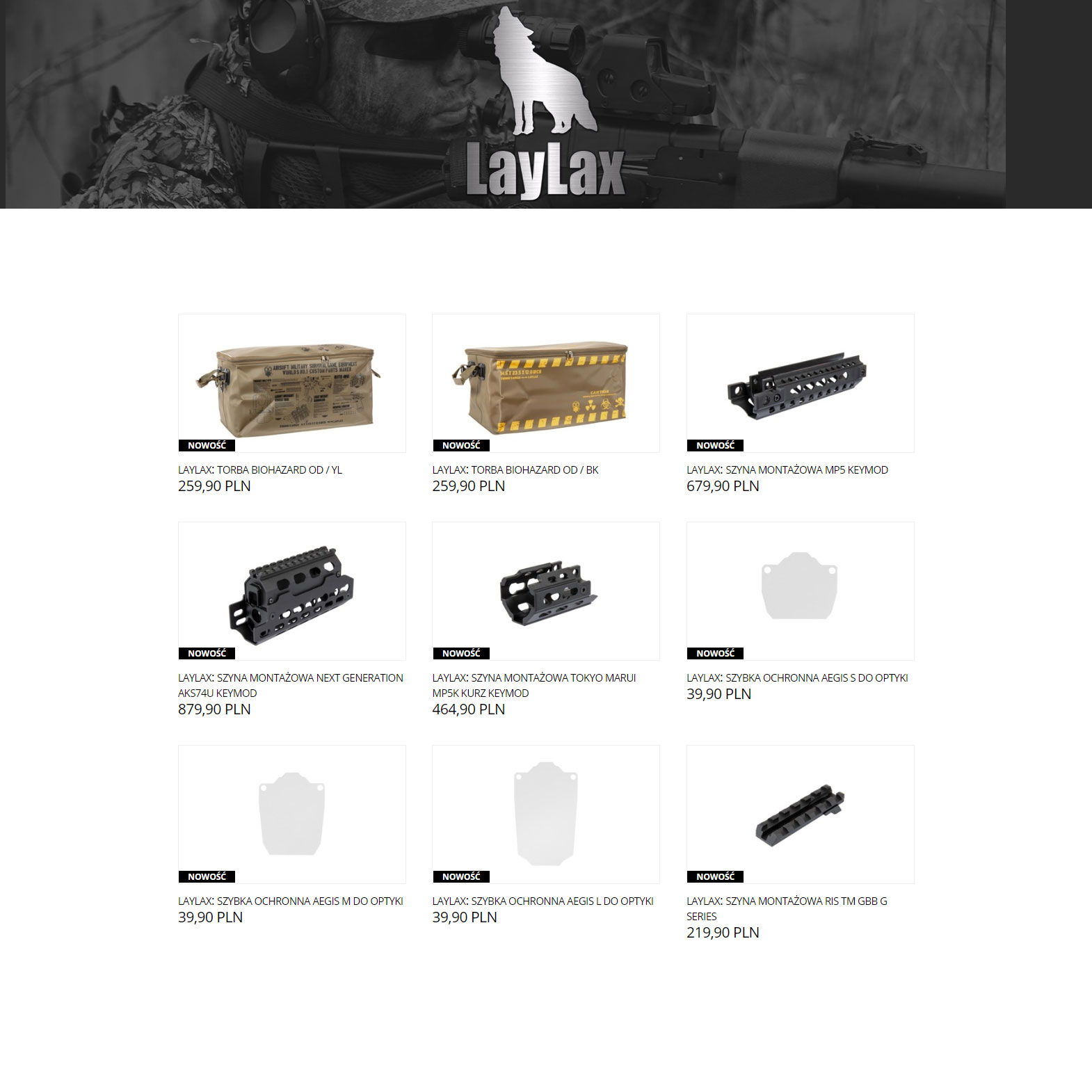 W dostawie produktów japońskiej marki Laylax znaleźć można szereg ciekawych i oryginalnych części do replik. Wśród nich lufy precyzyjne, części do tuningu replik snajperskich, szyny i torby do przenoszenia ekwipunku.