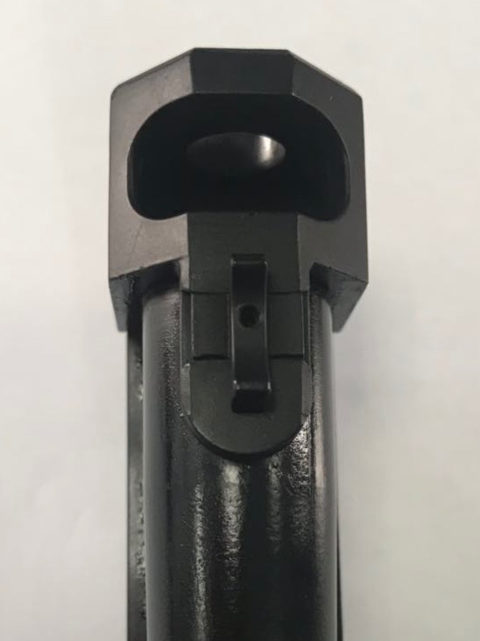 W pierwszej wersji notatki pisaliśmy o 4-calowym zamku i kompensatorze i niestety wprowadziliśmy Was w błąd. Otóż prezentowany prototyp posiada oczywiście metalowy zamek, ale to 4-calowa lufa ma kompensator i światłowodową muszkę (island barrel). Pozostałe cechy, czyli metalowy szkielet, szynę Picatinny oraz chwyt ze stipplingiem i magwel-em podaliśmy poprawnie. Całkowita długość lufy wraz z kompensatorem - 5,1 cala. Za podanie błędnych informacji przepraszamy. Poniżej zdjęcie kompensatora.
