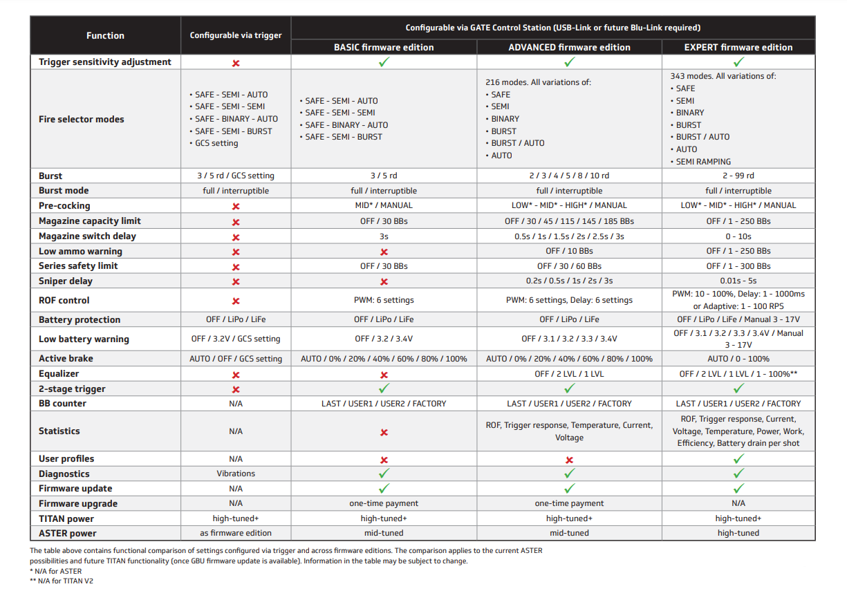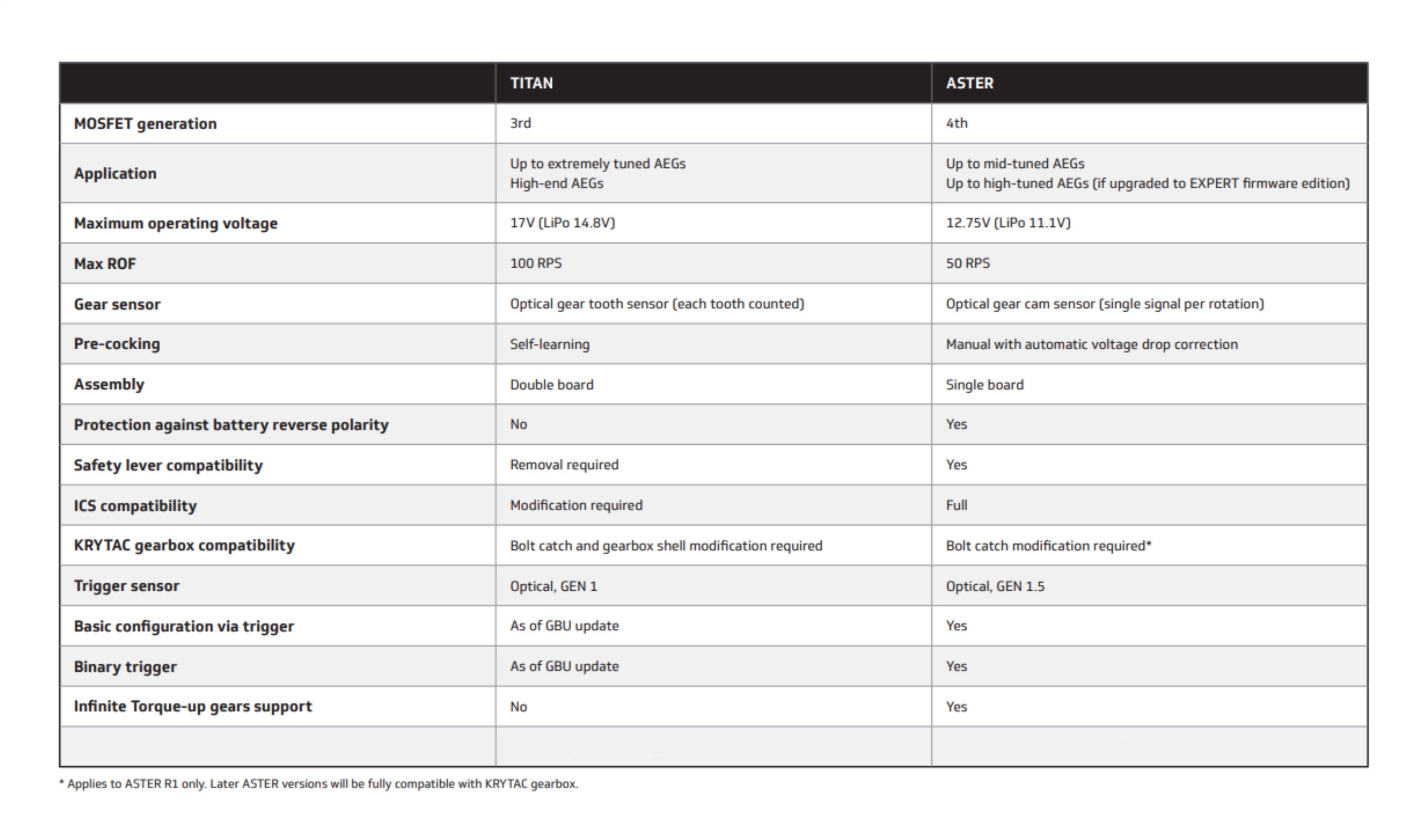 Pierwszy z nich, dedykowany początkowo wyłącznie do gearboxów w wersji 2. to młodszy brat znanego TYTANA. Także w tym układzie Gate zrezygnował z jakichkolwiek mikrowyłączników i innych rozwiązań mechanicznych. Położenie języka spustowego oraz ruch koła tłokowego śledzone są przez czujniki optyczne. Mimo zastosowanie kilku nowocześniejszych rozwiązań ASTER będzie wyraźnie tańszy od TYTANA oferując przy tym podobne możliwości.