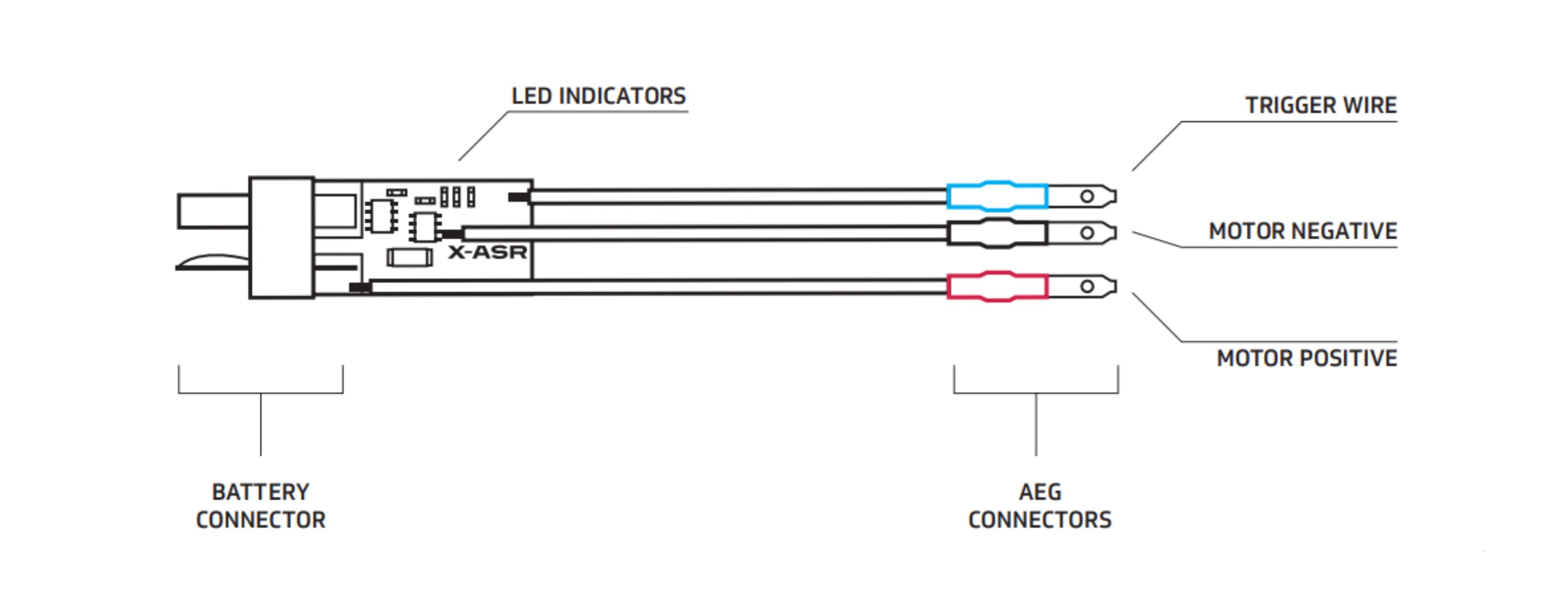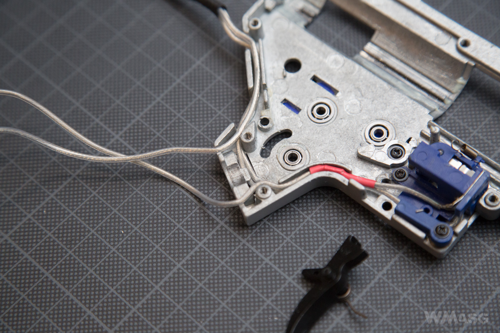 Konieczna będzie niewielka modyfikacja fabrycznej instalacji elektrycznej polegająca na rozgałęzieniu przewodu oznaczonego powyżej jako motor postive na jeden ze styków kostki stykowej/mikrowyłącznika oraz konektora "+" na silniku. Poniżej przykład fabrycznej instalacji repliki Specna Arms Edge: