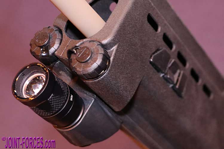- elementy łoża Wilcox Fusion System składające się miedzy innymi z chwytu z oświetleniem taktycznym Surefire, celownika elektro-optycznego z przystawką powiększającą oraz iluminatora IR.