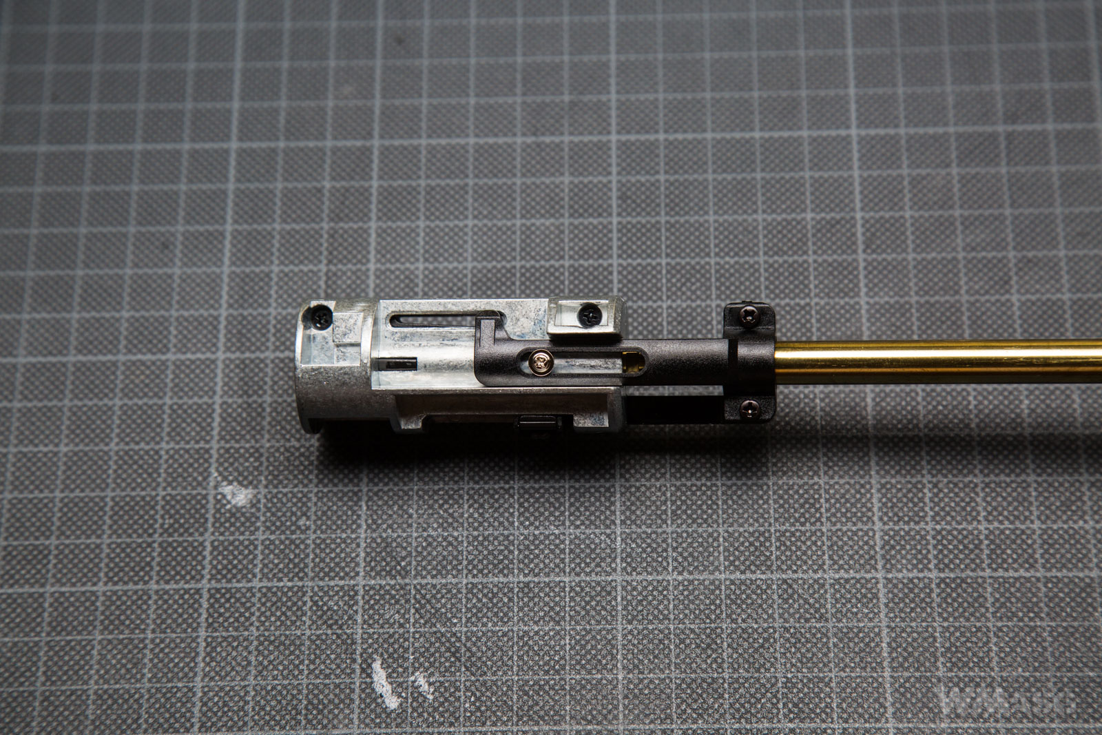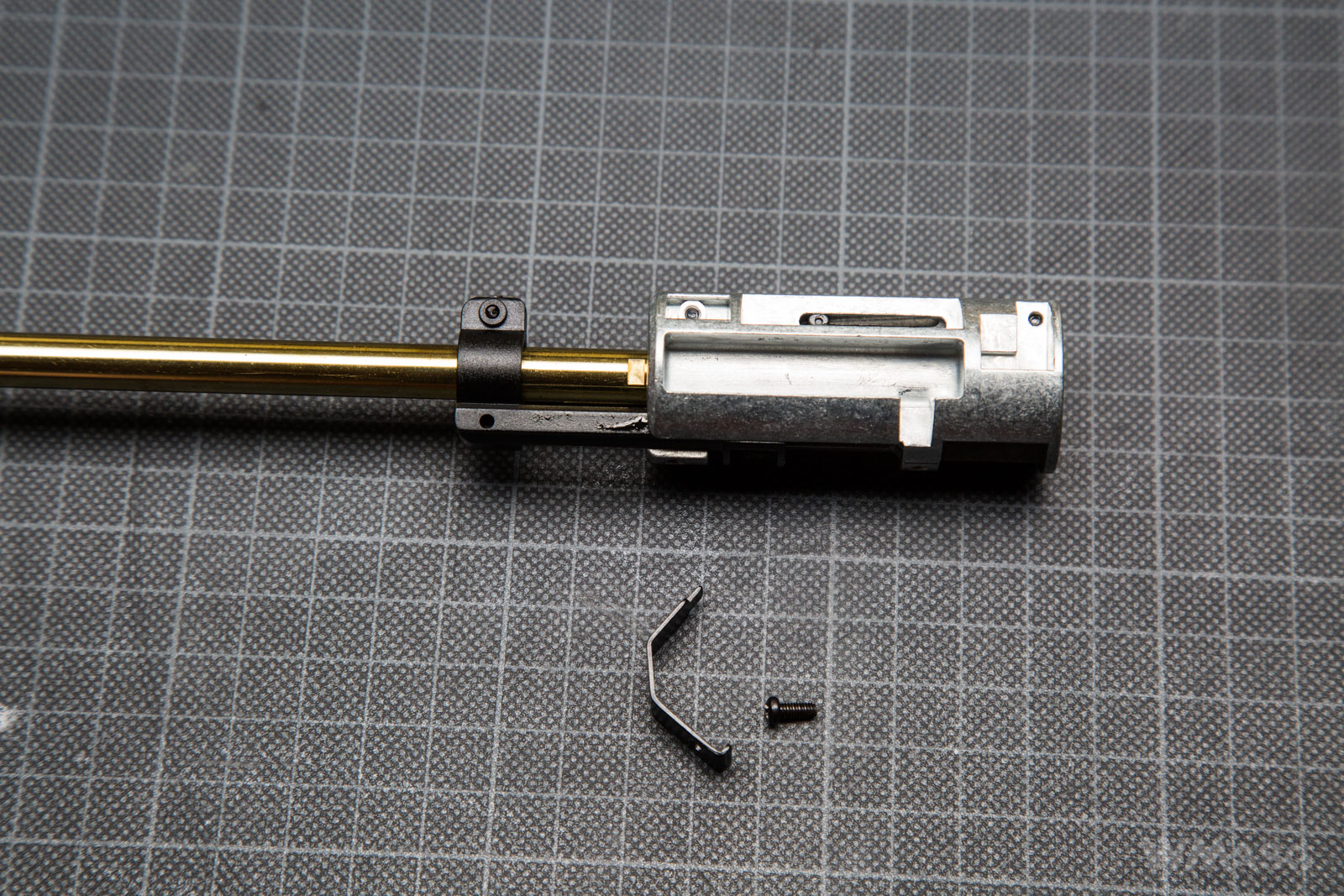 Dostęp do komory uzyskujemy po wyciągnięciu jej w lufy zewnętrznej. Robi się to w typowy sposób - odkręcając 2 śruby mocujące komorę oraz zakończenie lufy. Na zdjęciach widoczny jest też stabilizator lufy wewnętrznej.
