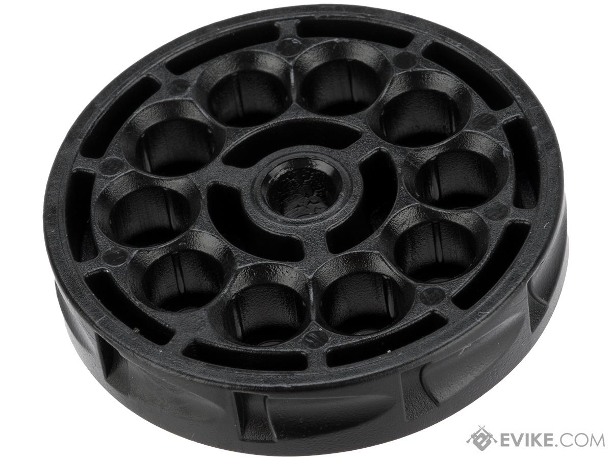 Tak jak poprzednio rewolwer zasilany jest z płaskiego bębenka wsuwanego we właściwe miejsce od lewej strony. Charakterystyczny magazynek mieści 10 umieszczanych w osobnych gniazdach kulek. W pudełku z zabawką otrzymujemy 5 takich magazynków.