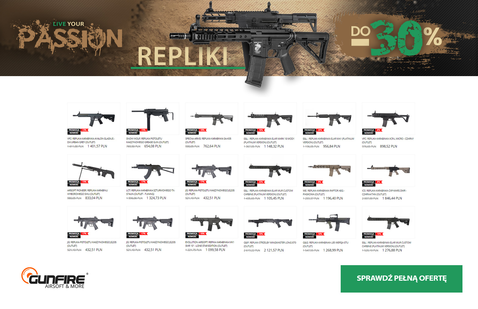 Airsoft to nasza pasja, którą chcemy się z Wami dzielić. Jednak żeby w pełni cieszyć się z gry warto wybrać odpowiedni sprzęt. Jak to zrobić nie nadwyrężając przy tym budżetu? Wystarczy skorzystać z naszej nowej oferty specjalnej Live Your Passion, w której znajdziecie repliki, akcesoria czy części w cenach niższych nawet do 75%. Wśród ponad 4500 produktów znajdziecie repliki przecenione do -35% w tym replikę karabinka GC16 RAIDER-Sod od marki G&G czy karabinek KAC SR635 od VFC. Elementy wyposażenia taktycznego do -75% jak akcesoria Z-Tactical oraz ładownice Primal Gear. W wyprzedaży znalazł się również spory wybór części i akcesoriów od takich producentów jak Airsoft Engineering, Element czy Guarder do 65% tańsze. Wśród nich są takie bestsellery jak zestawy stalowych podkładek czy o-ringów głowicy tłoka od SHS. Pozwól sobie na więcej i już teraz sprawdź naszą ofertę specjalną.