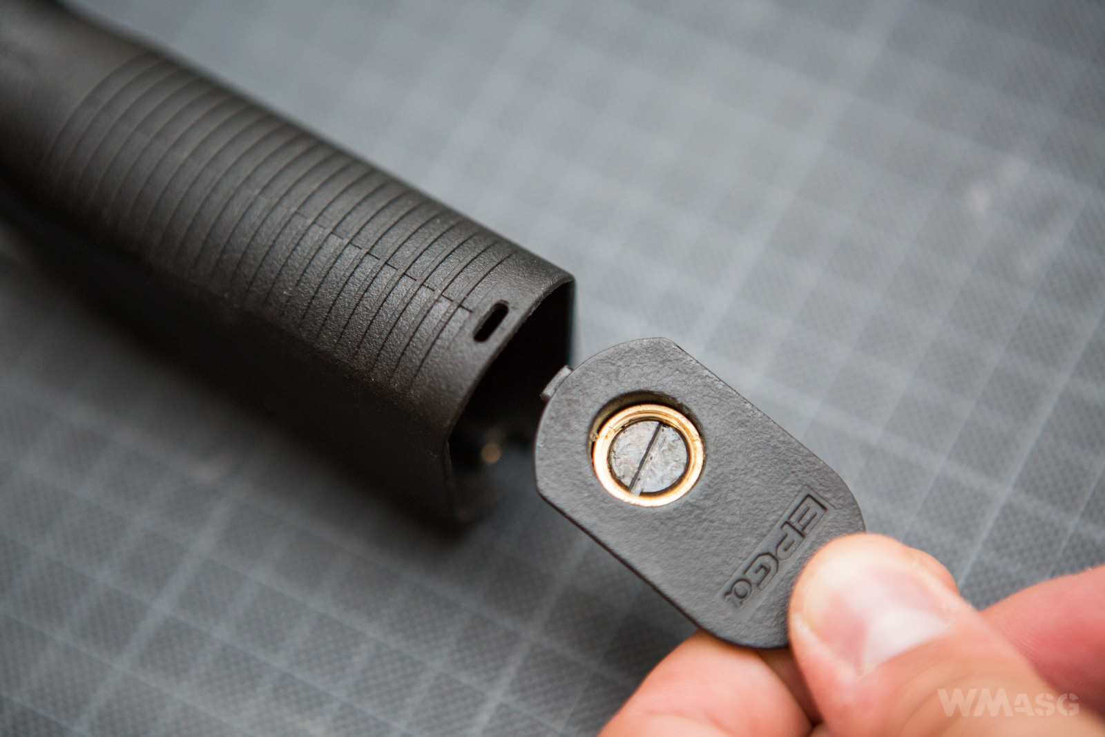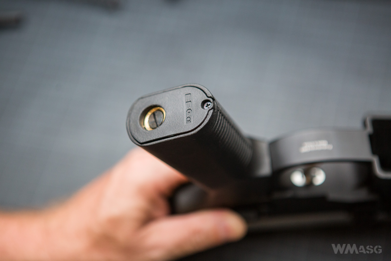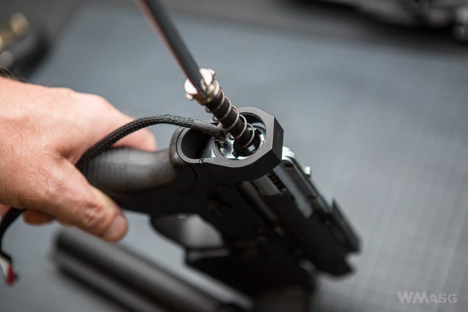 Replika posiada możliwość wymiany sprężyny z zewnątrz, bez wyciągania mechanizmu z korpusu. Aby to zrobić należy zdemontować prowadnicę kolby, co może być trudne bez narzędzi. My użyliśmy dedykowanego klucza. Na zdjęciach zdjęty jest także upper, ale oczywiście nie ma to nic wspólnego z wymianą sprężyny.