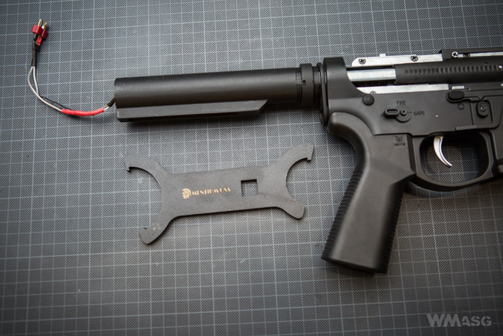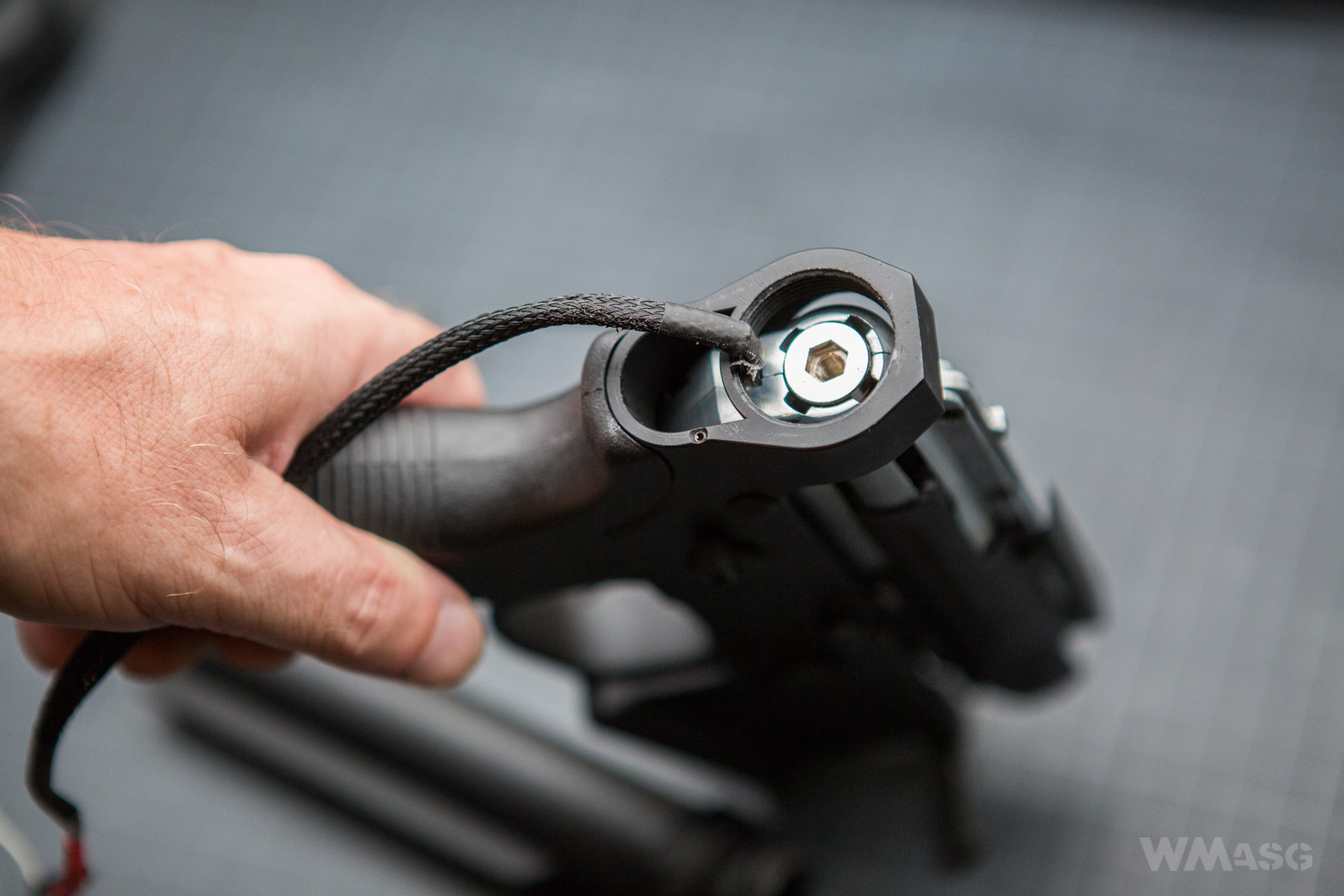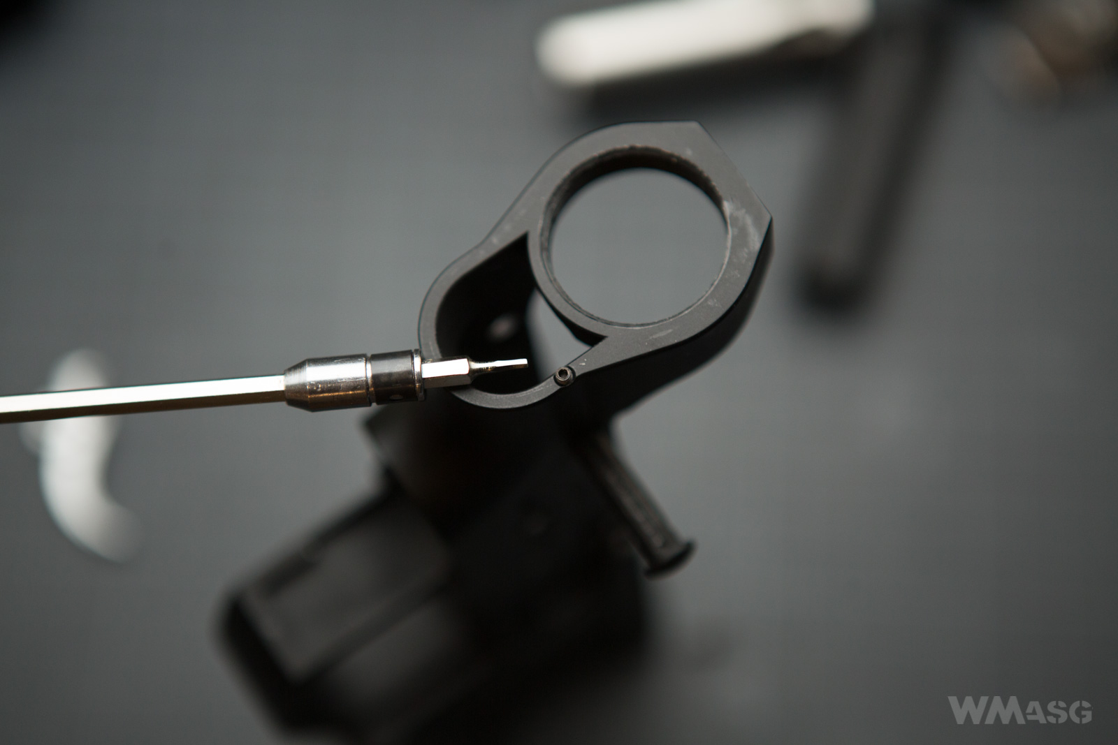 Replika posiada możliwość wymiany sprężyny z zewnątrz, bez wyciągania mechanizmu z korpusu. Aby to zrobić należy zdemontować prowadnicę kolby, co może być trudne bez narzędzi. My użyliśmy dedykowanego klucza. Na zdjęciach zdjęty jest także upper, ale oczywiście nie ma to nic wspólnego z wymianą sprężyny.
