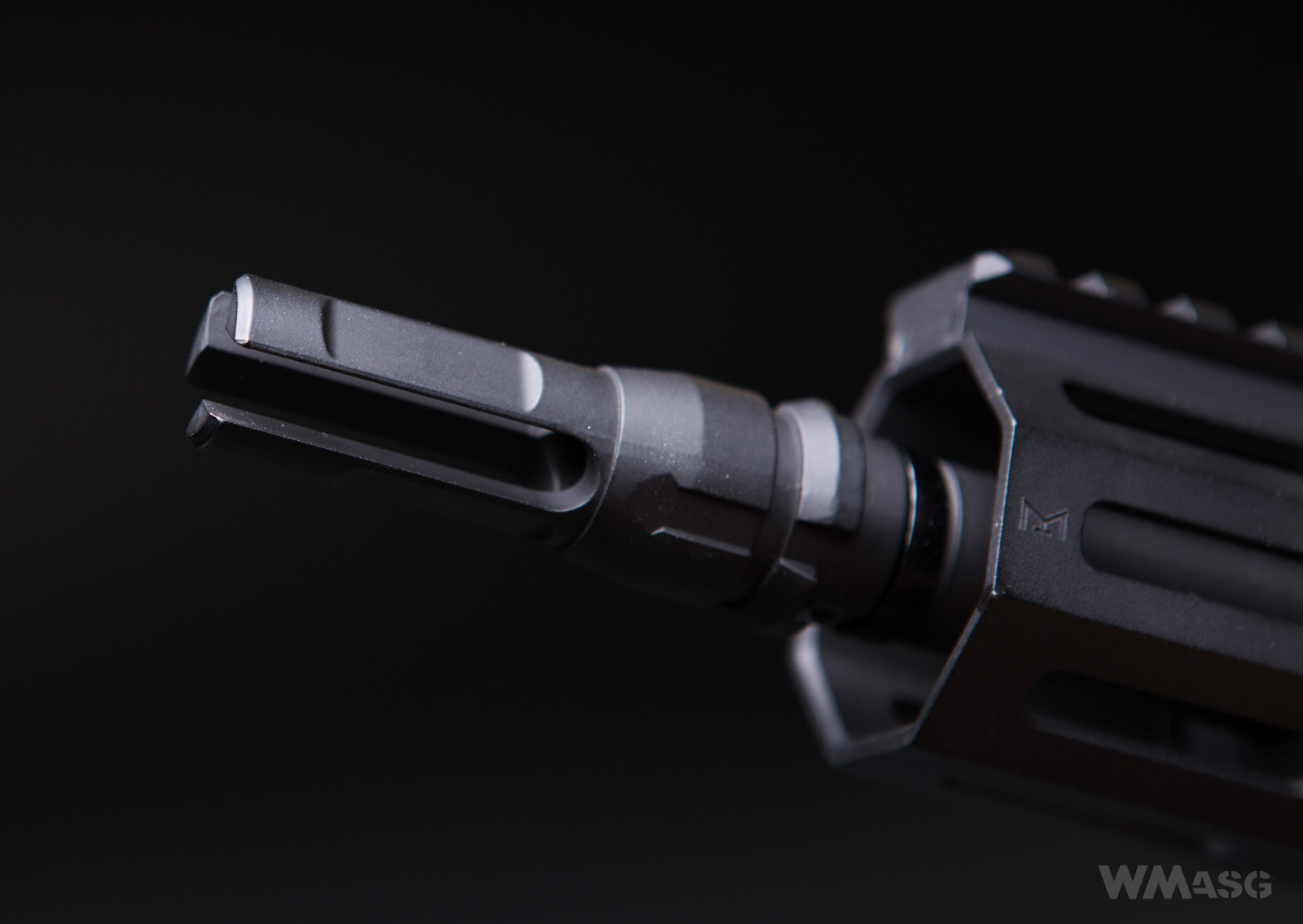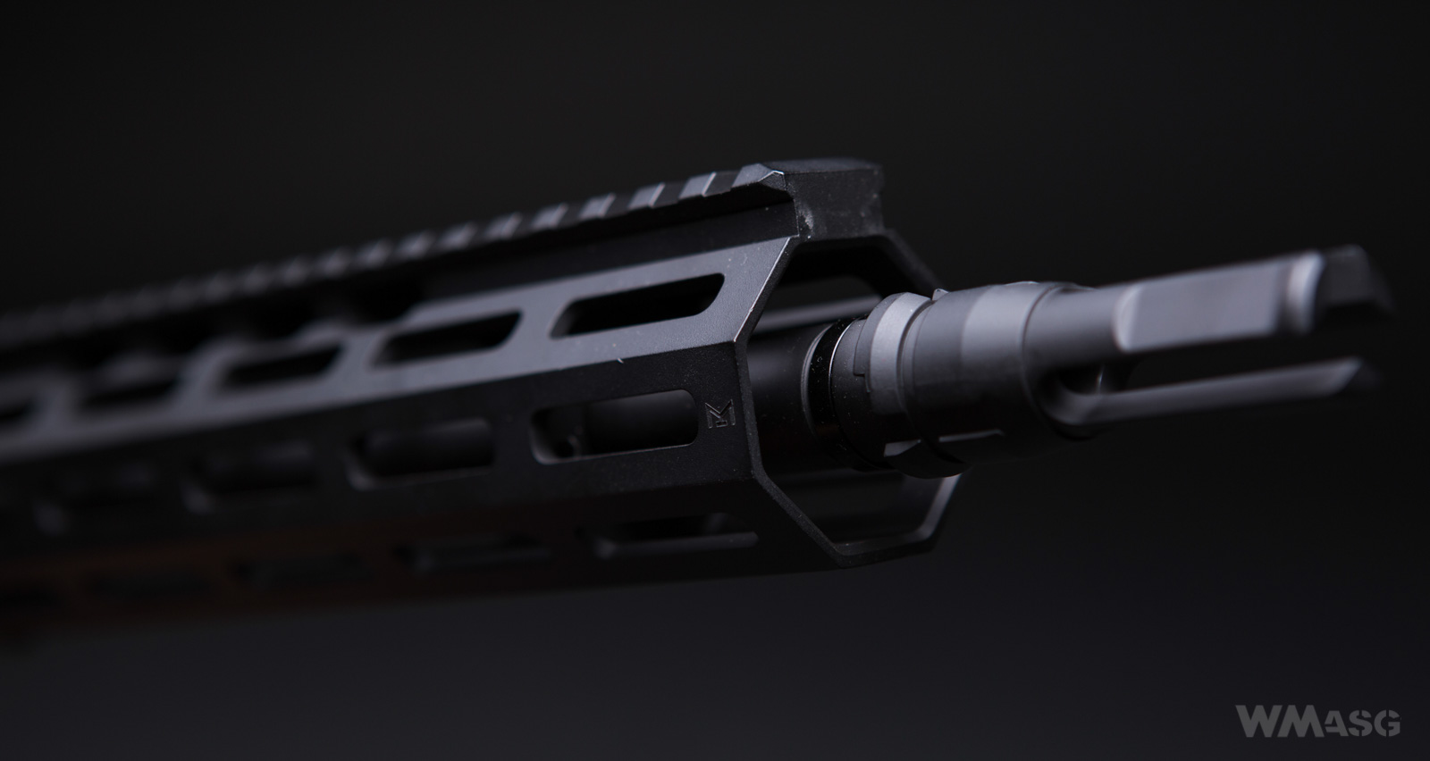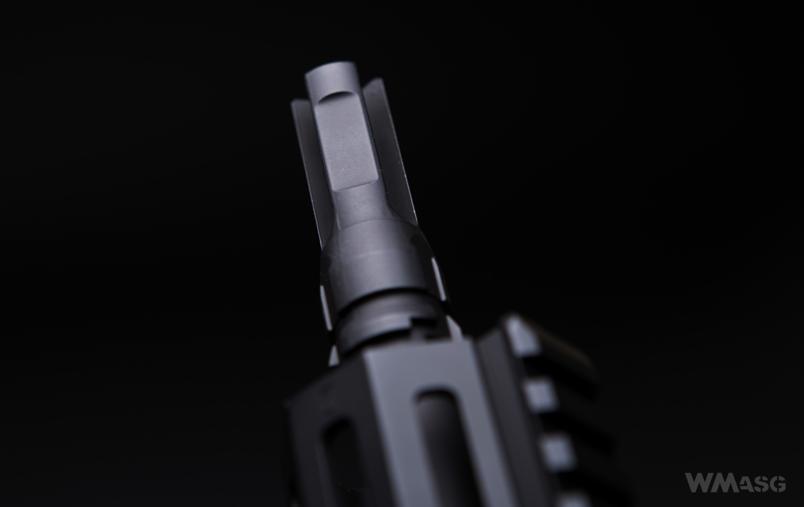 Lufę kończy masywne urządzenie wylotowe z trzema szczelinami mocowane gwintem 14 mm CCW (lewoskrętnym).