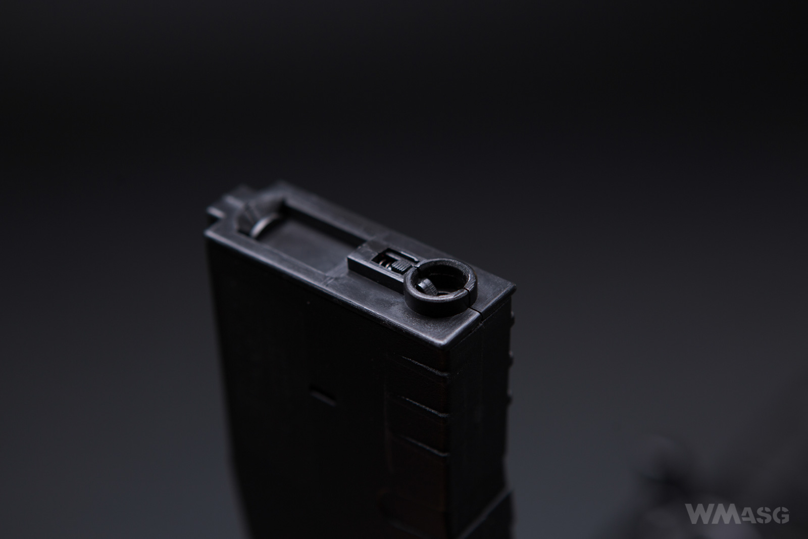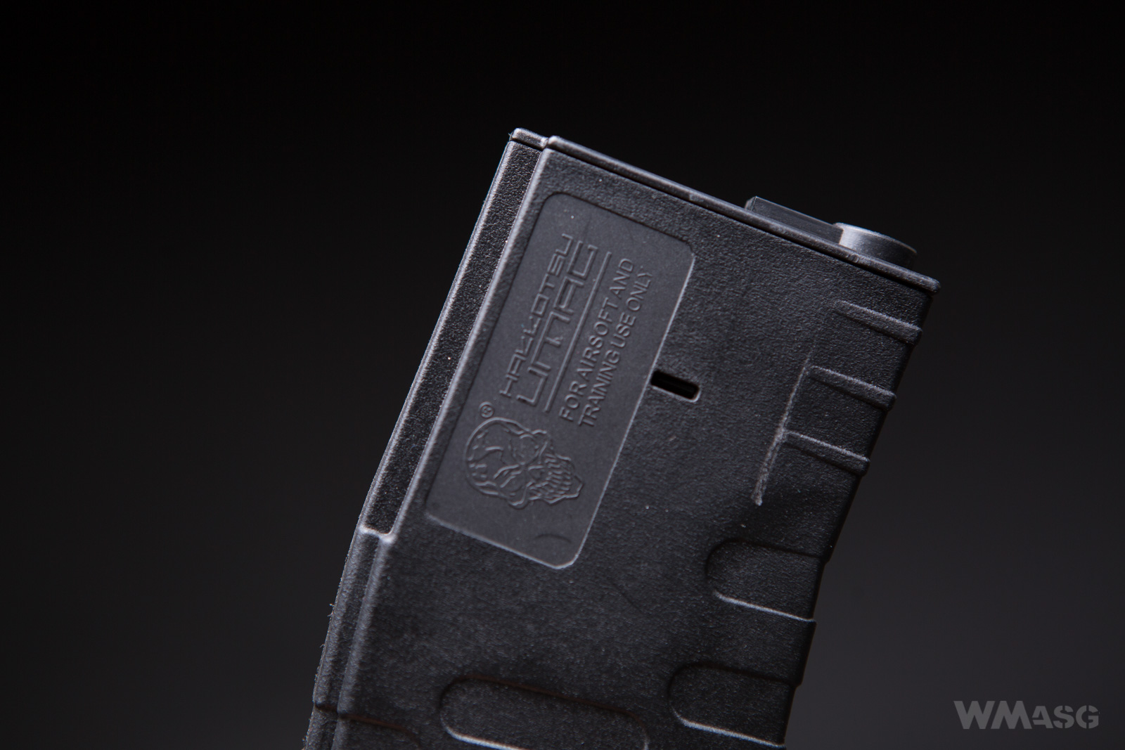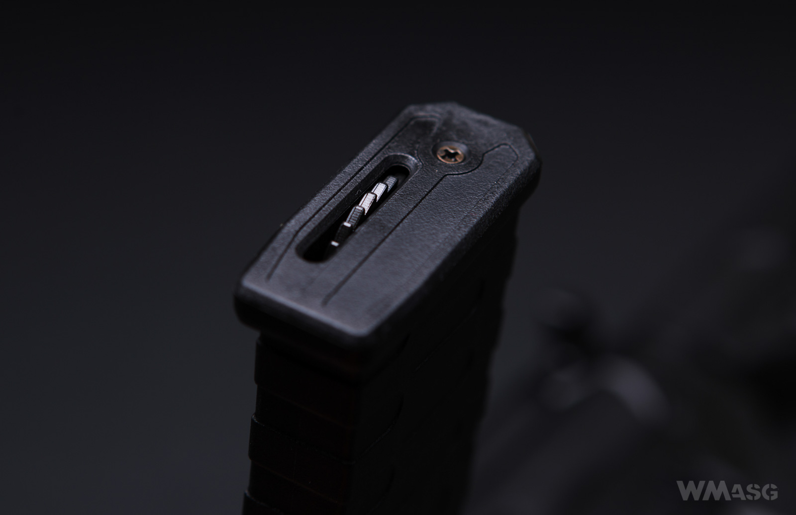 Dołączony do repliki magazynek to standardowy plastikowy hi-cap na 300 kulek o klasycznej konstrukcji z kółkiem do nakręcania w denku. APS nazywa te magazynki UMag. Stylistycznie przypominają nieco produkty Magpula, ale nie są kopią niczego. Evike (EMG) określa pojemność magazynka na 480 kulek, my trzymamy się informacji od APS.