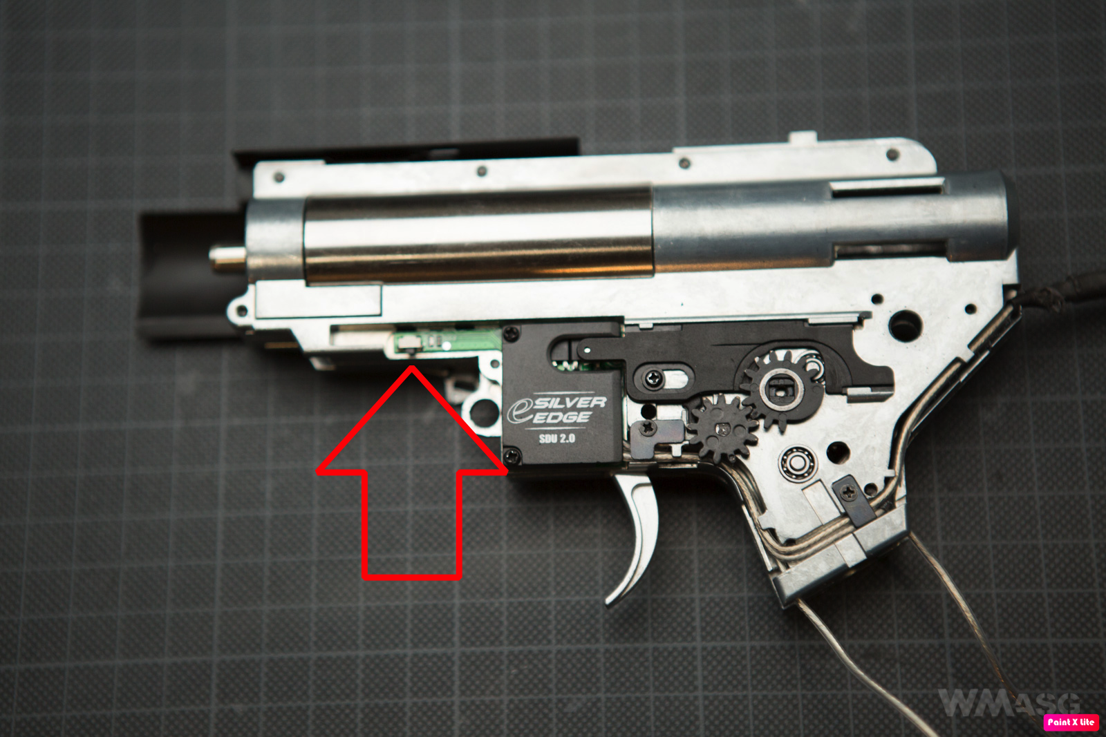 Przycisk programowania ukryty jest w gnieździe magazynka i oczywiście dostępny bez rozbierania repliki. Programowanie odbywa się poprzez kolejne naciskanie przycisku. Układ potwierdza zapisanie nastawy migającą diodą. Trzeba zaznaczyć, że po odłączeniu zasilania SDU 2.0 wraca do ustawień domyślnych. Samo programowanie jest banalnie proste -podczas testów robiliśmy to wielokrotnie "w polu". Obyło się bez najmniejszych problemów. Poniżej strzałka wskazuje umiejscowienie przycisku programowania.