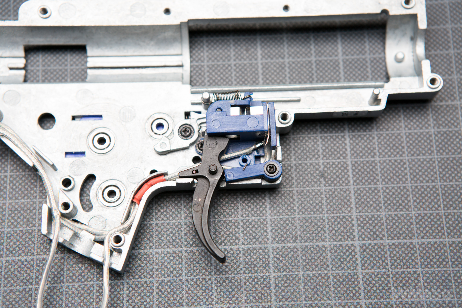 Zwracają uwagę łożyska kulowe o średnicy 8mm i okrągłe wykończenie narożników okna na cylinder. W lewej połówce jest okienko służące do zwolnienia zapadki przeciwpowrotnej (anti reversal) oraz otwór z osłoną przewodów.