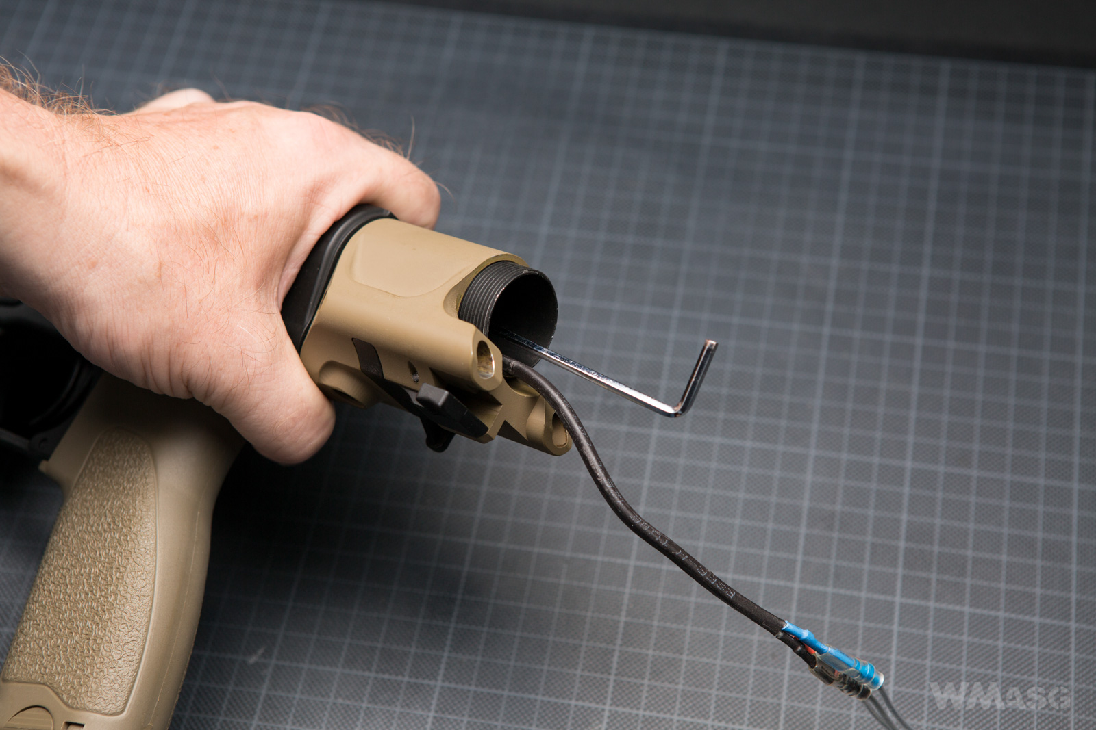 Krok 3- kluczem imbusowym odkręcamy śrubę mocującą osadę kolby i stabilizującą prowadnicę sprężyny.