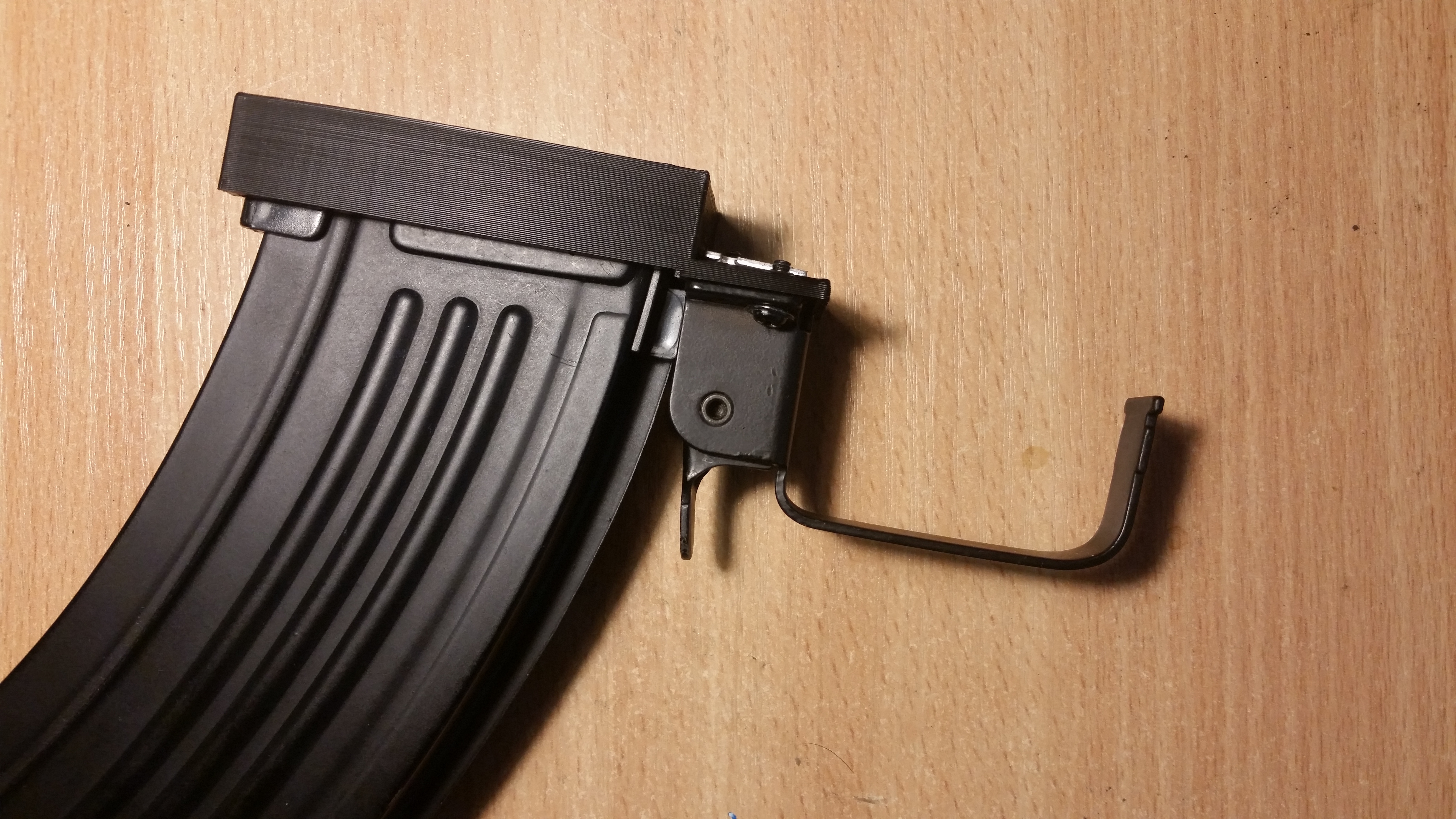 Konstrukcja zasilana jest z dwóch standardowych magazynków do kałasza. Po wpięciu go do łoża, dźwignia samoczynnie spada i blokuje go w tej pozycji. Sama dźwignia jest na tyle długa, że chwyta oba magi. Zasada działania jest taka sama jak w oryginale. jednym ruchem można nacisnąć dźwignię i wypiąć oba magi. Niestety w tego typie konstrukcji znajdują się one z tyłu. Sprawia to, że bywają niewygodne w obsłudze. Nie inaczej jest tutaj. układ spustowy musi być wysunięty kilka centymetrów do przodu, aby magazynki w ogóle dało się zainstalować. Jak dopadnę magazynek elektryczny postaram się zaprojektować  adapter tak, aby można było go regulować albo przynajmniej zainstalować nie ruszając zespołu spustu.Testy przeprowadzałem na tanich hicapach, ale chcę w przyszłości wyposażyć to cacko w magazynek elektryczny z odpowiednią konwersją.