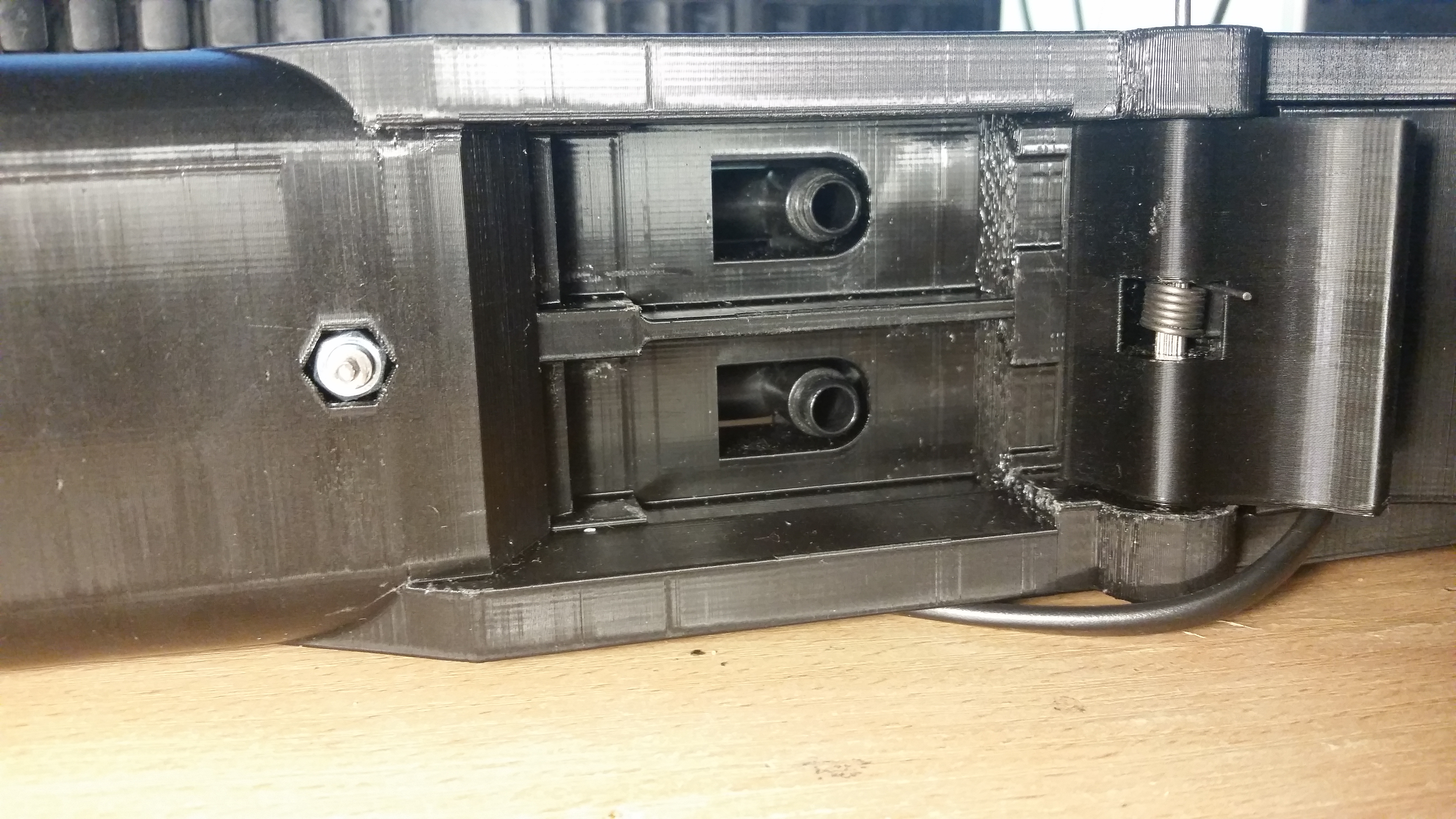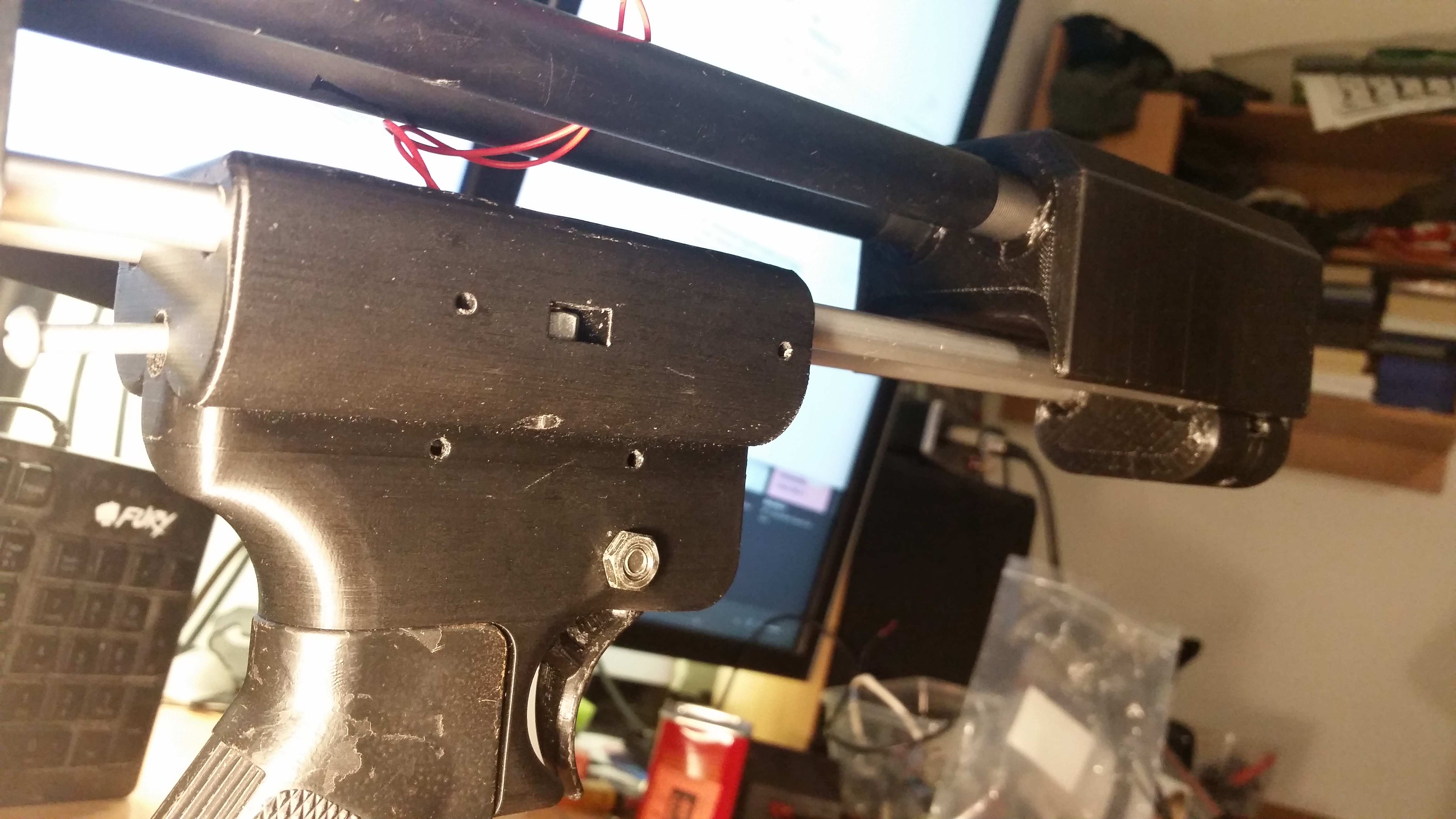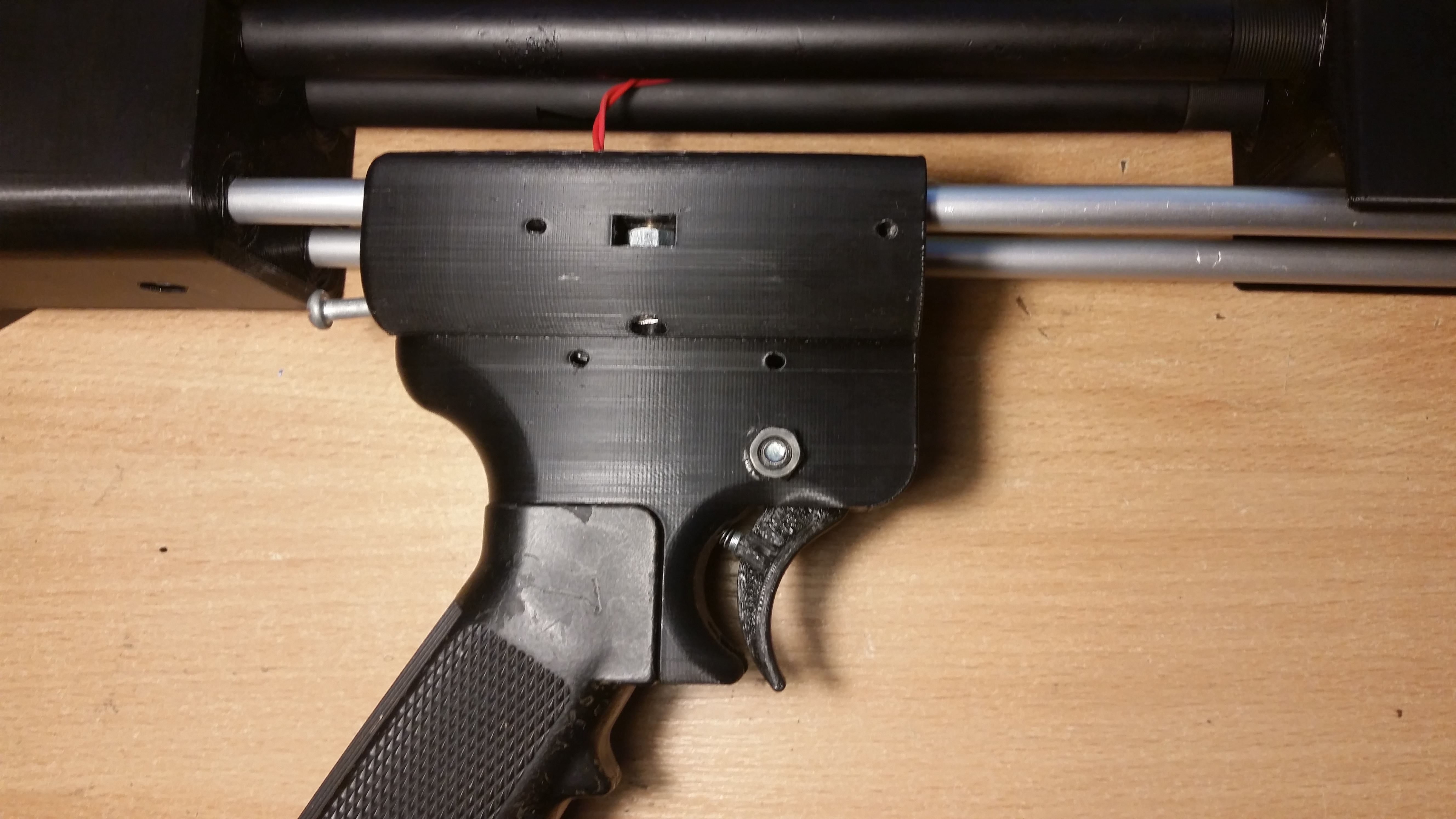 Całość umieściłem w obudowie, w której zaprojektowałem prowadnicę pistolgripu z ARki. W otworach na gorze są dwie prowadnice, po których całość się przesuwa. Blokowanie polega na dokręceniu obu śrub. Za językiem spustowym dodałem niewielki kanał w którym można zainstalować sprężynę. Taka z długopisu pasuje, ale nie jest zbyt mocna. W zasadzie zapewnia tylko powrót do pozycji początkowej. „Czułość” spustu można skalibrować tak, że microswitch leży na spuście, i nawet najmniejszy nacisk powoduje załączenie układu.