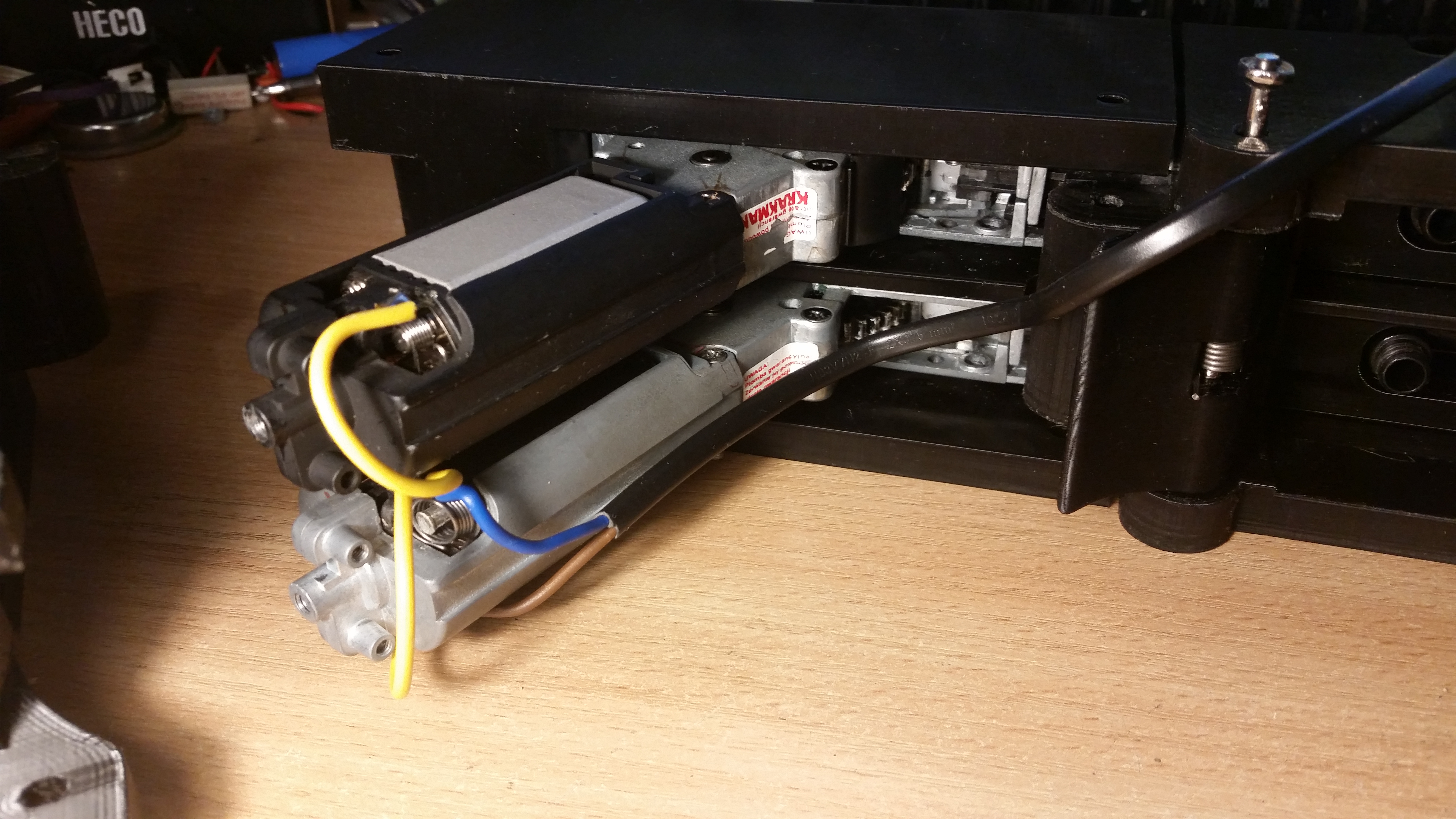 Myślałem nad wykorzystaniem prostego układu z mosfetem, ale nie miałem już elementów. Postanowiłem użyć zwyczajnego przekaźnika NT75 1C. Mosfet to fajne rozwiązanie, gdy chcesz przekazać duży prąd z małą stratą, dysponując niewielką ilością miejsca. Ale tutaj nie mam tego problemu. Dodatkowo w przeszłości miewałem z nimi problemy. Zdarzało mi się przyjechać na strzelankę i dowiedzieć się że mosfet w M-ce jest zwarty i nawet zabezpieczona broń strzelała ogniem ciągłym. Wolałem użyć przekaźnika. Microswitch w układzie spustowym poprzez rezystor sygnalizuje go do załączenia zasilania silników. Mało eleganckie, ale skuteczne i tanie. Gearboxy zostały wyposażone w sprężyny M110 i zestawy zębatek 13:1. obciążenia nie są duże ale jak w układzie pracują dwa silniki, to pobór energii jest spory. po kilkunastu sekundach ciągłego ognia bateria zaczyna się rozgrzewać. Nie jakoś drastycznie, ale trzeba uważać.