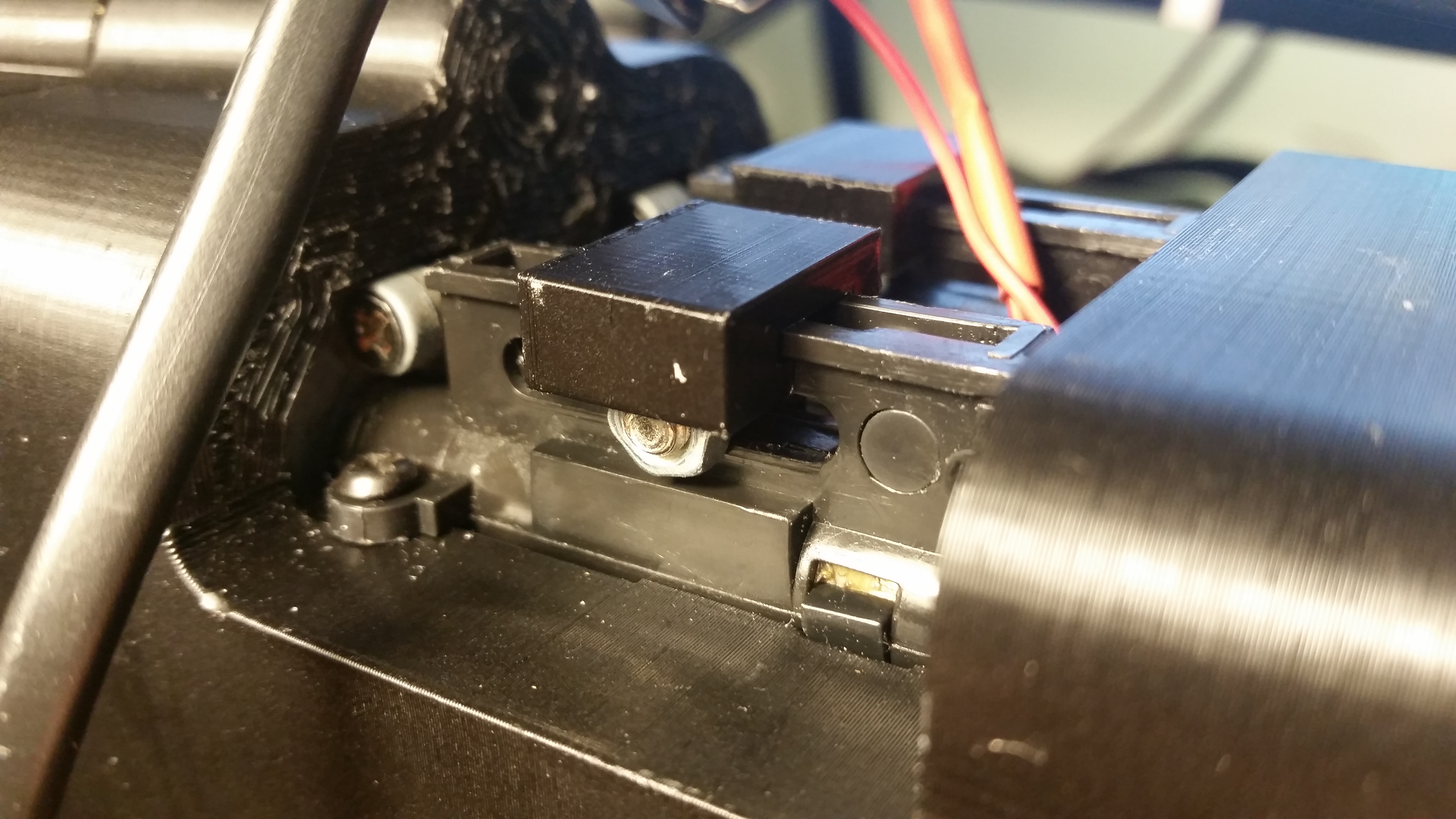 Teraz przyszedł czas na tą trudniejszą część - regulację. Początkowo myślałem nad pionową śrubą, której wkręcanie zmniejszałoby odległość przycisku do spustu. Szybko porzuciłem ten pomysł na rzecz rampy. Zasada działania jest dość prosta. Wkręcając śrubę popychamy rampę, która przesuwa manipulator w osi prostopadłej do osi śruby. Kąt nachylenia wynosi około 20st. Oznacza to, że relatywnie duży ruch rampy przekłada się na niewielki ruch manipulatora. Sam manipulator to tak naprawdę uchwyt na łącznik elektryczny z prowadnicą. Wszystko jest napinane przez sprężynki z długopisów.