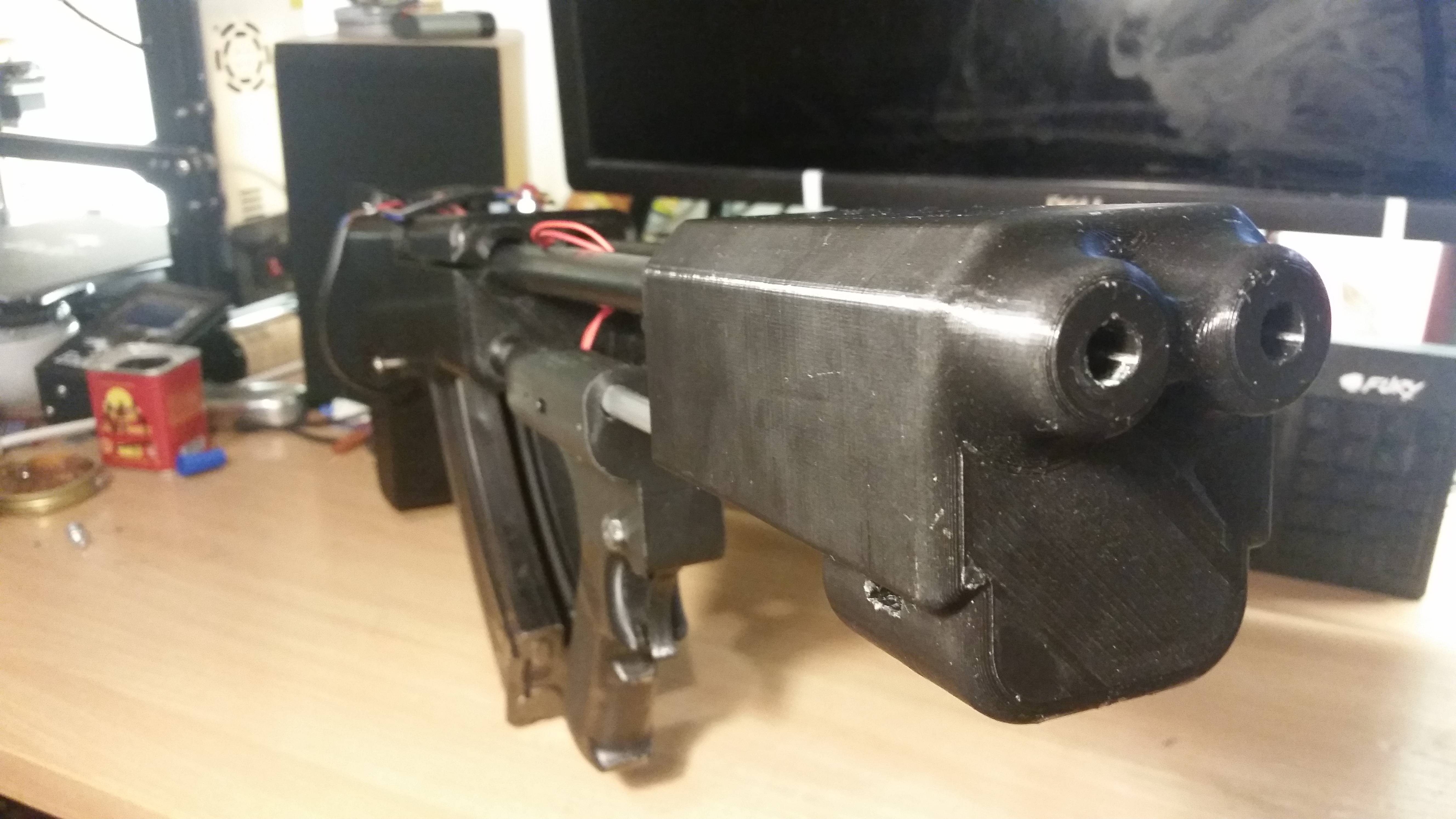 Na pewno poważnie podejdę do magazynka. Muszę tylko zdobyć taki, który sam się nakręca, i go dostosować. Wypadałoby też zrobić jakiś selektor ognia. W tym momencie po podłączeniu baterii broń jest gorąca, a spust bardzo łatwo wcisnąć nawet przypadkowo. Przydałaby się jakaś obudowa nad elektroniką i komorami HU, może nawet z szyną RIS, żeby zamontować jakieś holo. Jeśli macie fajny pomysł jak to rozwinąć, dajcie znać. Jak opracuję poprawki to wrzucę update. Na razie elektryka wisi trochę z boku, ale i na to znajdzie się rozwiązanie. W planach mam też zainstalować wszystkie śruby oraz zamiast śrubokrętu w osi dźwigni zwalniającej magazynek zainstalować prawdziwą oś.