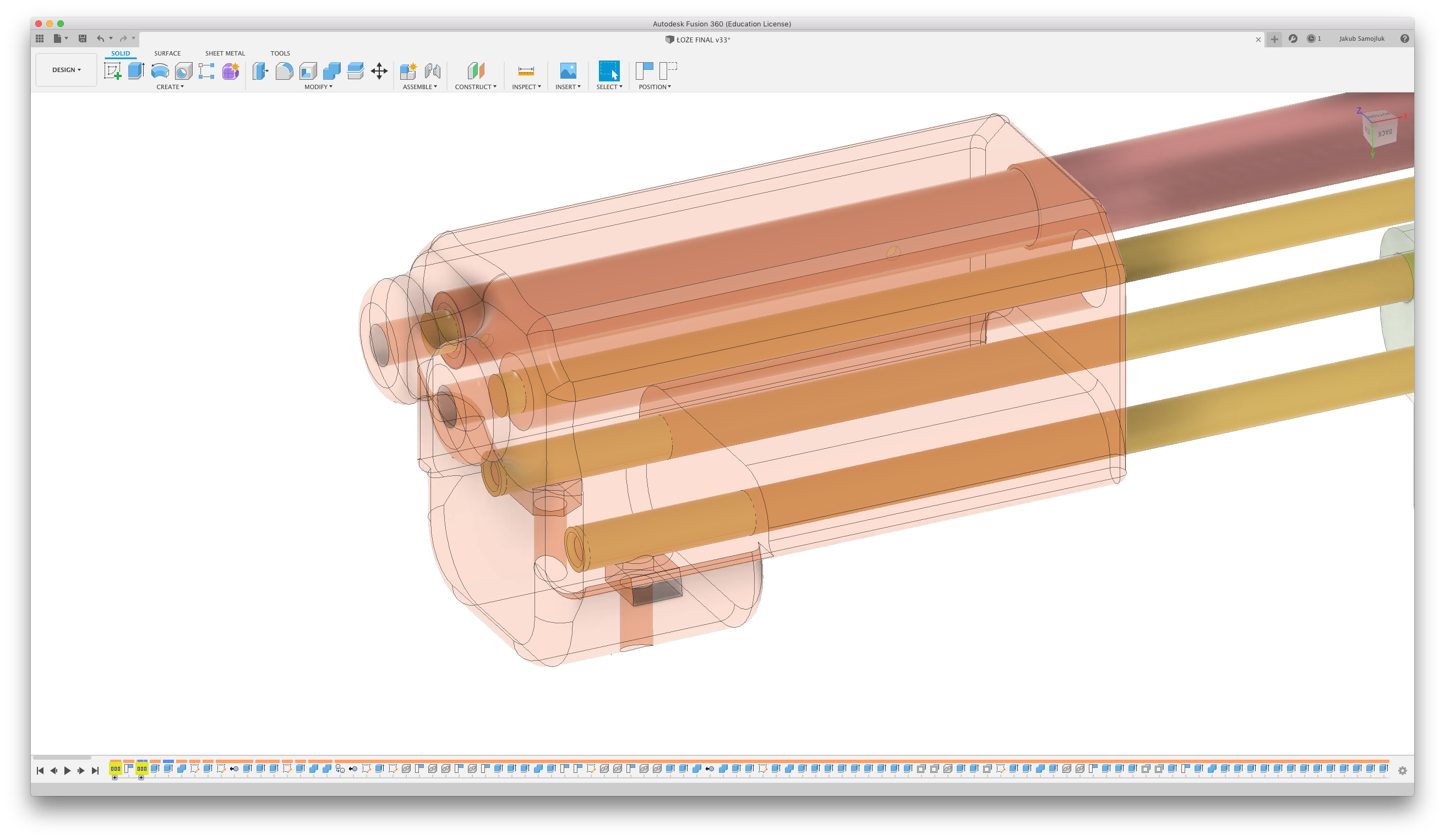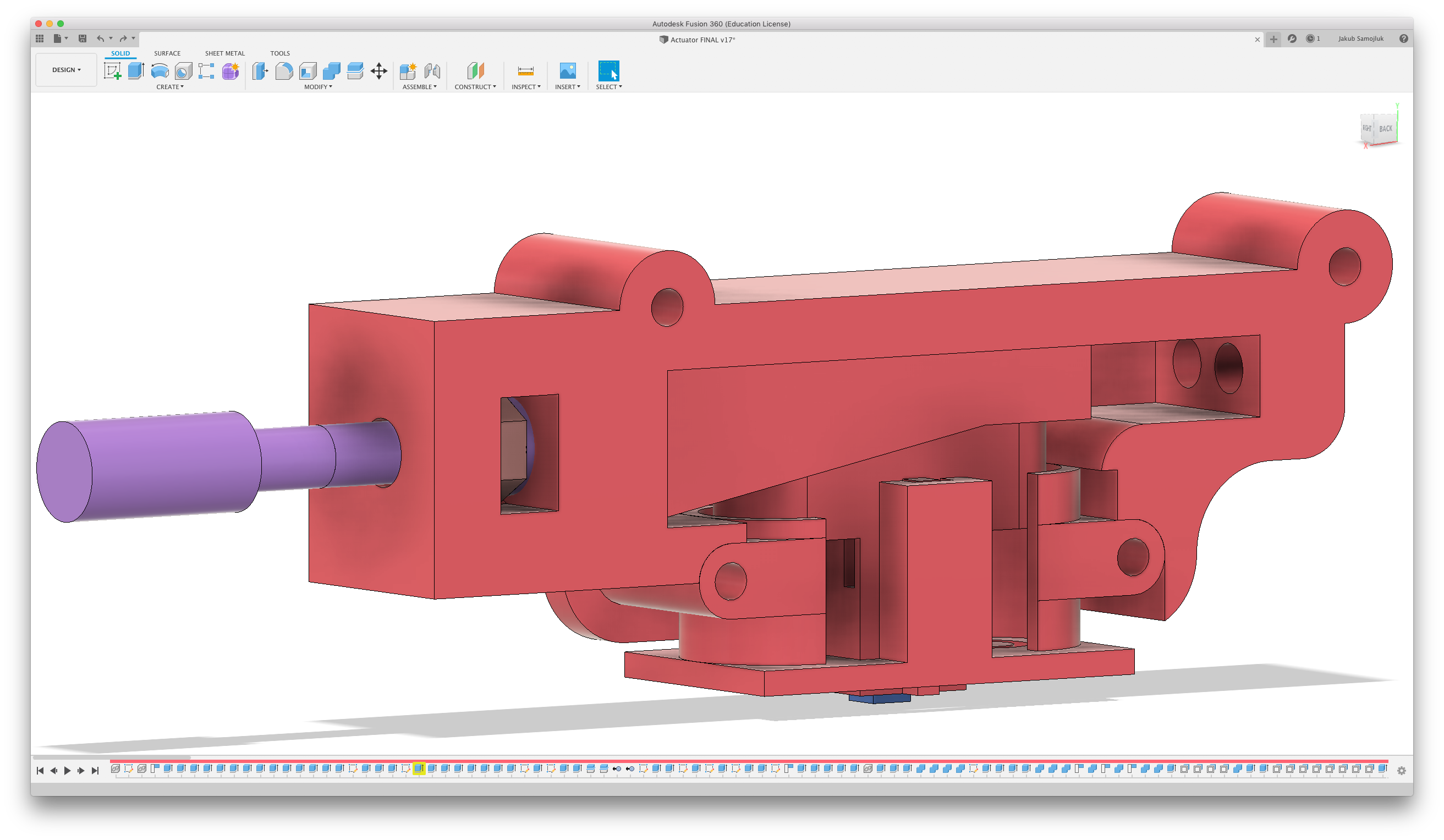 Projekt kolby był dość prosty. Gdy oba gearboxy były umieszczone w przestrzeni Fusiona, wystarczyło narysować kilka linii i stworzyć z nich ściany i nieco wyoblić rogi. Niestety pobrany model gearboxa nie miał silnika. Zaprojektowałem szybko zamiennik w taki sposób, żeby dolne otwory były w odpowiedniej pozycji. Konstrukcja kolby pozwala na przykręcenie silników i unieruchomieniu obu gearboxów. Sprawia to, że siedzą sztywno w konstrukcji i nie poruszają się.