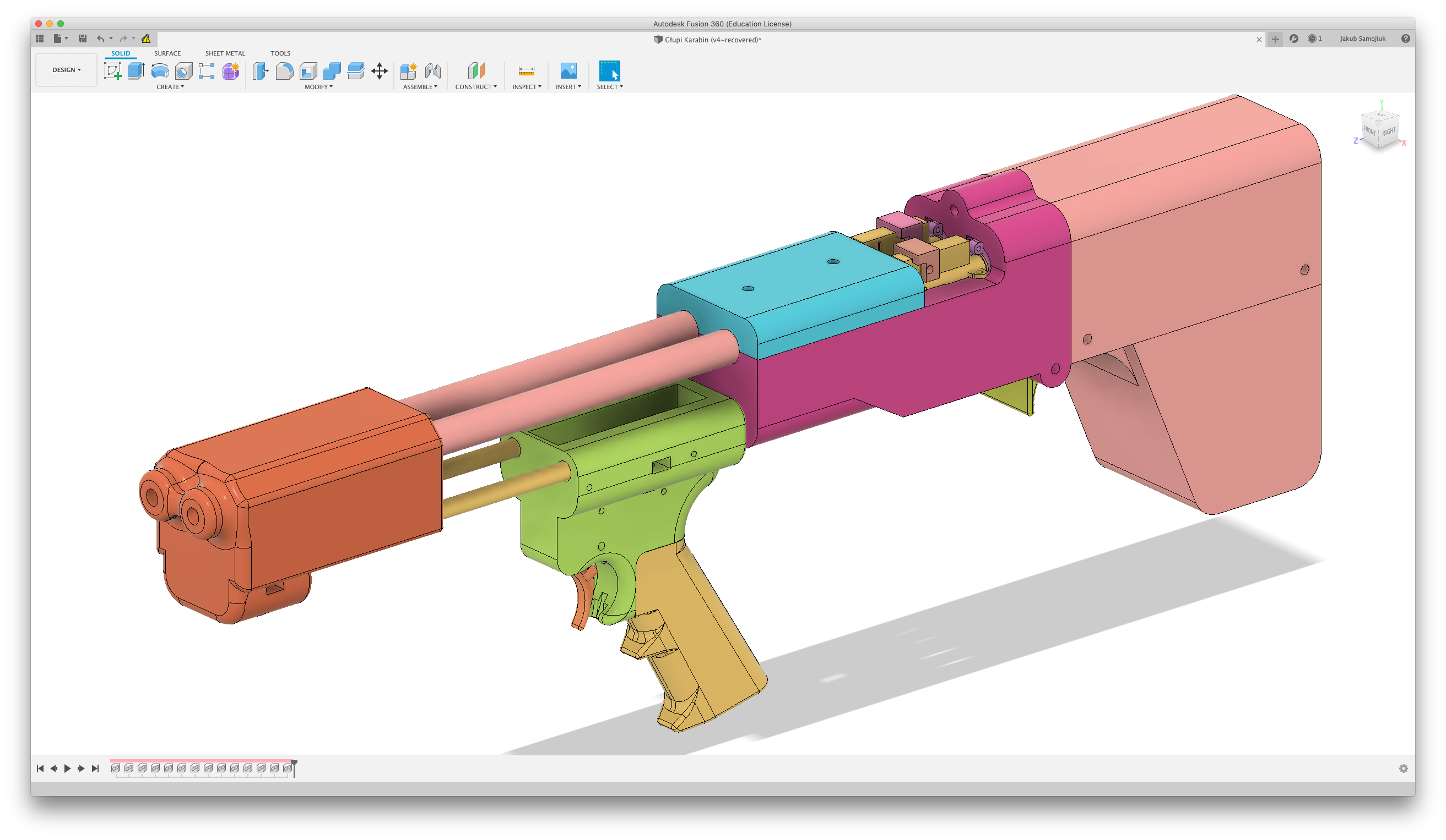 Głupi Karabin ma 70cm długości i waży 4,1kg bez magazynków i baterii. Kolba jest dość kanciasta i niewygodna, ale to można łatwo poprawić w projekcie albo jakąś nakładką. Dodatkowo konstrukcję można postawić pionowo na kolbie i stoi dość stabilnie. Niestety nie zaprojektowałem uchwytu przedniego, przez co trochę fikuśnie się to trzyma. Odległość do zespołu spustowego udało mi się całkiem nieźle wymierzyć. Jestem co prawda dość wysoki i złapanie spustu nie robi mi większego problemu, ale moi normalni znajomi narzekali na dużą odległość. Projekt wykonałem w programie Fusion 360. Części do druku kroiłem w Curze. Większość wydruków miała następujące ustawienia: