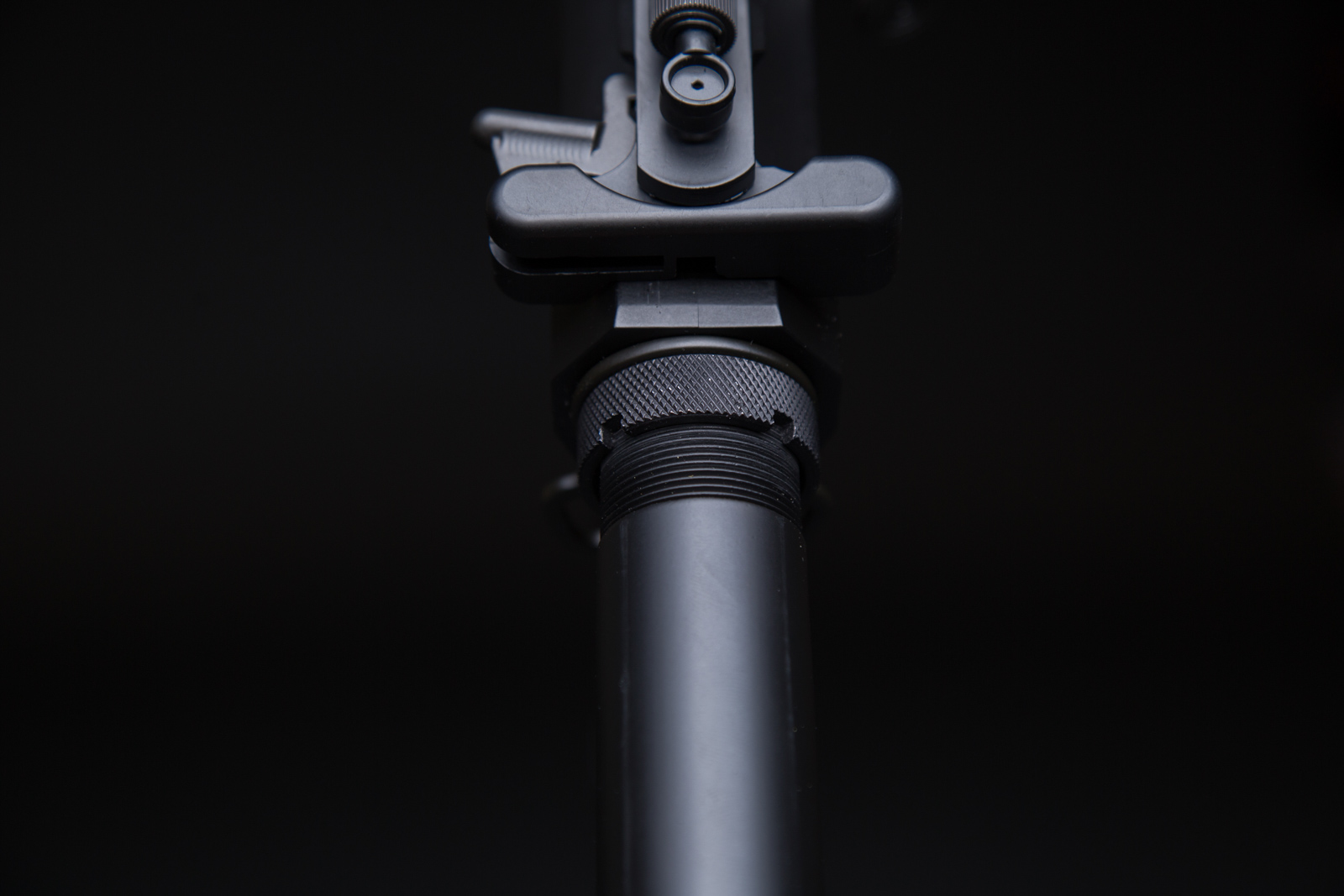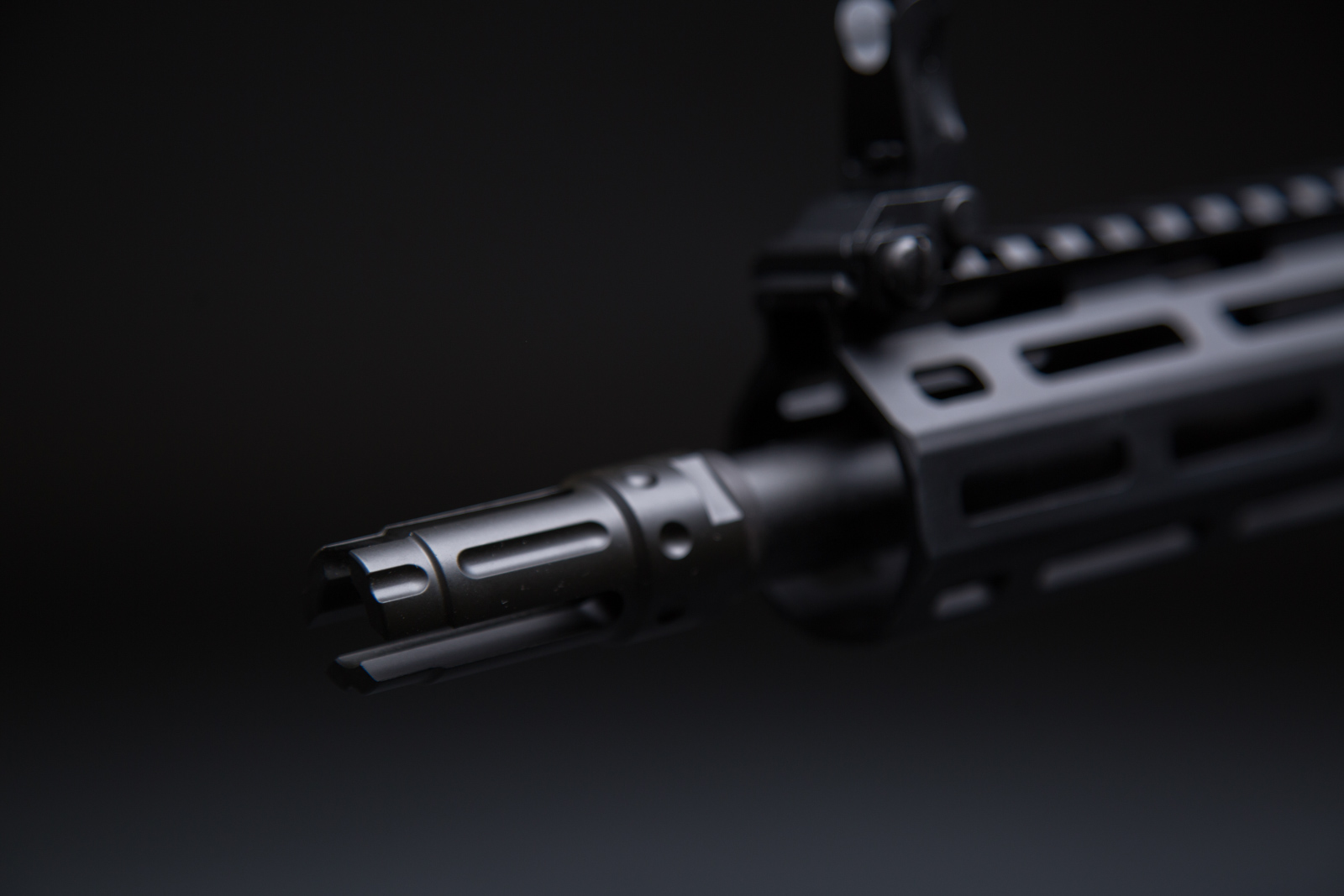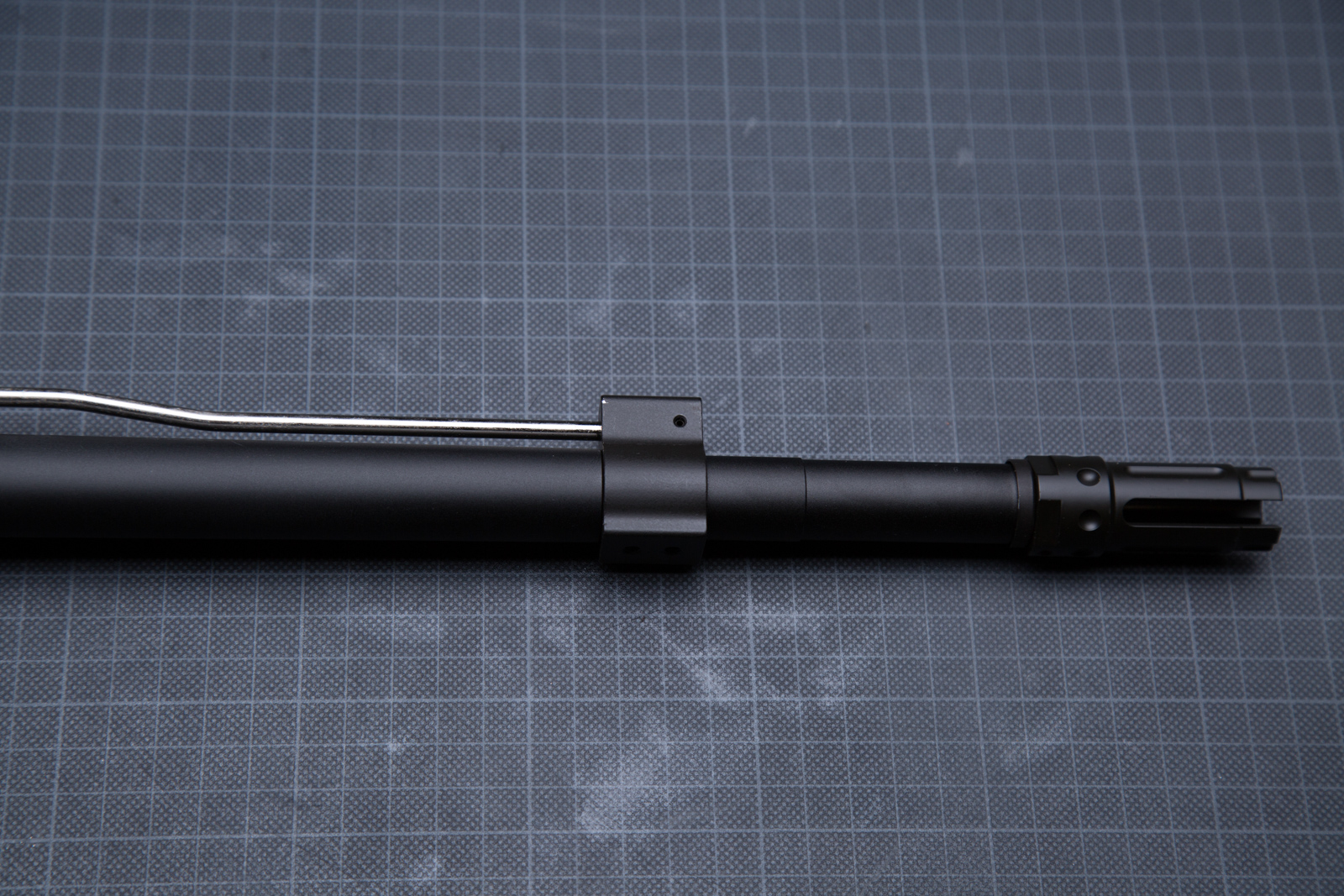 Jednoczęściowa metalowa lufa zewnętrzna zakończona jest standardowym lewoskrętnym (CCW) gwintem 14mm. Na nim zamocowane jest urządzenie wylotowebędące kopią KAC QDC 3-PRONG FLASH SUPPRESSOR - 5.56mm produkcji Knight's Armament. Jest to drobna nieścisłość, bo replika karabinu .308 Win winna mieć nieco inny tłumik płomienia - KAC 7.62 QDC 3-PRONG FLASH HIDER. Ale po pierwsze w oryginale oba urządzenia są do siebie bardzo podobne, po drugie w replikach nie służą zupełnie do niczego, a po trzecie ten sam tłumik wykorzystano w CM.097 (gdzie jak najbardziej pasuje) – co stanowi argument natury ekonomicznej. Na gwincie lufy umieszczony jest gumowy o-ring dystansujący. Tłumik płomienia zabezpieczony jest śrubą dociskową.