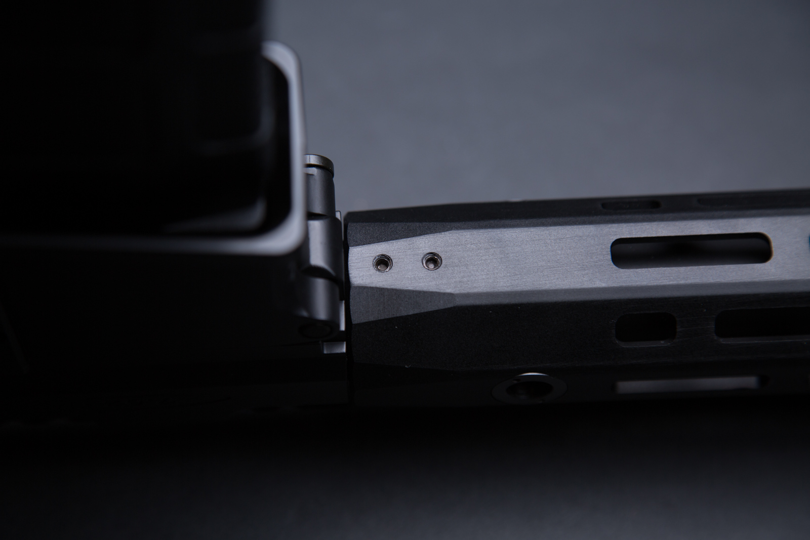 Metalowe łoże w systemie M-LOK wykonane jest bardzo starannie i pokryte tą samą farbą co korpus repliki. Po obu stronach umieszczono gniazda QD do montażu pasa. Łoże nasunięte jest na pierścień osadczy i skontrowane od spodu dwiema śrubami dociskowymi.
