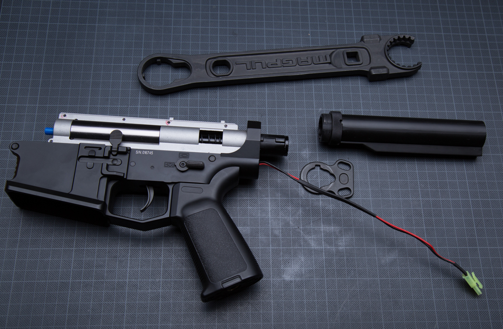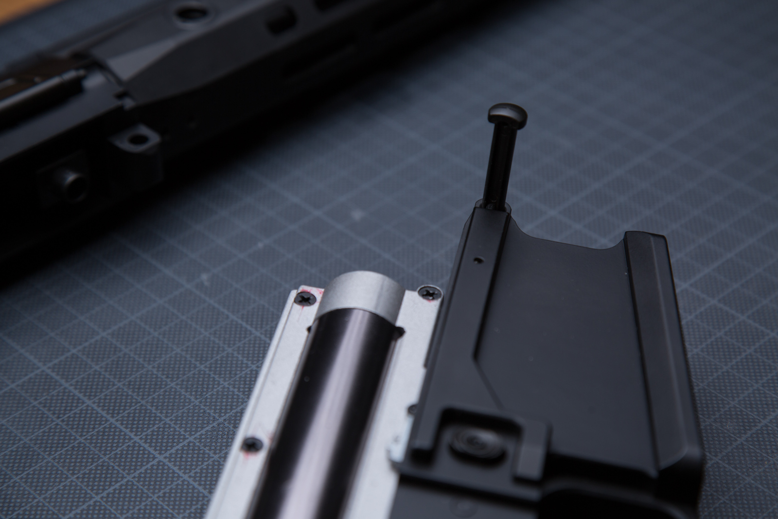 Zastosowany system szybkiej wymiany sprężyny pozwala dokonać tego bez wyjmowania mechanizmu z komory spustowej, ale wymaga zastosowania narzędzi. Do odkręcenia prowadnicy kolby (stock pipe, buffer tube) przyda się dedykowany klucz do nakrętki koronowej. Dalej przyda się płaski śrubokręt, klucz imbusowy nr 6 lub moneta. Prowadnica mocowana jest w znany już sposób nie w szkielecie, ale w króćcu komory spustowej. Na zdjęciach poniżej komora zamkowa jest odłączona, ale oczywiście nie trzeba tego robić wymieniając sprężynę.