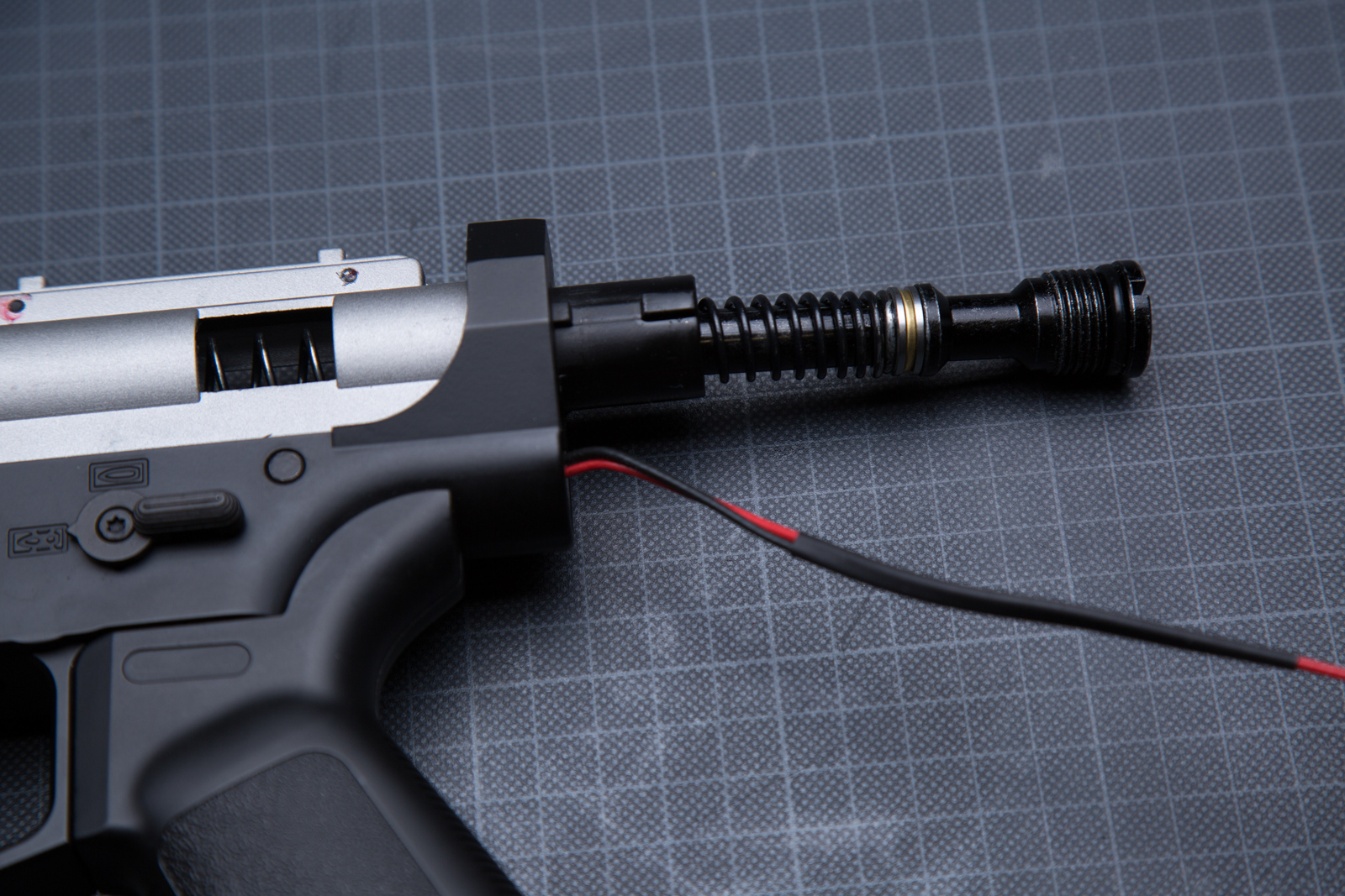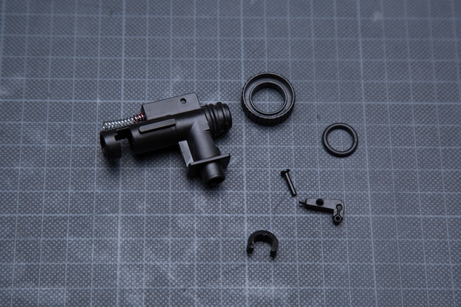 W replice zastosowano polimerową komorę HopUp z osiowo umieszczonym pierścieniem regulacyjnym (rotary). Gumka jest standardowa. Mosiężna lufa ma długość 400mm. Nietypowy jest dystanser, który dzięki specjalnemu kształtowi mocowany jest do ramienia dociskowego. Korzyść z tego rozwiązania jest oczywista - podczas regulacji HopUp podnoszące się ramię dociskowe (mniej HU) zabiera ze sobą dystanser. W tradycyjnej konstrukcji dystanser wypychany jest jedynie siłą sprężystości gumki, która zmienia się np. w zależności od temperatury otoczenia. Proste, a dobre. Kształt ramienia nie wyklucza korzystania z tradycyjnych walcowatych dystanserów.