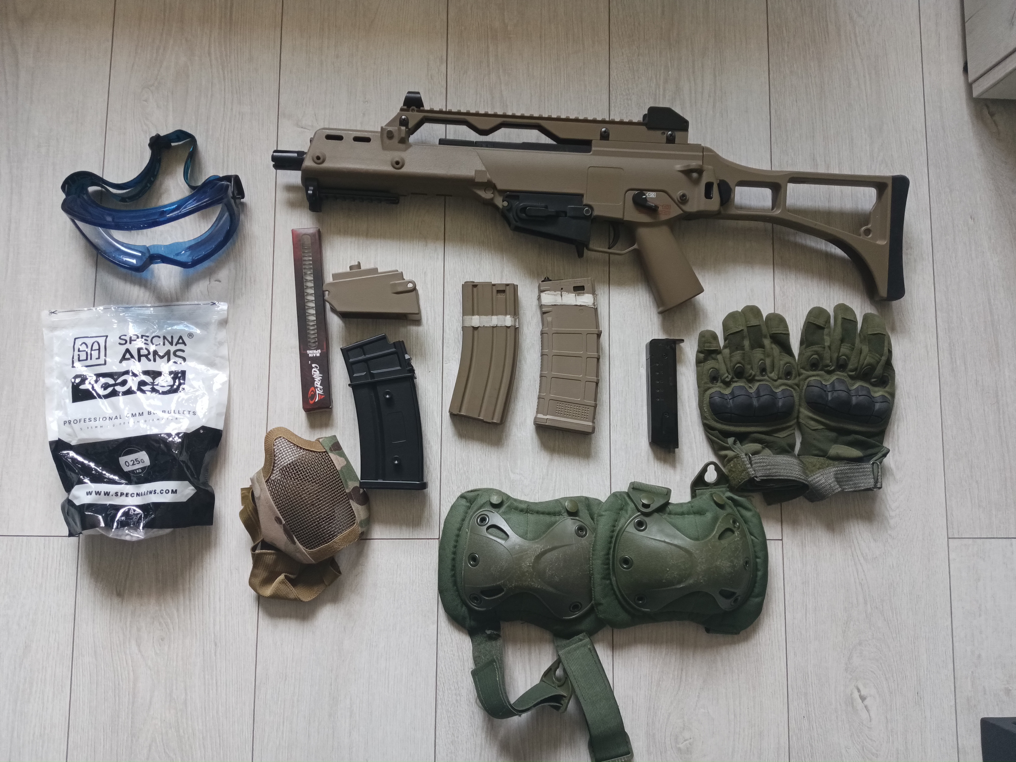 Sprzedam replikę JG G36 w zestawie z: - akumulatorem LiPo 1300mAh 7.4V - oryginalnym magazynkiem hi-cap - adapterem magazynka do M4 - 2 magazynkami do M4 (taśma na nich jest tylko oznaczeniem, działają dobrze i można ją zdjąć) - wymienną sprężyną Tornado M110 - ok. 2900 kulek 0,25 g ze specny - speedloaderem - goglami Bolle - rękawicami militarnymi z utwardzanymi wstawkami - maską typu stalker - nakolannikami Replika jest utrzymana w świetnym stanie, działa jak nowa, nic nie lata w środku, wymienianą miała tylko gumkę hop-up. Przebieg ok. 5000 kulek. Zestaw świetnie nadaje się na początek przygody z ASG. Po więcej szczegółów, proszę pisać. W razie zainteresowania częścią zestawu lub zestawem bez niektórych elementów, proszę śmiało pisać. Jestem otwarty na negocjacje