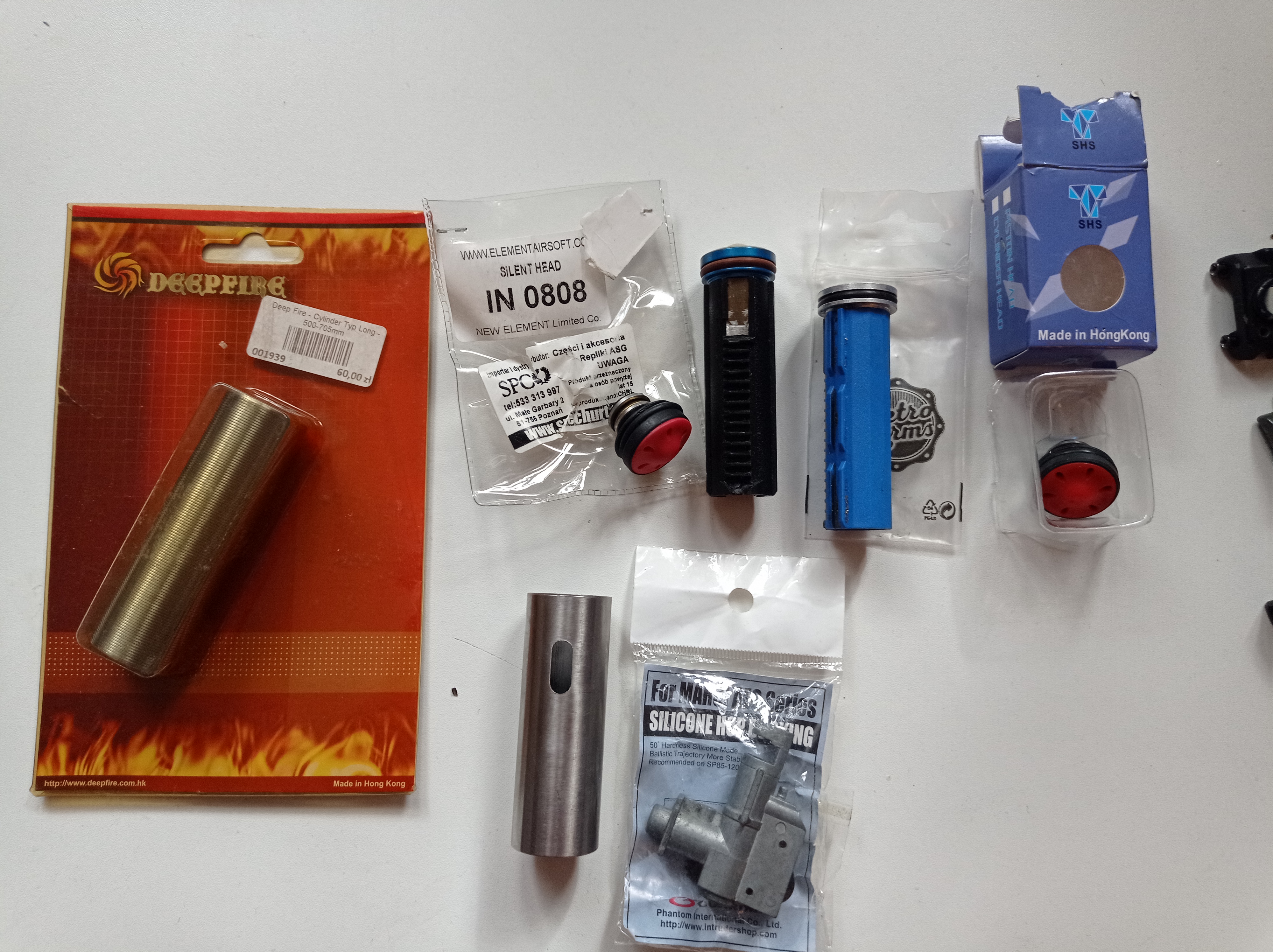 Sprzedam części : Cylinder deepfire długość 8cm - 20zł Cylinder krótki 7,2cm - 15zł Tłok z głowicą niebieska - 10zł Tłok z głowicą z grzybkiem - 15zł Głowica tłoka element airsoft - 15zł Głowica tłoka SHS - 15zł Komora hopup m4 Guarder - 20zł Łożyska kulkowe RetroArms - 9mm - (1op-6szt.) -40zł Części z mp5 -całość 20zł Większe ilości zniżka, priv