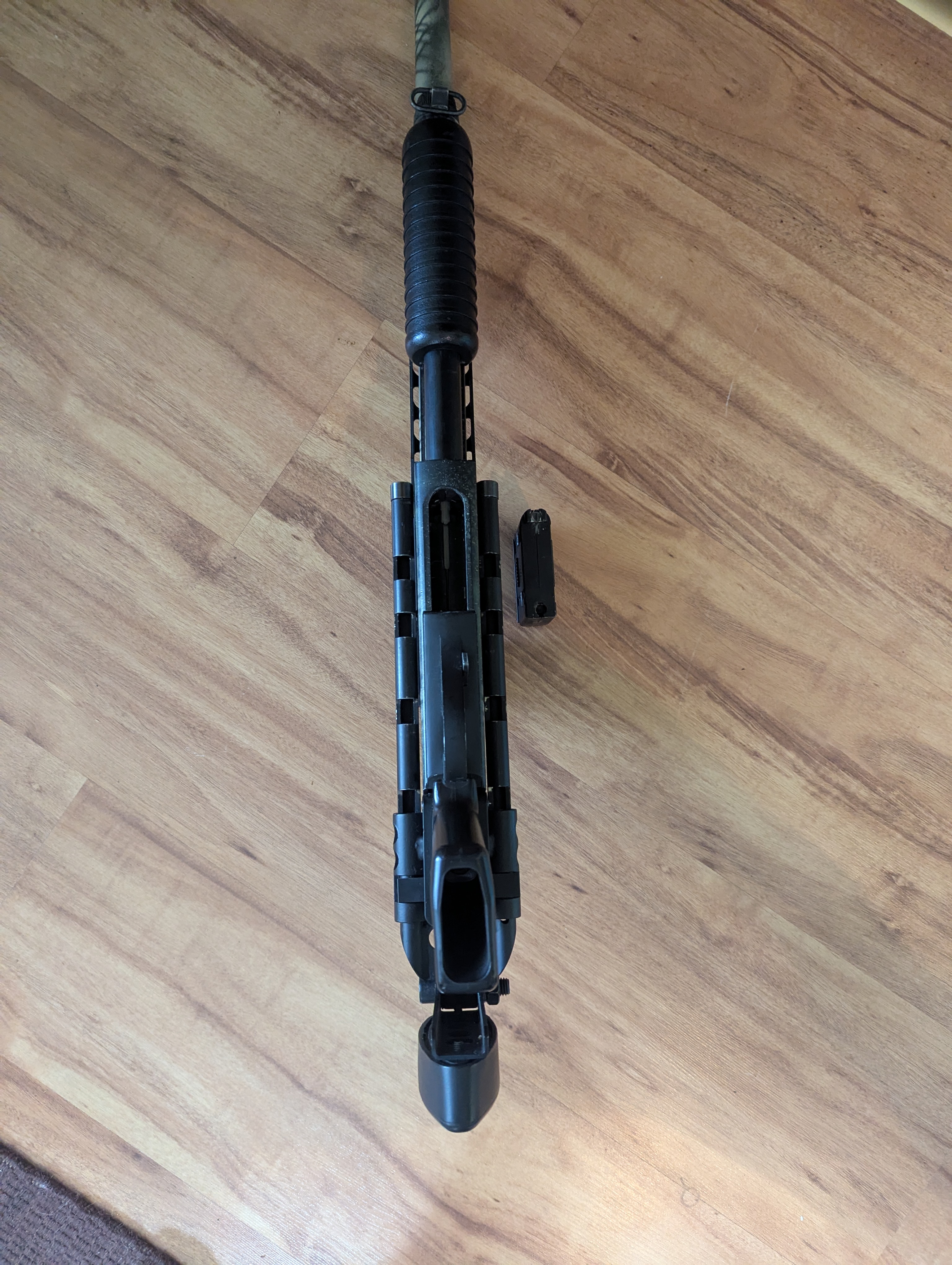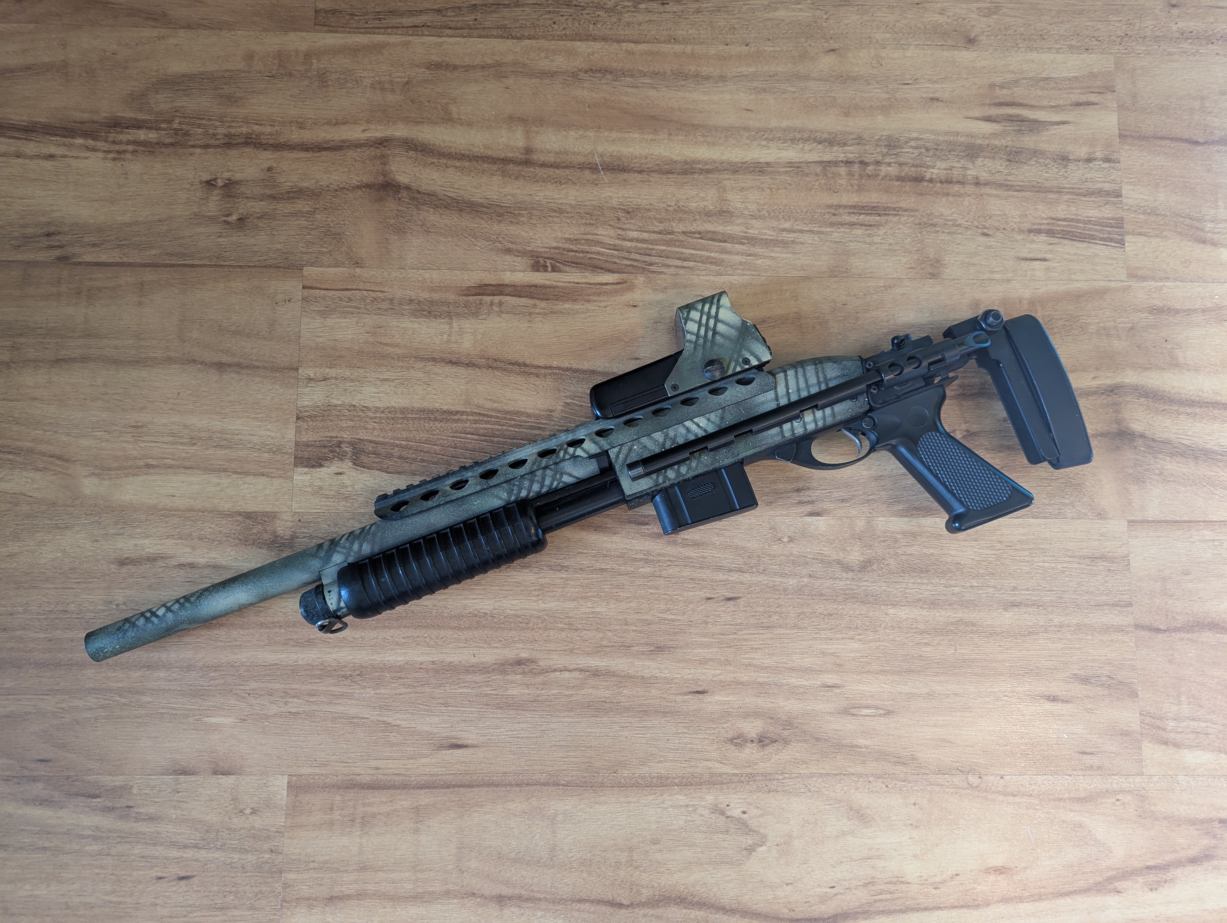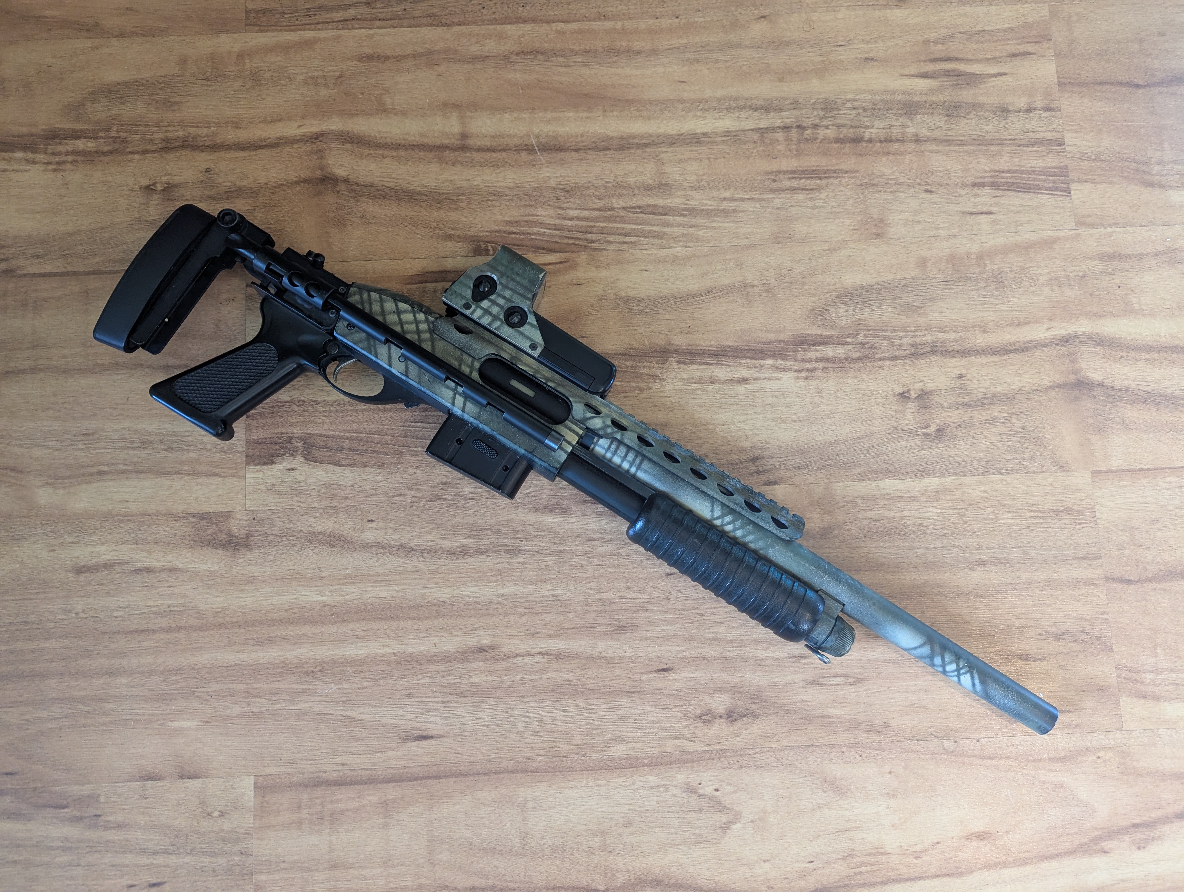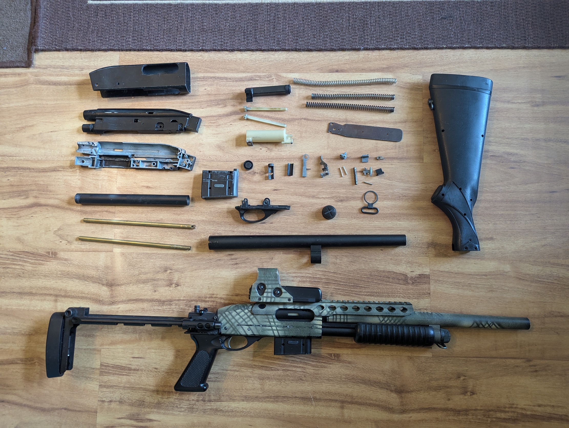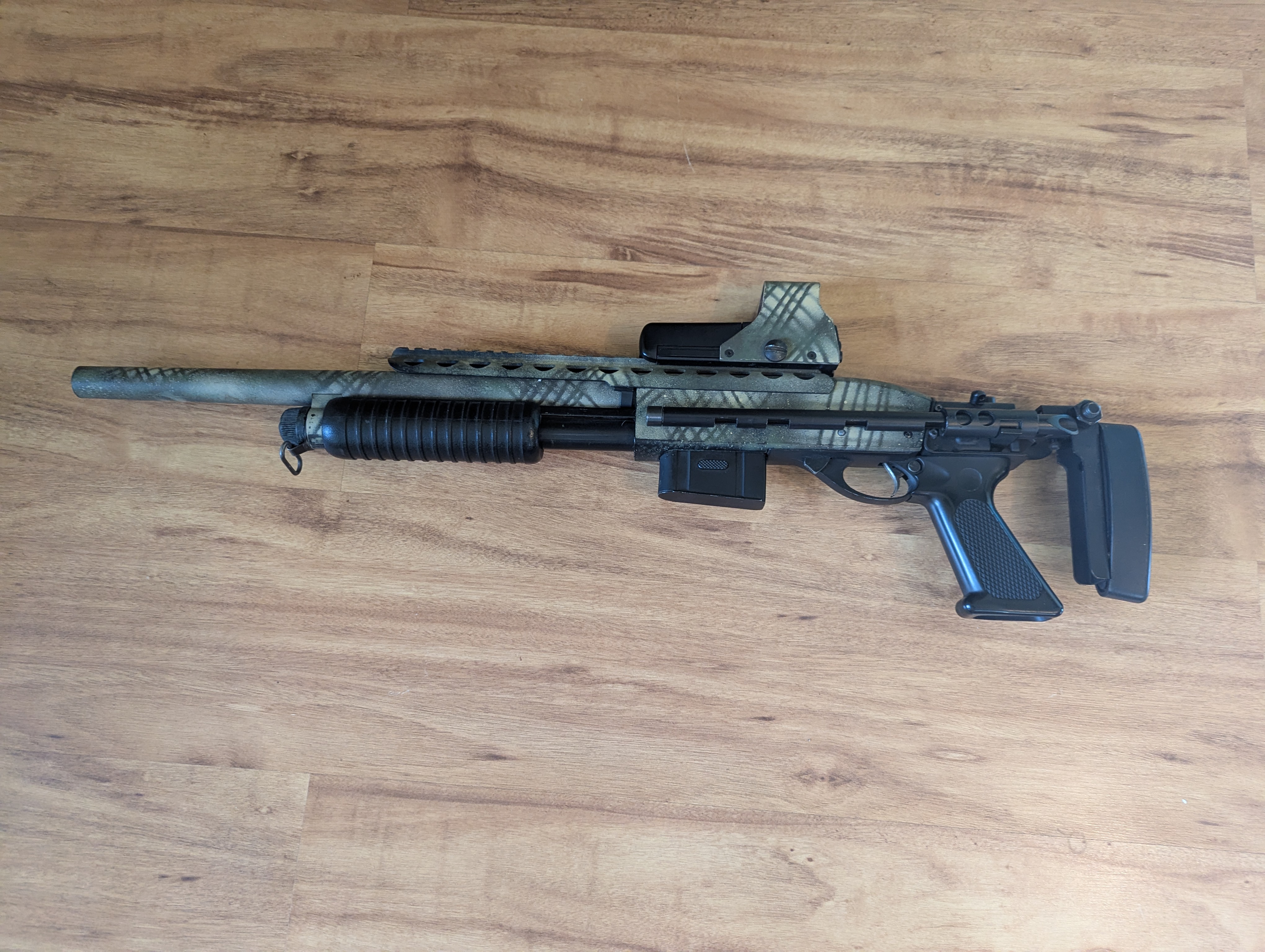 Na sprzedaż shotgun M870, replika broni na kulki z kolimatorem. Replika ciężka, metalowa, sprawia wrażenie prawdziwej broni. Replika jest metalowa, posiada rozkładaną kolbę. 5 lat teemu dostarczała mi niesamowitą frajdę oraz przyciągała uwagę na strzelankach. Posiada podrasowaną lufę (nie pamiętam już danych, ale ma wysokie osiągi) oraz system hop-up. Prawdopodobnie cylinder z tłokiem też jest wymieniony na lepszej jakości - ale tego już nie jestem pewien, a nie chce mi się rozbierać. Strzela daleko i celnie Strzelba od 5 lat nieużywana, po wyciągnięciu z szafy nadal przeładowuje i strzela, nie mam obecnie kulek aby sprawdzić jak celnie ;) Kolimator metalowy, gdy ostatnio używałem był sprawny i celny, obecnie nie ma baterii, nie wiem czy działa. Bogaty zestaw: - druga taka sama strzelba M870 (posiada inną kolbę) w częściach. Nie pamiętam już czy to są wszystkie części, być może można złożyć z nich drugi kompletny zestaw, jeśli nie posłuży jako baza części zamiennych ;) - 3 dodatkowe sprężyny o różnej mocy - 2 zapasowe lufy Całość pomalowana kiedyś przeze mnie farbami maskującymi. Sprzedaję cały zestaw jak na zdjęciu nr 1 w niskiej cenie, polecam, sam kolimator był wart 300zł ;)