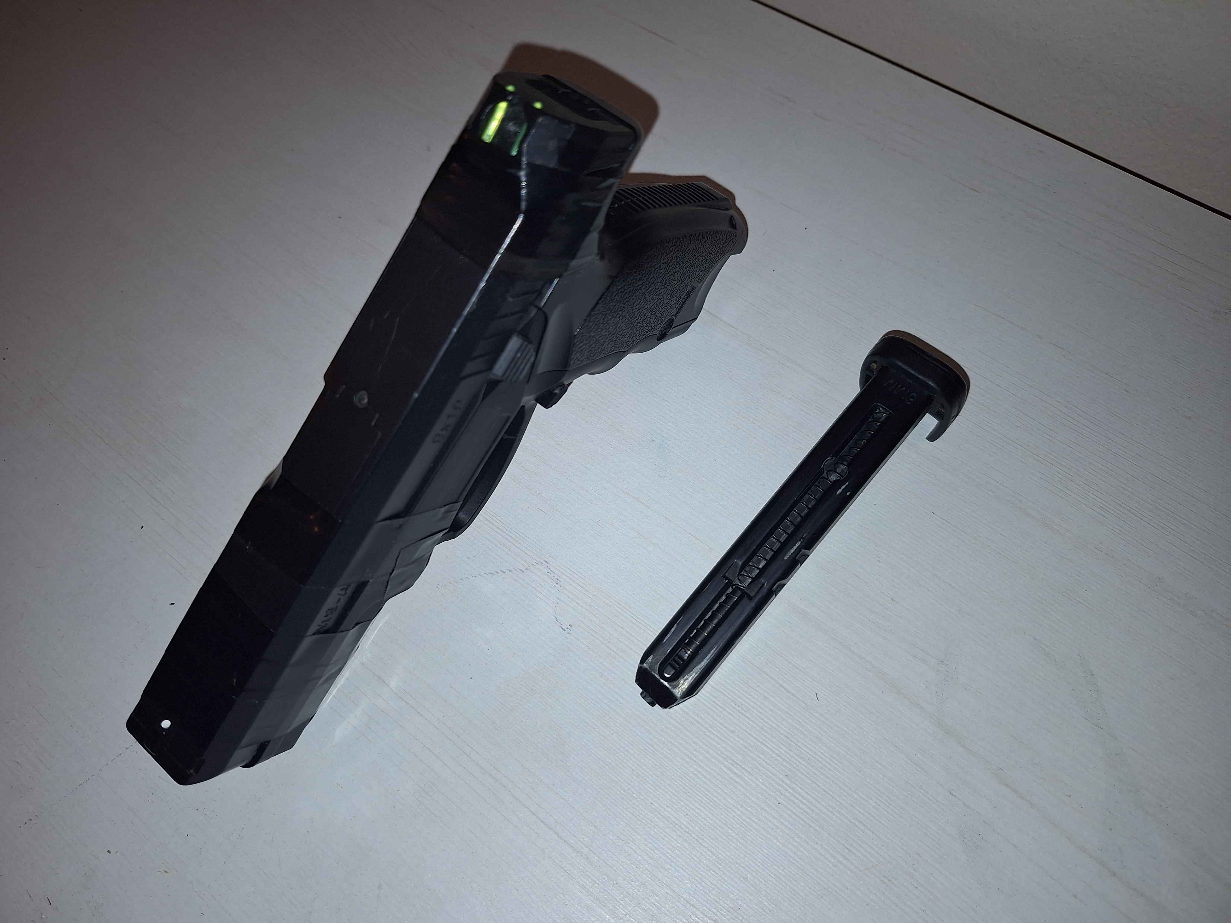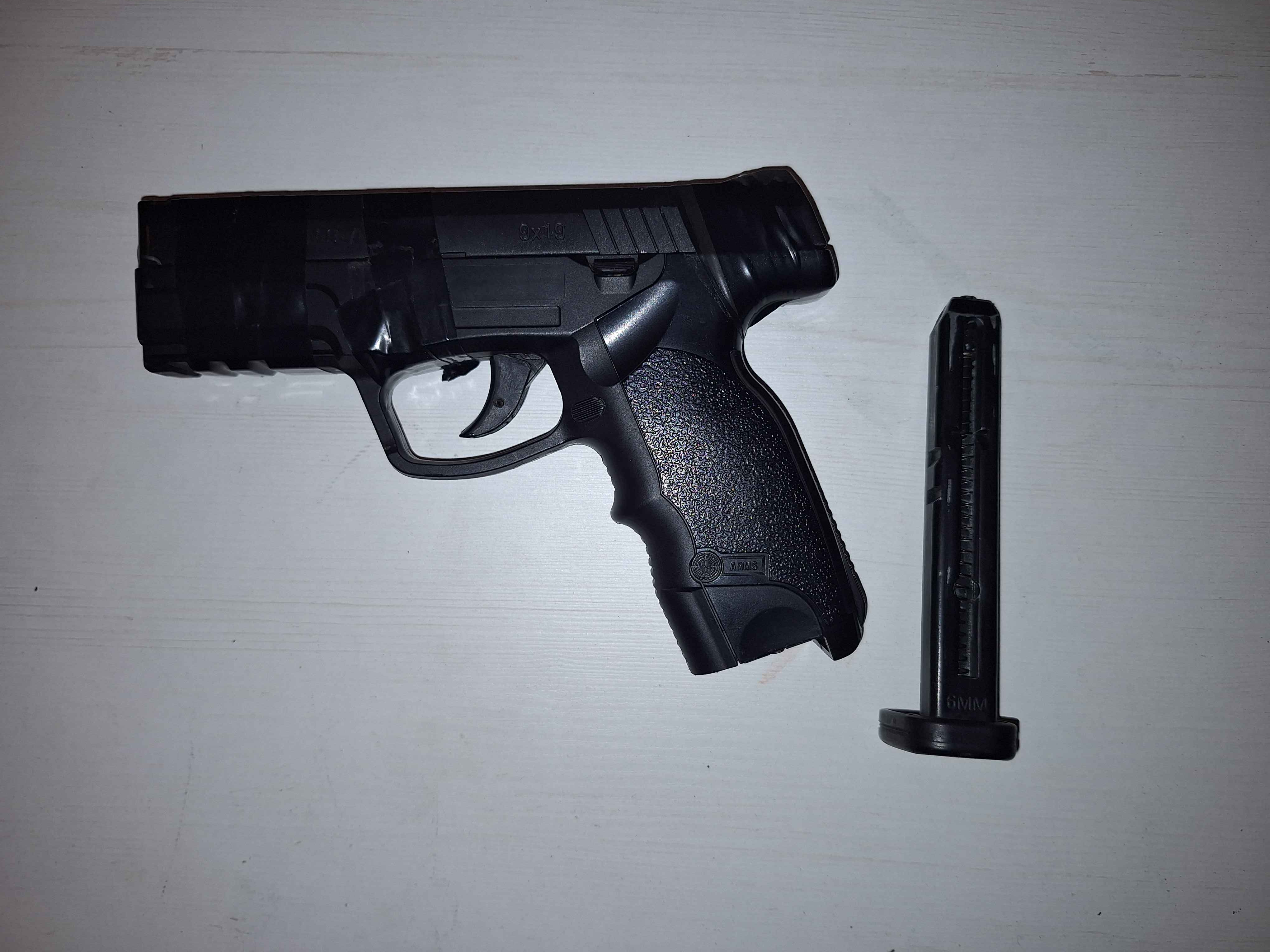 [USZKODZONA] Sprzedaje replikę na części, może komuś się przyda. Uszkodzona jest igła do przebijania nabojów CO2 oraz pokrywa zamku, dla tego jest taśma, by nie odpadała. Cała reszta wydaje się okej. Mogę sprzedać osobno magazynek.