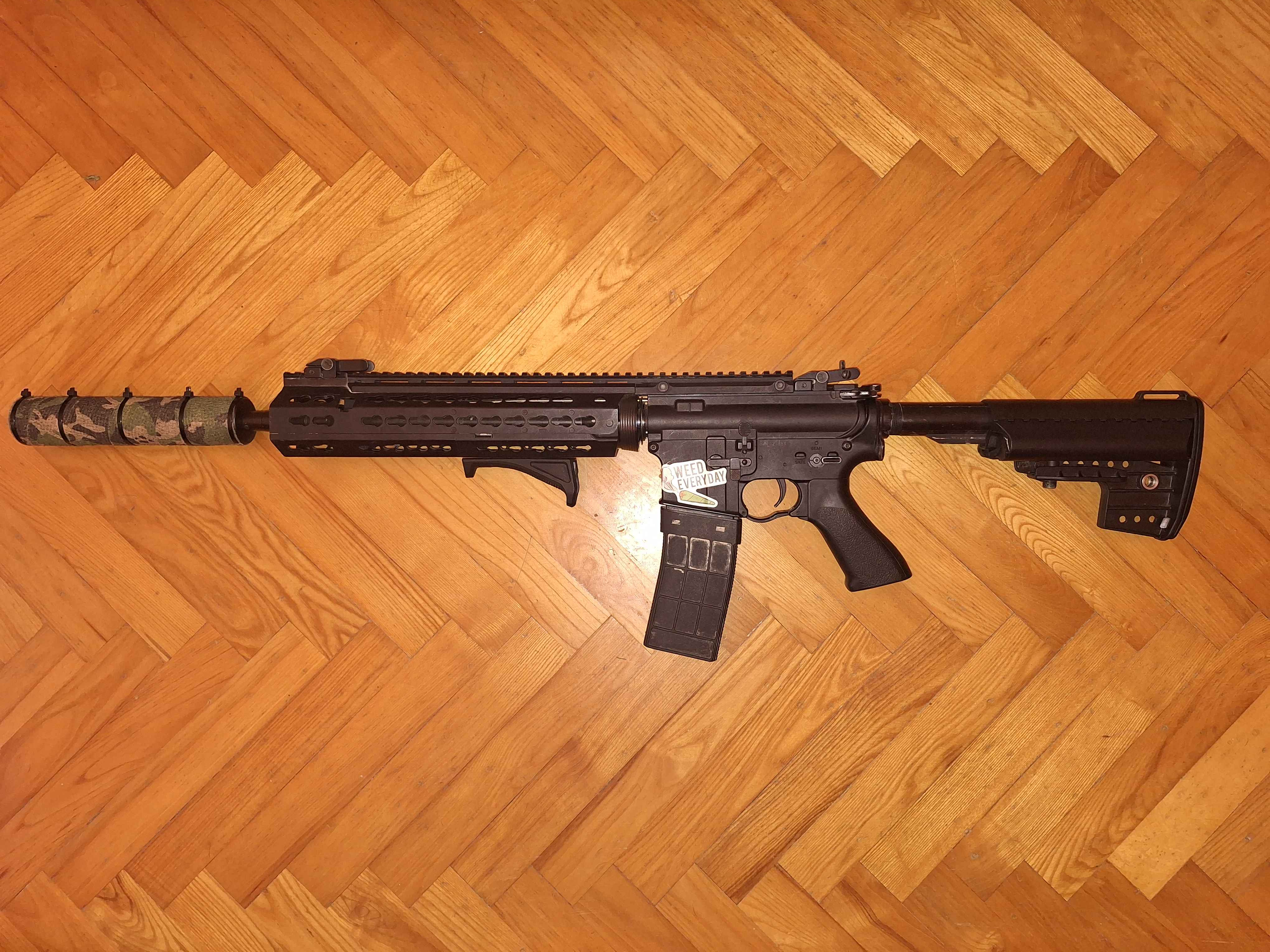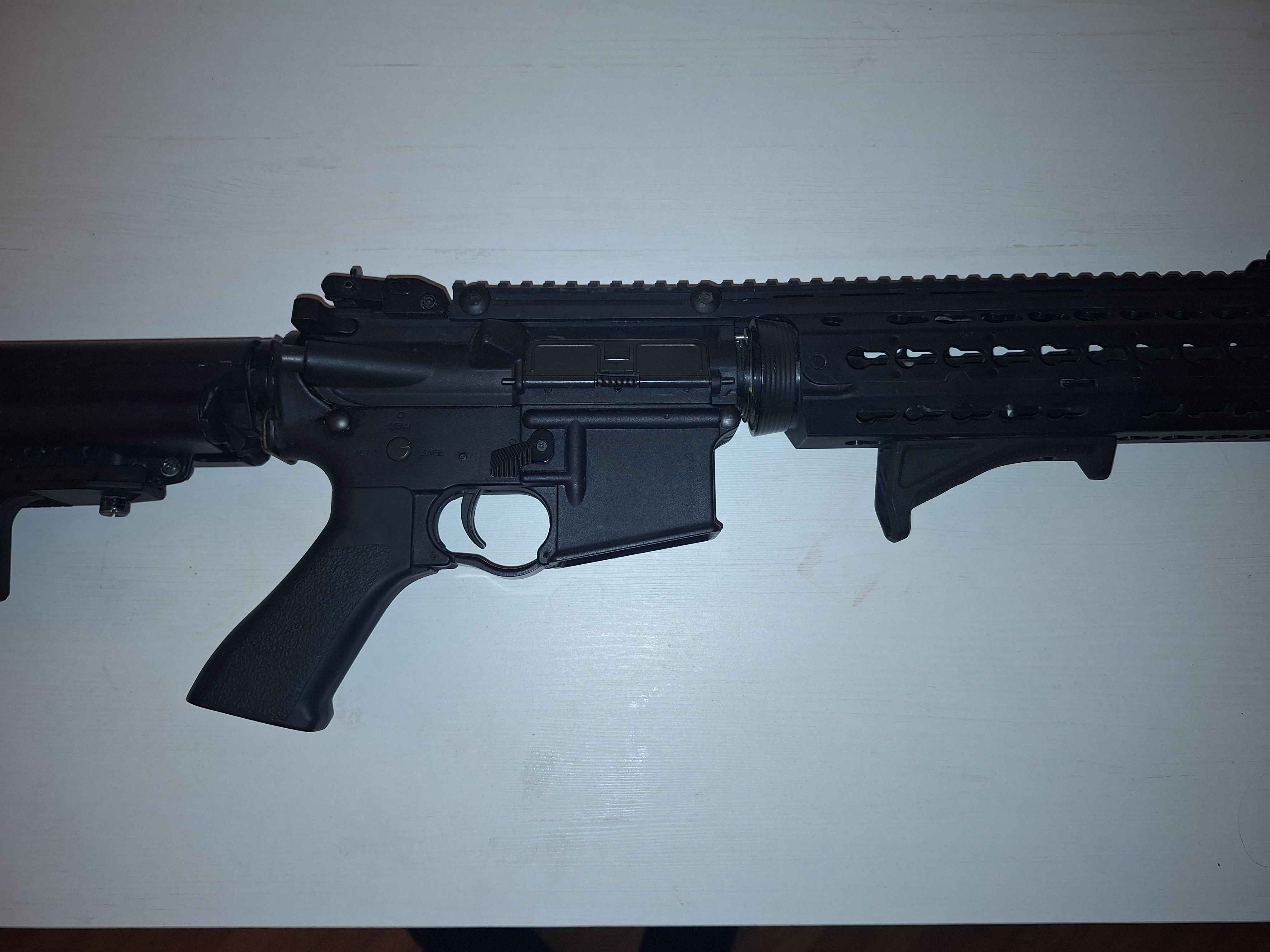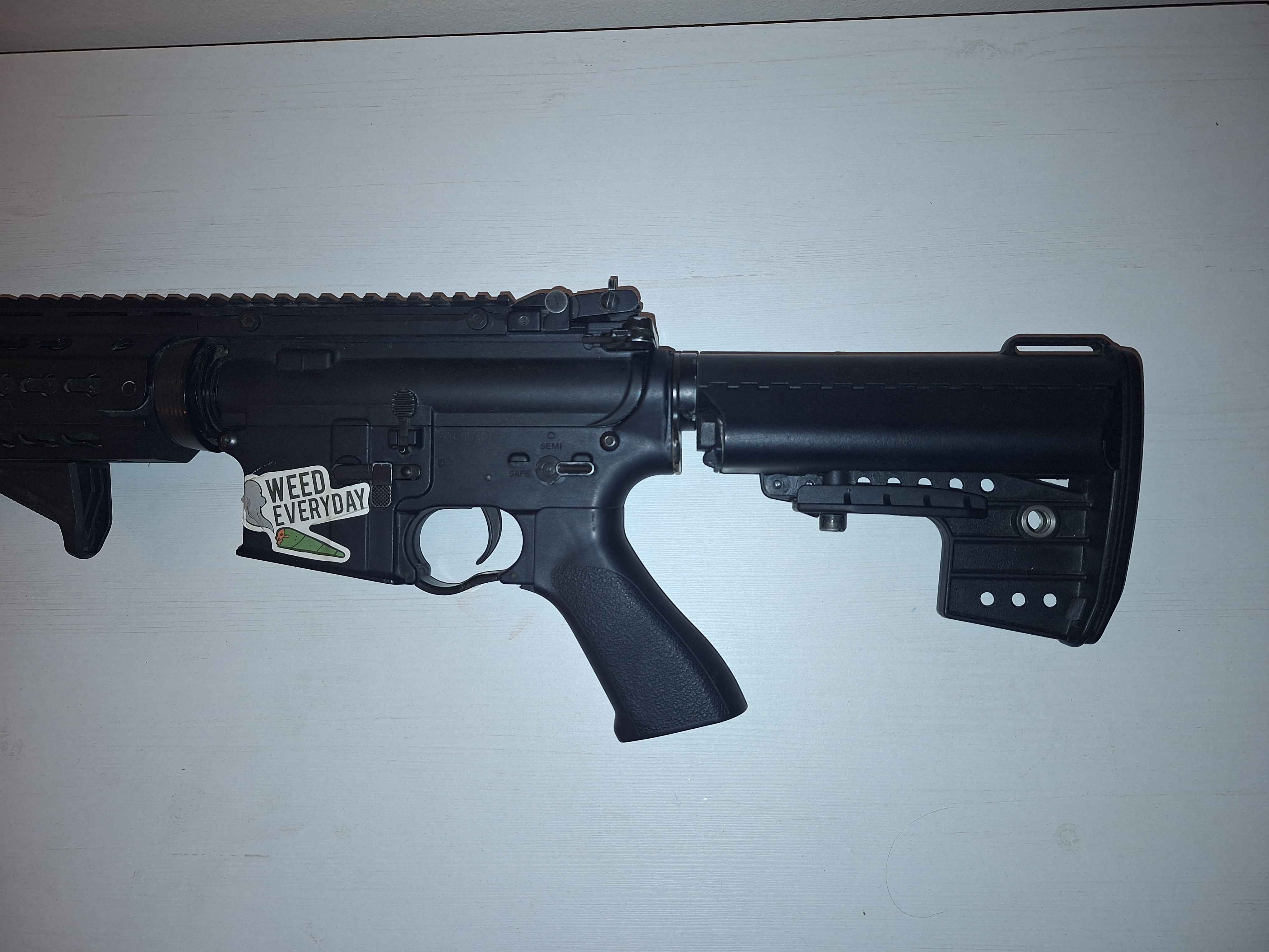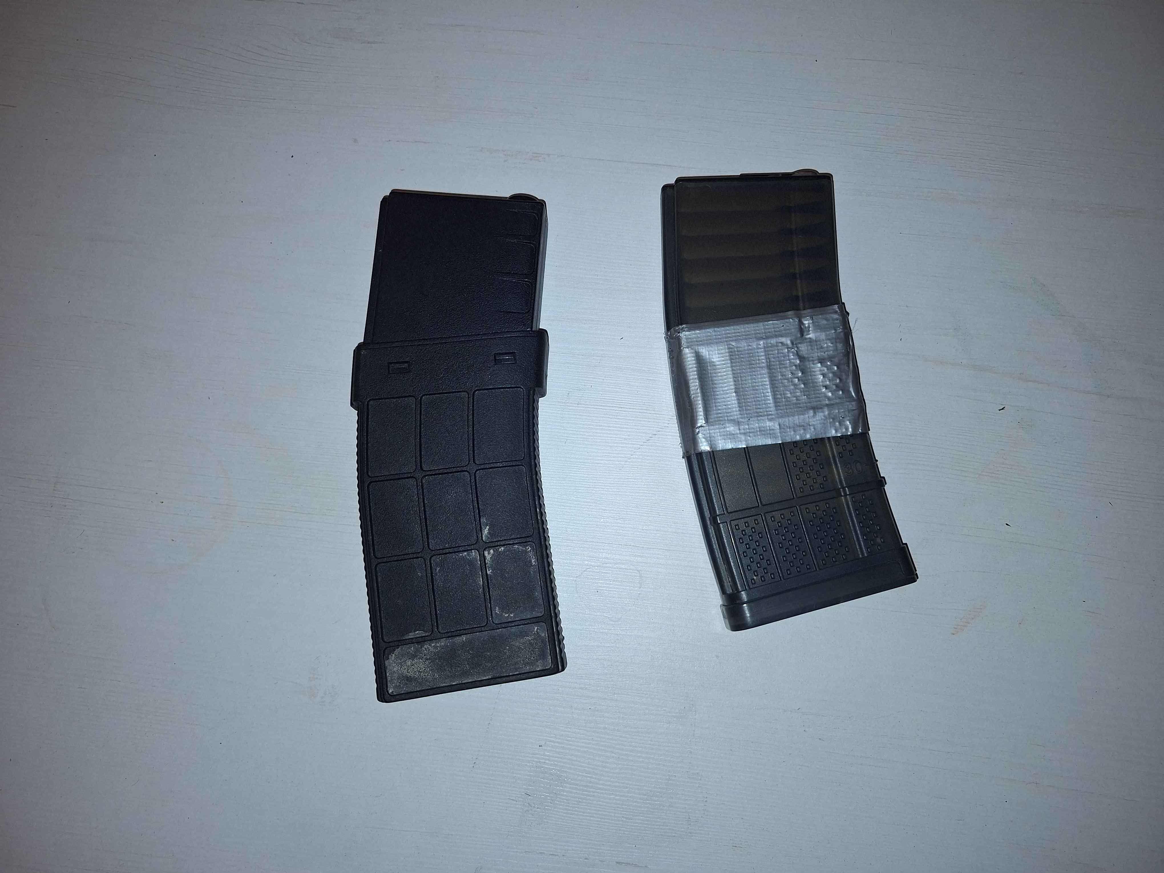 Sprzedaję replikę używaną ok. 14 strzelanek. Wszystko sprawne, replika zaskakująco celna, każda kulka leci idealnie w miejsce, gdzie poprzednia. Jedyny problem to zepsuta gumka hop-up. Replikę sprzedaję w zestawie z magazynkiem hi-cap, magazynkiem mid-cap, uchwytem, baterią 1600 mAh 8.4V, tłumikiem oraz oryginalnym pudełkiem. Możliwa wysyłka kurierem za opłatą.