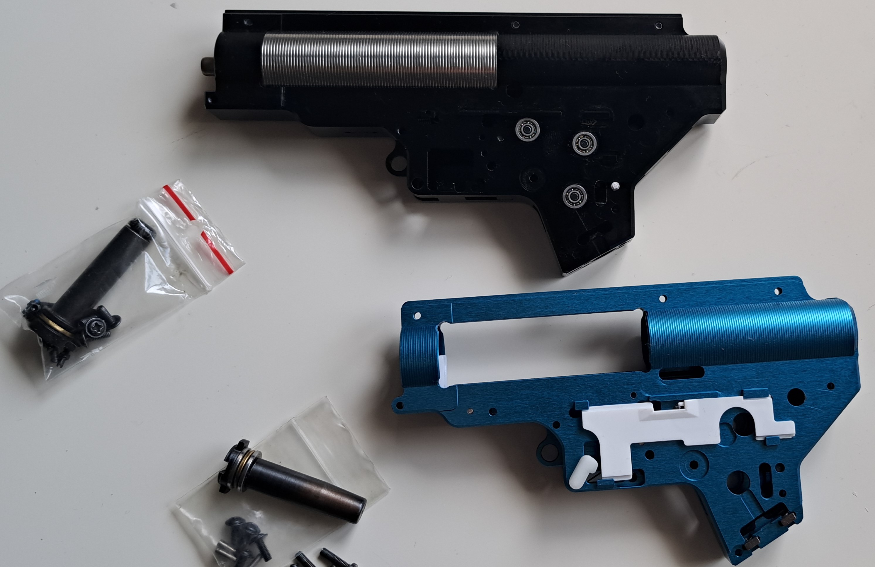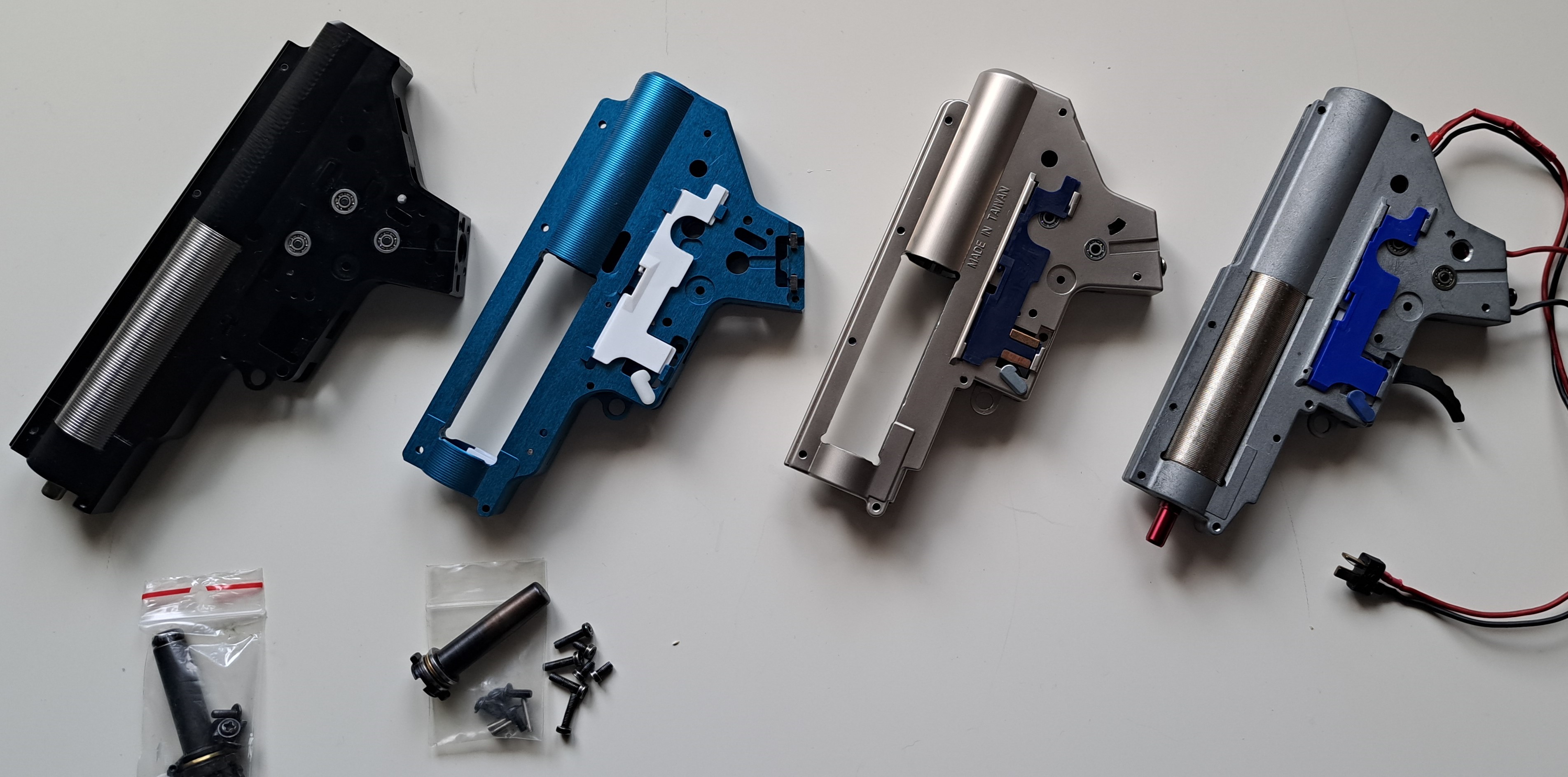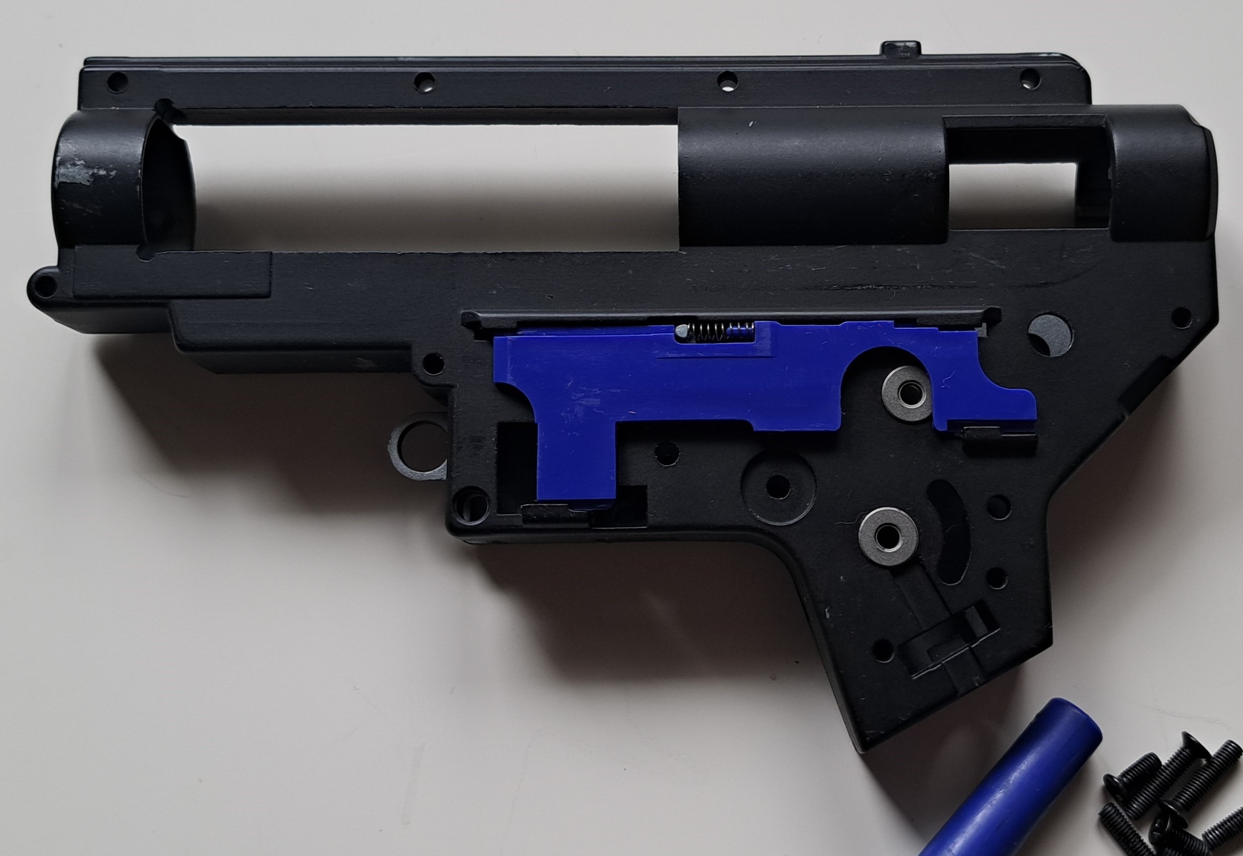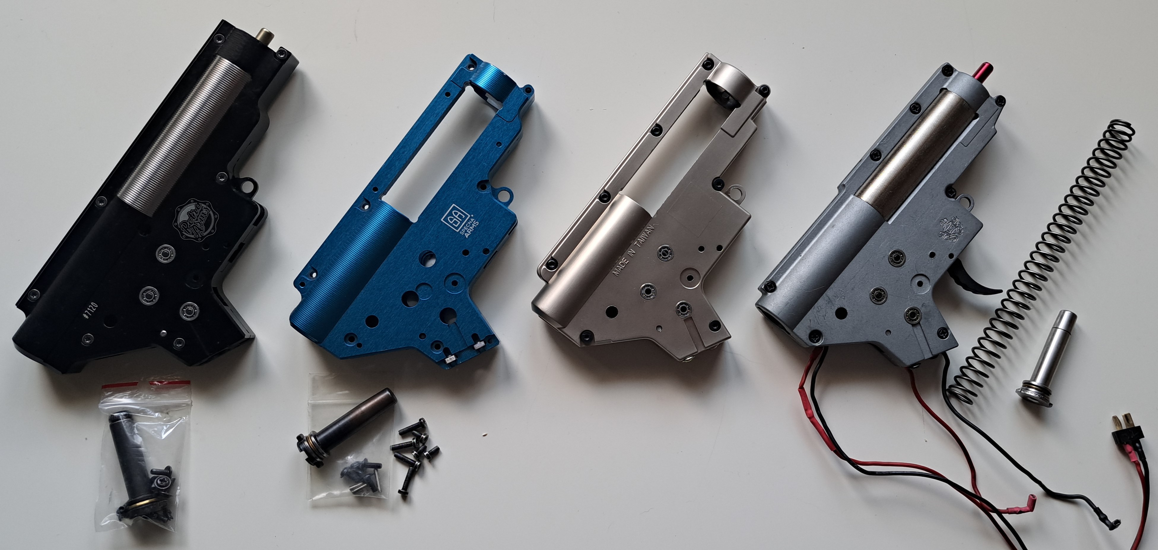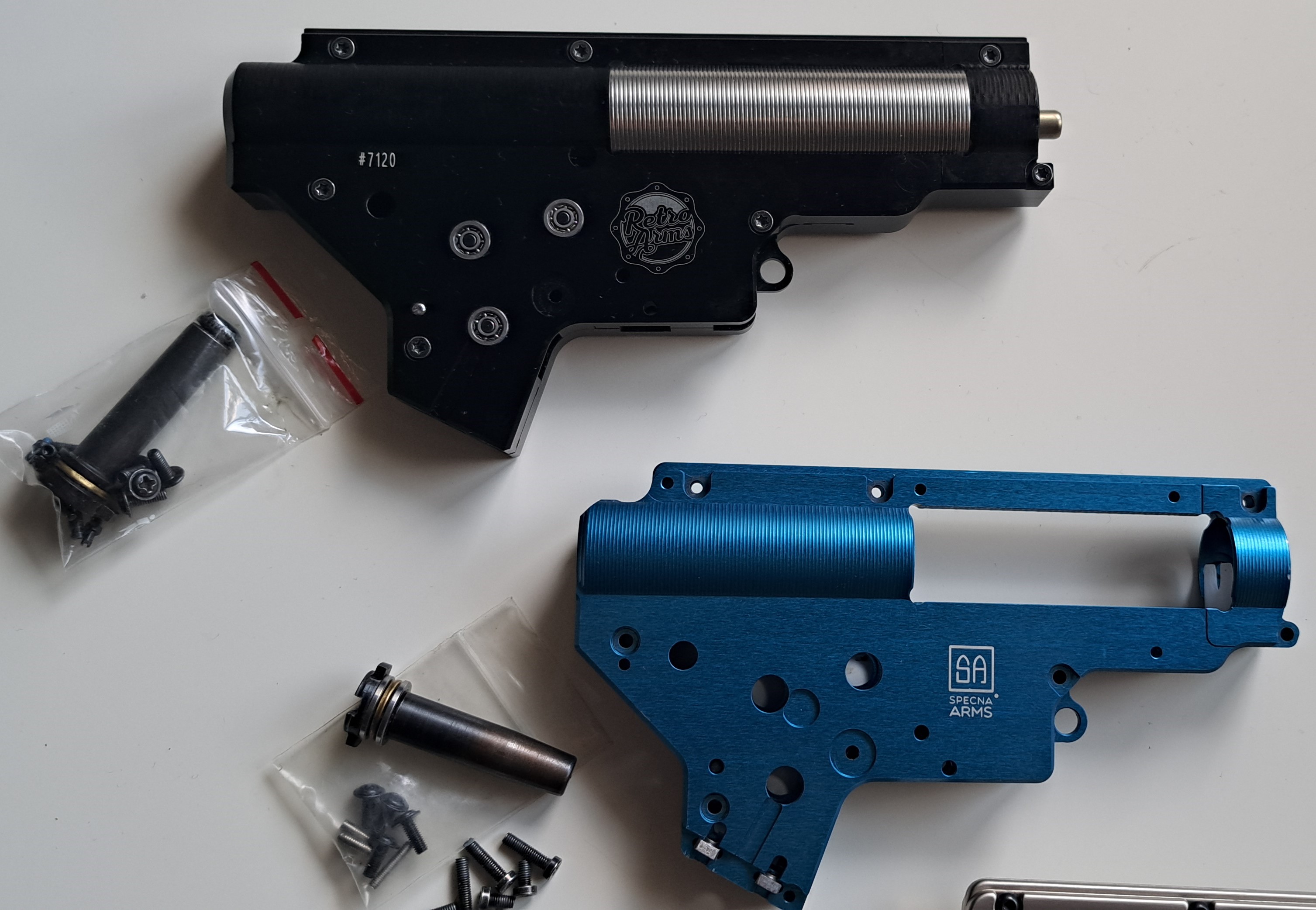 Pytania proszę w sms na nr. 787-614-881 Witam na sprzedaż idą szkielety gearboxów v2 i v2long [Mancraft x SpecnaArms] - niebieski gearbox CNC z QSR wyposażony w listwę dosyłacza LCT , antyreversalem LCT , mechaniczną blokadę spustu LCT , selektor ognia Retro Arms z naklejką do Peruna Hybrid v2 /do tego elementy do centrowania gearboxa 430,- Lonex - błyszczący srebrny CNC gearbox bez QSR wyposażony w listwe dosyłacza Lonex , Łożyska 8mm kulkowe Lonex , Listwa selektora z blaszką miedzianą Lonex , Łożyskowana prowadnica sprężyny GŁ. ACM , mechaniczną metalową blokadę spustu ACM 230,- Kompletny Gearbox v2 LCT z G3 pasujący do M4 - Perun Hybrid okablowanie to tyłu , Łożyska 8mm kulkowe LCT , Cylinder Typ.0 żebrowany LCT , Tłok z 14 metalowymi zębami SHS , Łożyskowana głowica tłoka SpecnaArms , Głowica cylindra SpecnaArms , listwa dosyłacza SHS , zębatki z wewnętrzynmi łożyskami 18:1 Big dragon , dysza 21,40 z oringiem ACM , Łożyskowana prowadnica sprężyny Lonex /Z lufą 509mm 6.02 z kulkami 0.3 osiąga 1.75j 355fps na ustawionym HopUP 60% 400,- Retro Arms - Czarny CNC gearbox v2 LONG z QSR Łożyskowana prowadnica sprężyny GŁ. Retro Arms , Listwa dosyłacza biała Retro Arms , Cylinder długi Typ.0 EPES , Głowica tłoka łożyskowana EPES , Głowica cylindra Mk.II V2/3 - 70sh long EPES , Dysza z dwoma o-ringami 24,00 EPES , Tłok z 18 stalowymi zębami ARMY Zębatki CNC wypodkładkowane standardowe 18:1 sr25 SHS / Do tego jakieś elementy które dostalem od retroamrs nwm do czego są... 530,- Czarny Gearbox SpecnaArms z QSR , prowadnicą sprężyny , listwą selektora , przerywaczem , lozyskami ślizgowymi 8mm , listwą dosylacza 45,- Szary Gearbox CYMA gen.1 BEZ QSR 30,- Wszystkie sprawne nie uszkodzone wysylka 17,- Pobranie tylko z kwotą zabezpieczającą 70zl Możliwy odbiór w Iławie