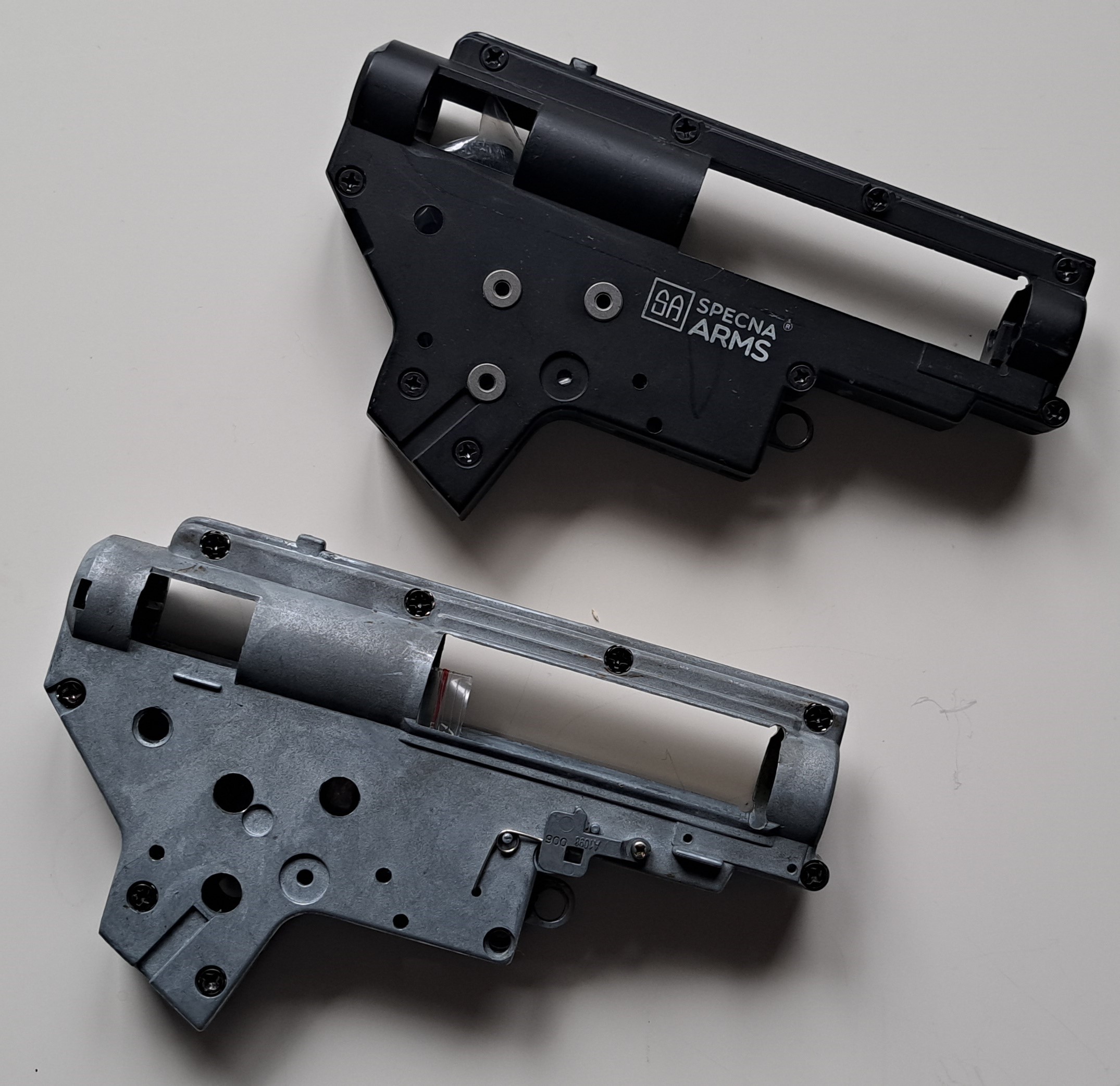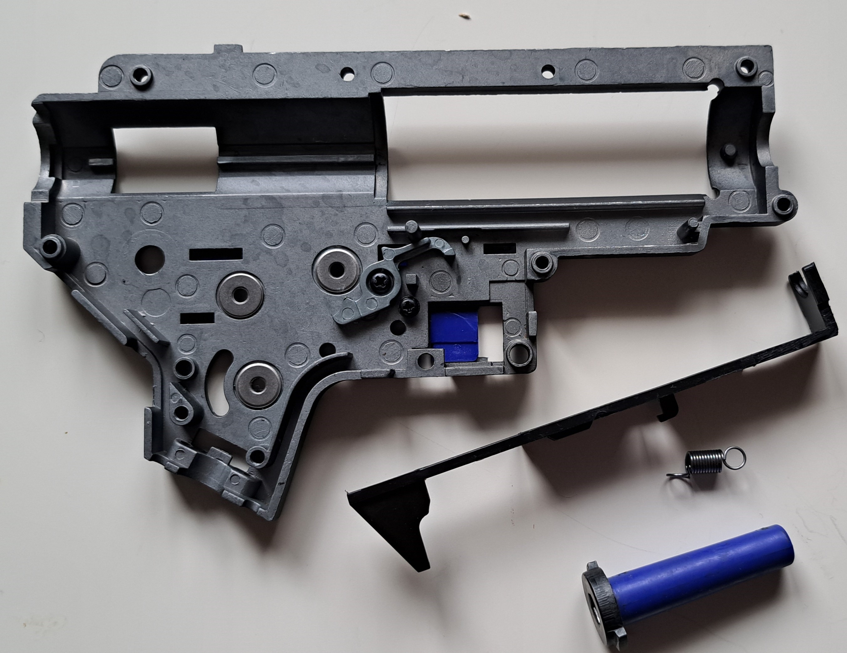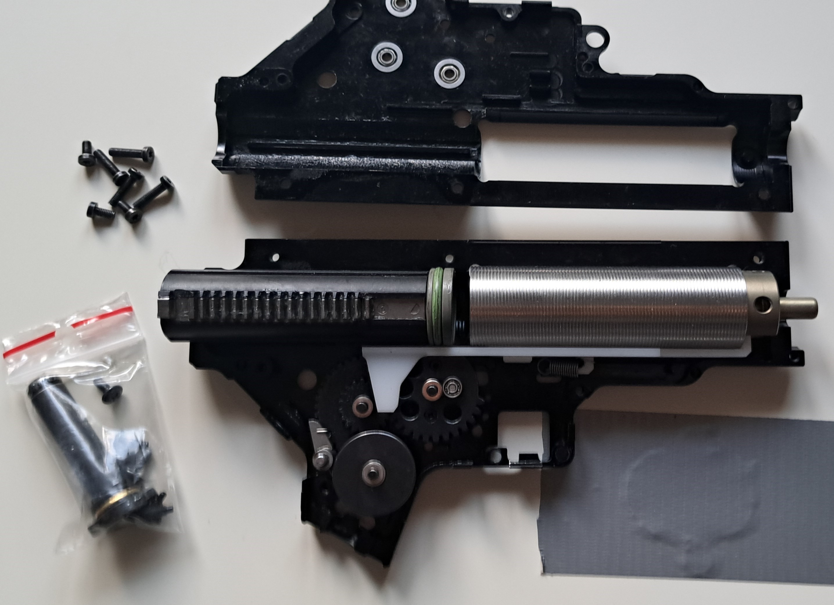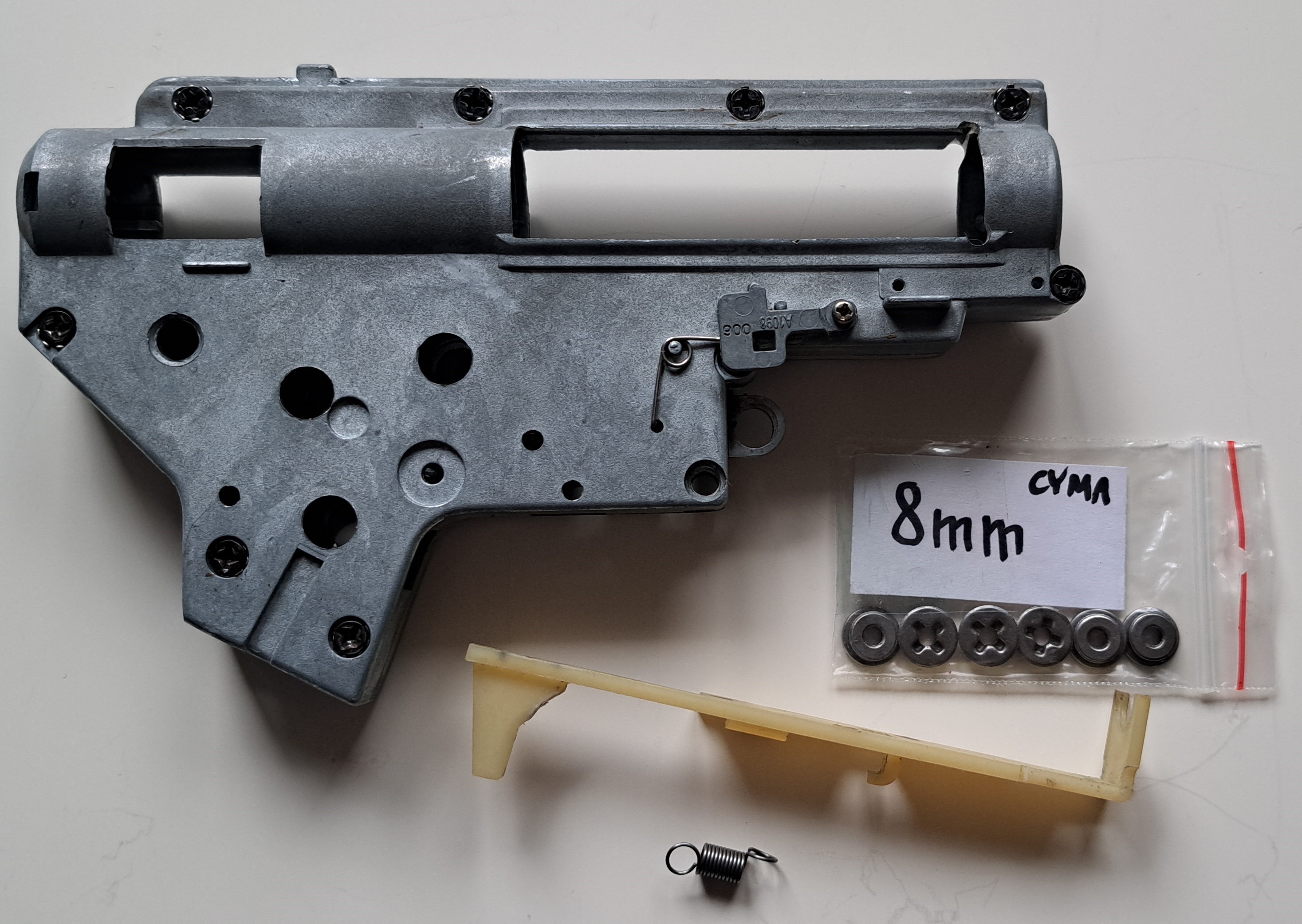 Pytania proszę w sms na nr. 787-614-881 Witam na sprzedaż idą szkielety gearboxów v2 i v2long [Mancraft x SpecnaArms] - niebieski gearbox CNC z QSR wyposażony w listwę dosyłacza LCT , antyreversalem LCT , mechaniczną blokadę spustu LCT , selektor ognia Retro Arms z naklejką do Peruna Hybrid v2 /do tego elementy do centrowania gearboxa 430,- Lonex - błyszczący srebrny CNC gearbox bez QSR wyposażony w listwe dosyłacza Lonex , Łożyska 8mm kulkowe Lonex , Listwa selektora z blaszką miedzianą Lonex , Łożyskowana prowadnica sprężyny GŁ. ACM , mechaniczną metalową blokadę spustu ACM 230,- Kompletny Gearbox v2 LCT z G3 pasujący do M4 - Perun Hybrid okablowanie to tyłu , Łożyska 8mm kulkowe LCT , Cylinder Typ.0 żebrowany LCT , Tłok z 14 metalowymi zębami SHS , Łożyskowana głowica tłoka SpecnaArms , Głowica cylindra SpecnaArms , listwa dosyłacza SHS , zębatki z wewnętrzynmi łożyskami 18:1 Big dragon , dysza 21,40 z oringiem ACM , Łożyskowana prowadnica sprężyny Lonex /Z lufą 509mm 6.02 z kulkami 0.3 osiąga 1.75j 355fps na ustawionym HopUP 60% 400,- Retro Arms - Czarny CNC gearbox v2 LONG z QSR Łożyskowana prowadnica sprężyny GŁ. Retro Arms , Listwa dosyłacza biała Retro Arms , Cylinder długi Typ.0 EPES , Głowica tłoka łożyskowana EPES , Głowica cylindra Mk.II V2/3 - 70sh long EPES , Dysza z dwoma o-ringami 24,00 EPES , Tłok z 18 stalowymi zębami ARMY Zębatki CNC wypodkładkowane standardowe 18:1 sr25 SHS / Do tego jakieś elementy które dostalem od retroamrs nwm do czego są... 530,- Czarny Gearbox SpecnaArms z QSR , prowadnicą sprężyny , listwą selektora , przerywaczem , lozyskami ślizgowymi 8mm , listwą dosylacza 45,- Szary Gearbox CYMA gen.1 BEZ QSR 30,- Wszystkie sprawne nie uszkodzone wysylka 17,- Pobranie tylko z kwotą zabezpieczającą 70zl Możliwy odbiór w Iławie