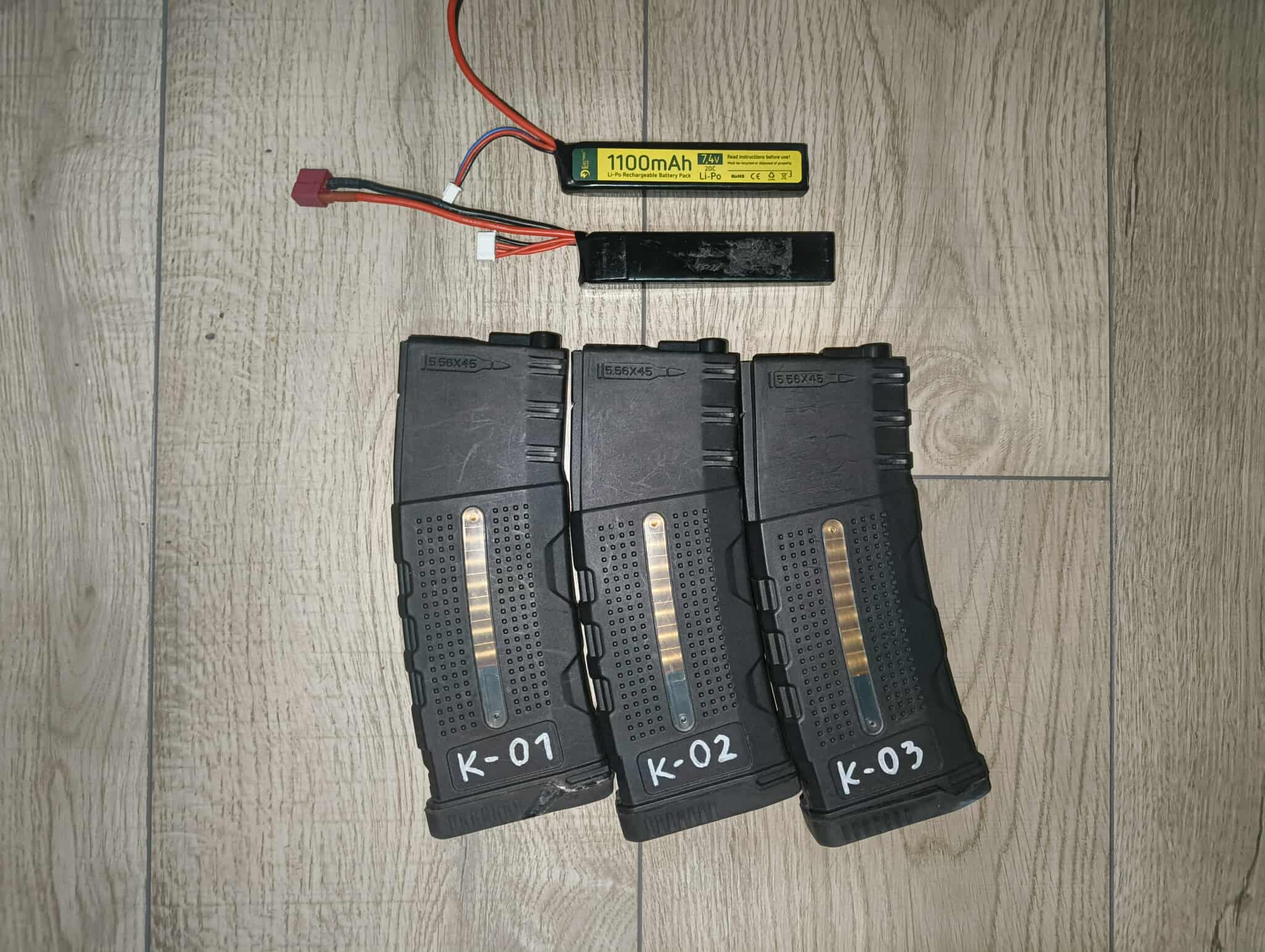 Witam! Na sprzedaż zestaw zawierający - Replikę M904E - w pełni stock, gearbox nieotwierany, stan bdb. - 3 mid-capy polimerowe BattleAxe oraz oryginalny metalowy high-cap, feedują bez problemu. - Akumulator 11.1v 1100mAh 15/30C - Chwyt na M-LOK oraz tłumik z wygłuszająca pianką. Zestaw sprzedaję z powodu braku czasu, i straty zainteresowania hobby:) Zdecydowanie wolałbym sprzedać zestaw w całości, ale możemy się dogadać. Cena do lekkiej nego, wysyłka DPD za pobraniem lub odbiór osobisty. Za dodatkowe 6 dyszek dorzucam drugi akumulator (7.4v 1100mAh), i prawie pełną paczkę kulek 0.28